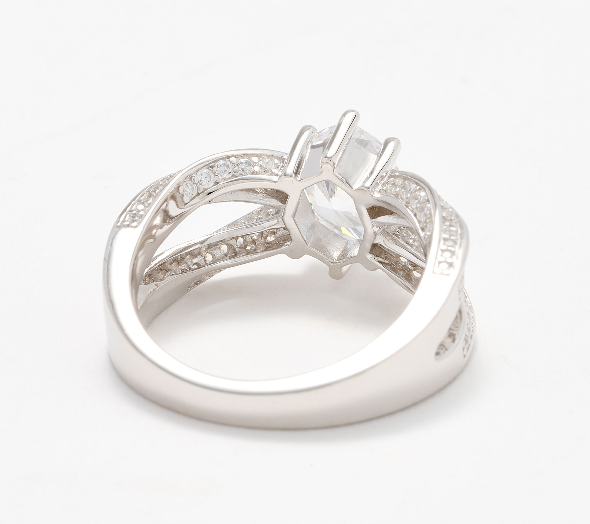 Grand Sancy-cut and round Diamonique simulated diamonds on twisted split-shank design