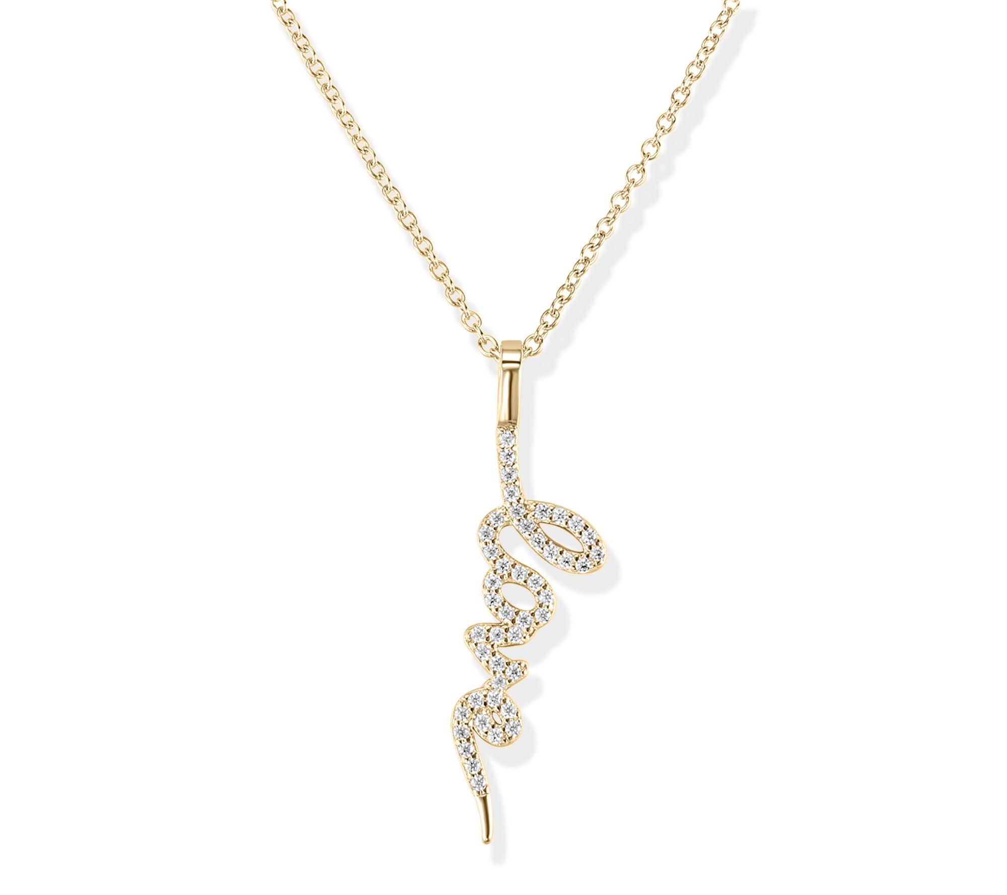 - Pendant with "love" script pave set in round Diamonique simulated diamonds; cable link chain