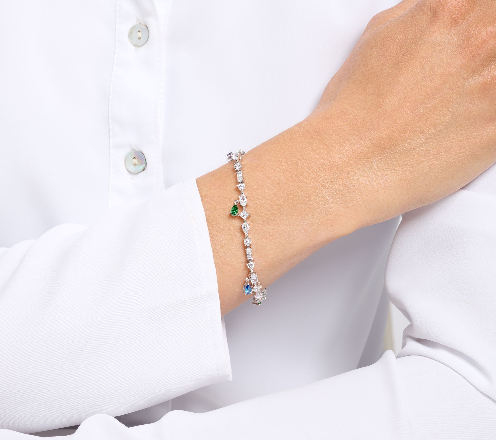 Looking for a whimsical way to show off your sparkling personality? This Diamonique x Kathy Levine bracelet makes for memorable moments. with an eye-catching combination of multi-shaped cubic zirconia Diamonique simulated diamonds and delightful pear-shaped dangles.