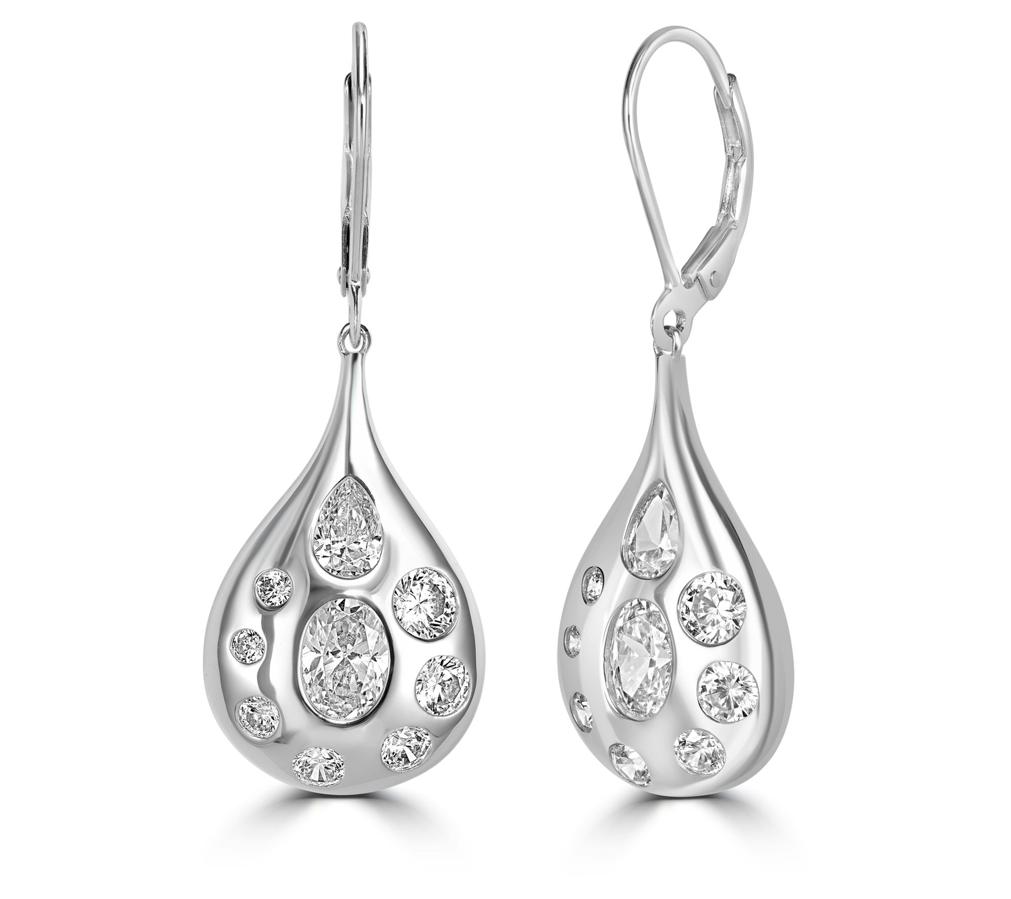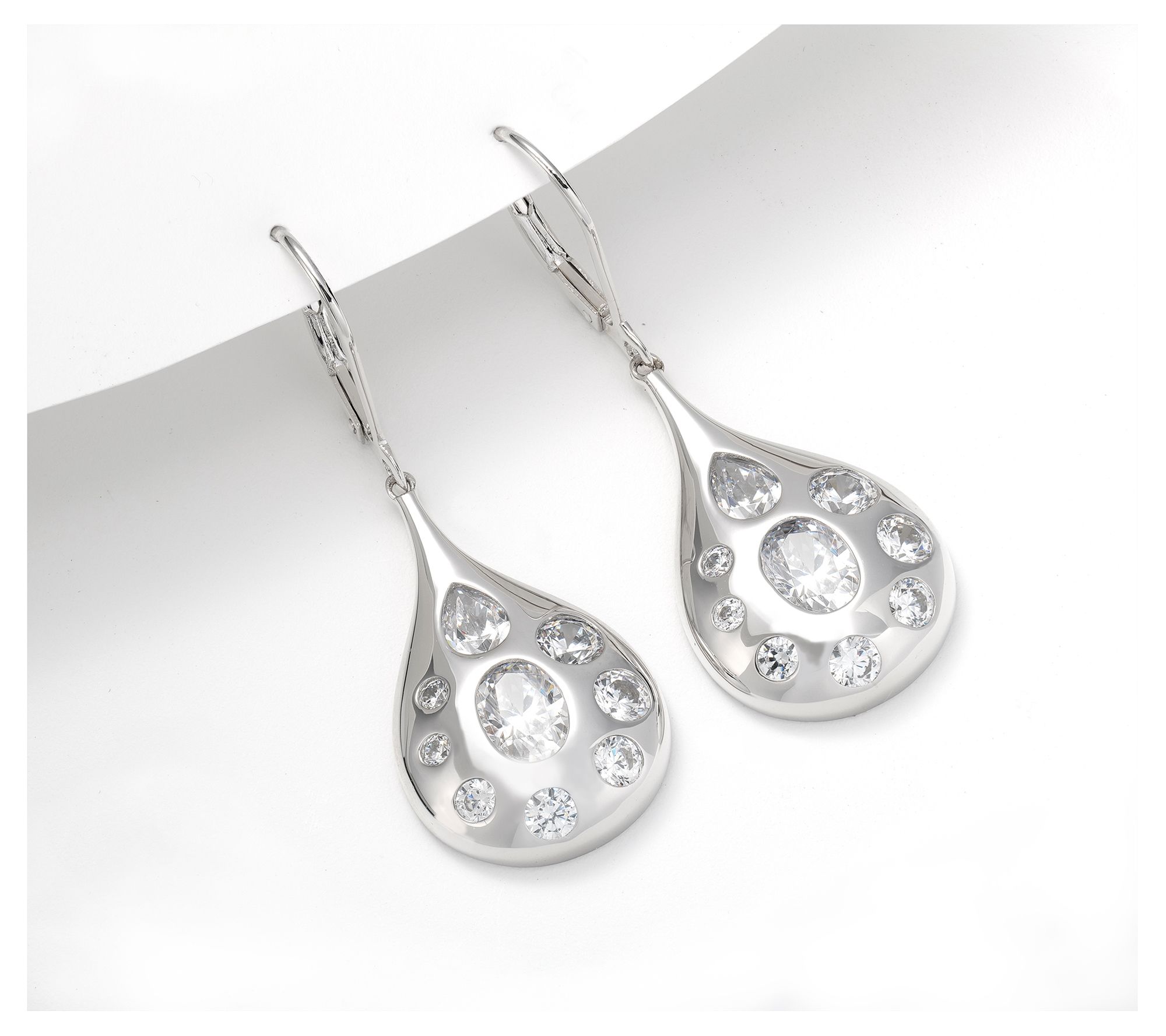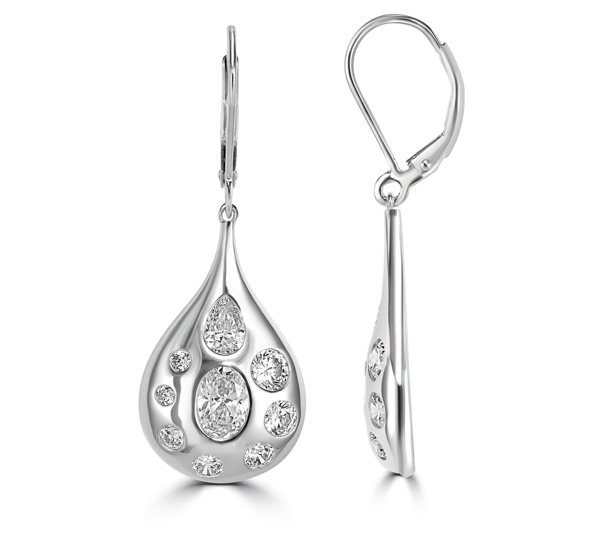 Make an elegant entrance every time you wear these Diamonique x Kathy Levine dangle earrings. The distinctive design features pear-shaped dangles with burnished set oval, round, and pear-shaped cubic zirconia Diamonique simulated diamonds.