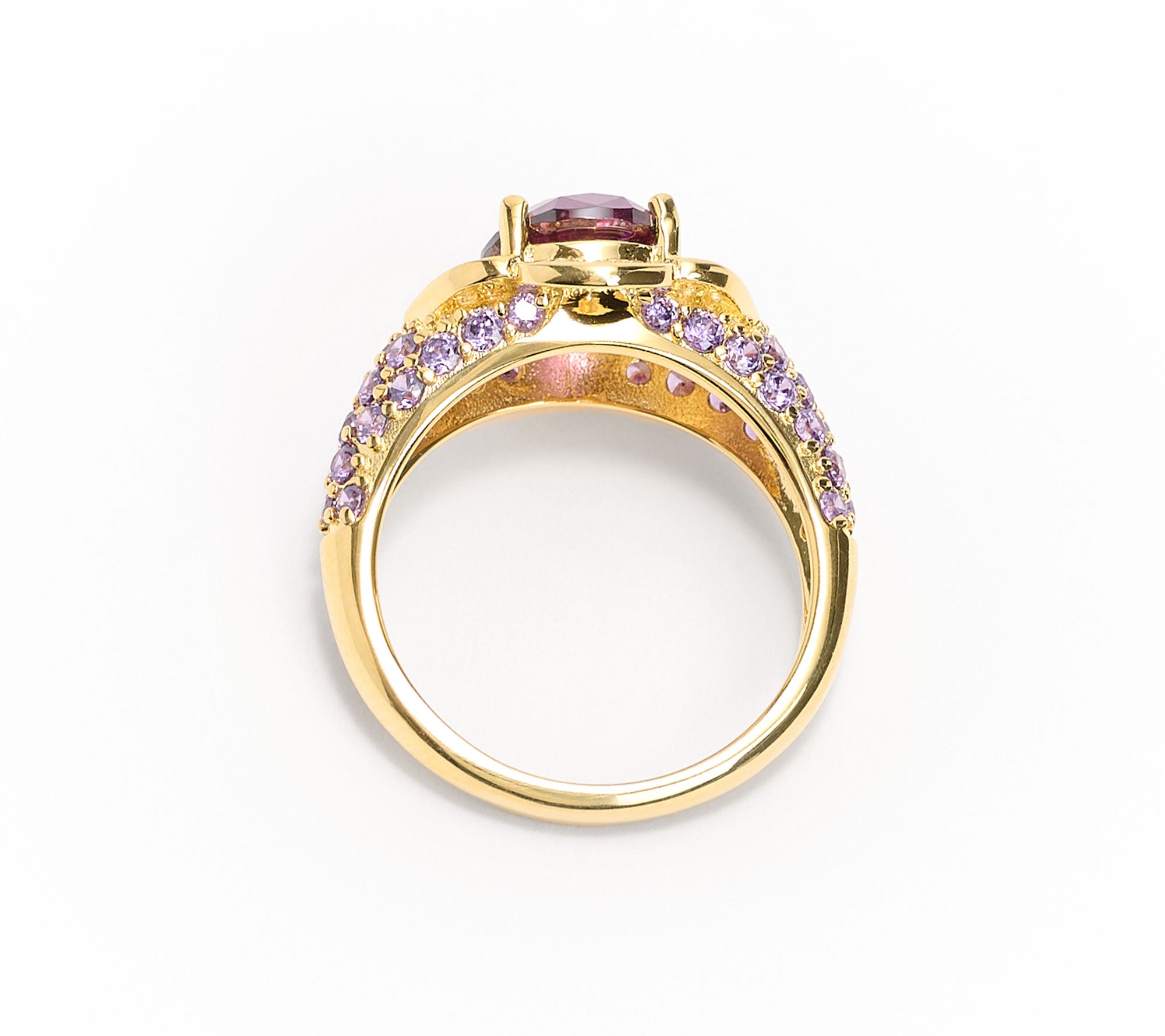 Diamonique x Kathy Levine Simulated Amethyst ring. Choice of Size and Color Plating. Sterling Silver w/Rhodium or 14k Yellow Gold Plating. Sizes 4-11. Prong set Oval CZ in center of a pave flower design & pave stones down shank. Measures approx 1/2"L x 1/2"W x 1/4"H Simulated Amethyst CZ Oval & Round Clear CZ & Purple stones 6.177 cttw & DE 2.274 cttw. Kathy Levine Romance Card. Imported