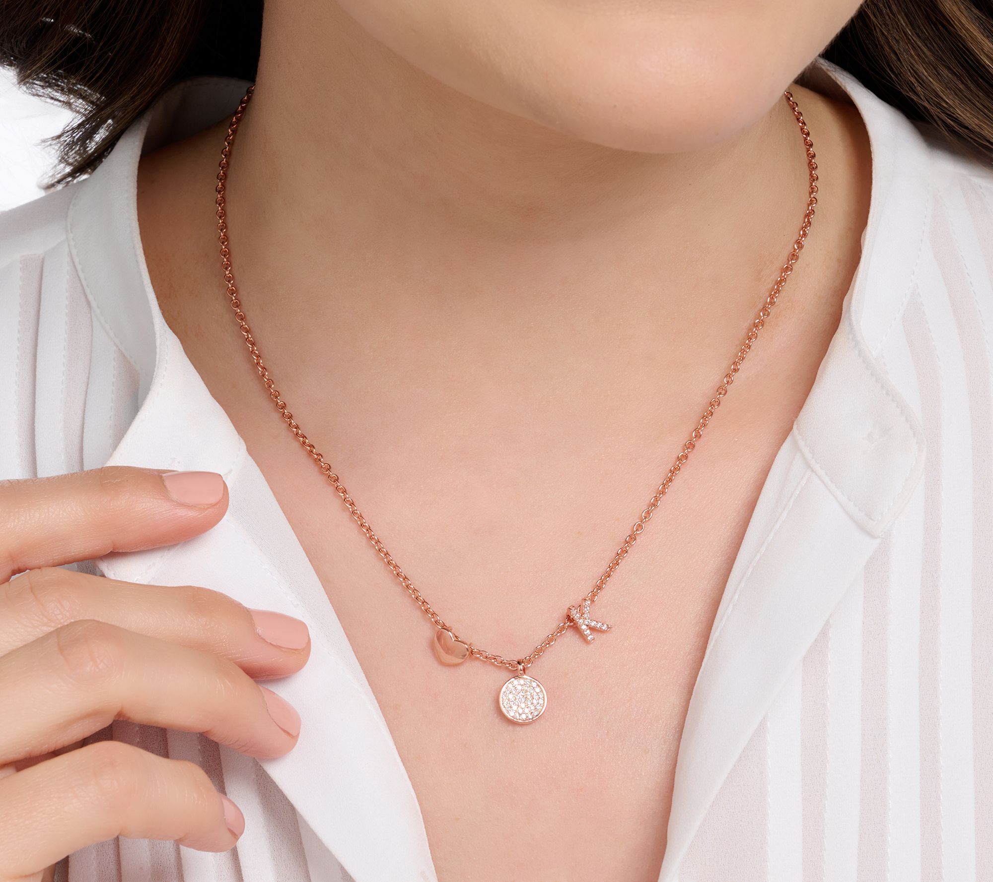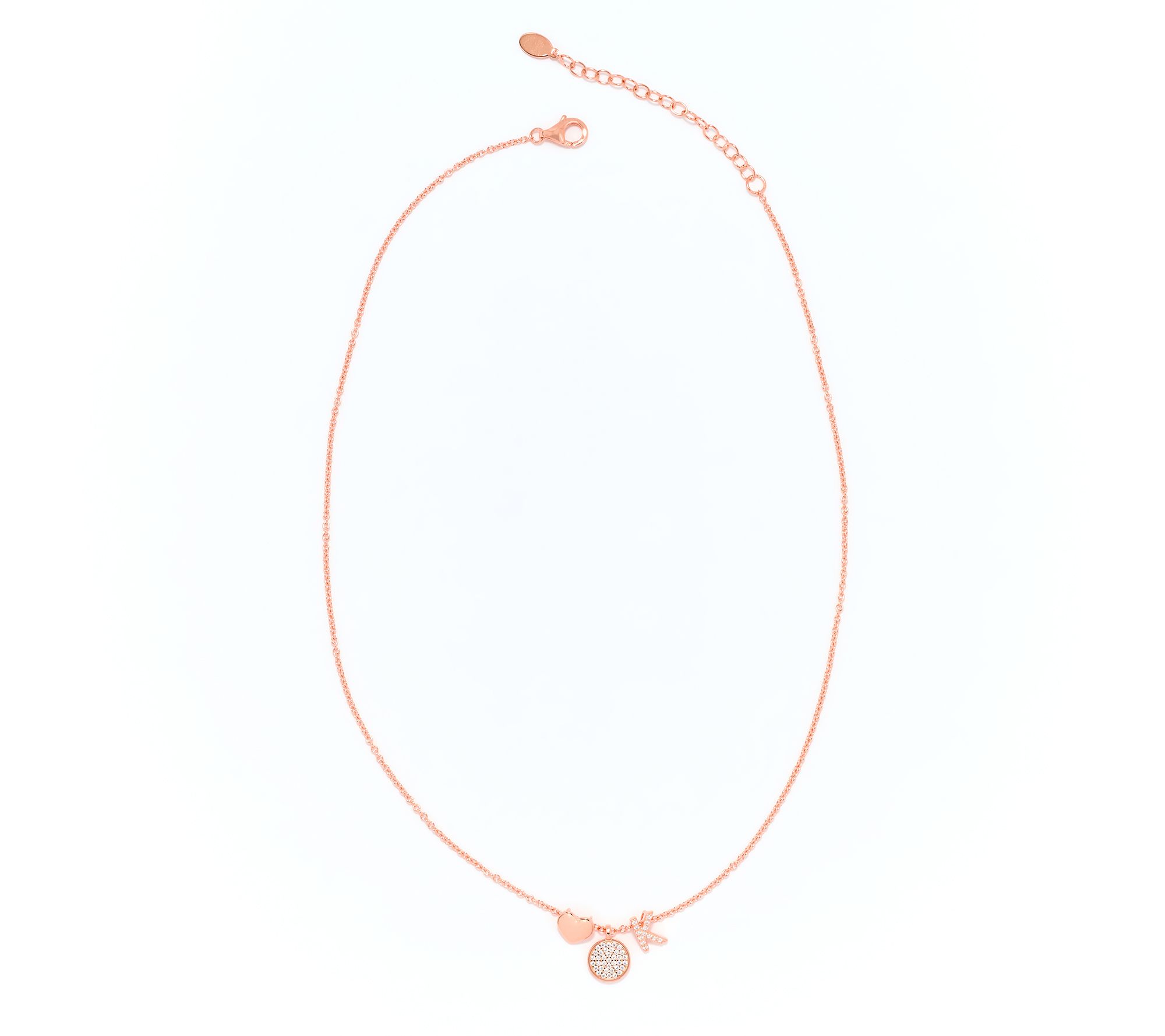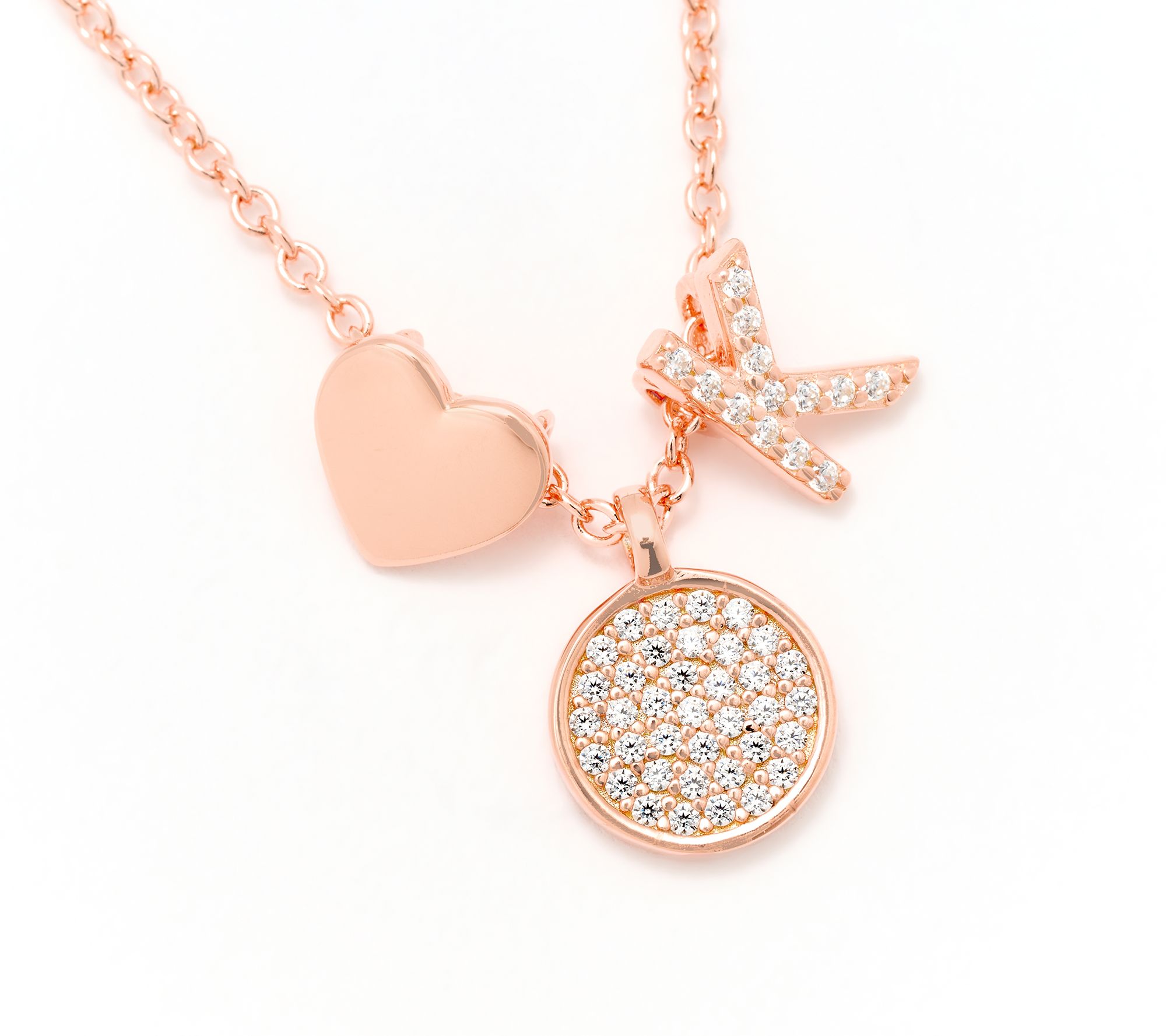 Multi-charm design with choice of initial; round Diamonique simulated diamonds; oval link chain