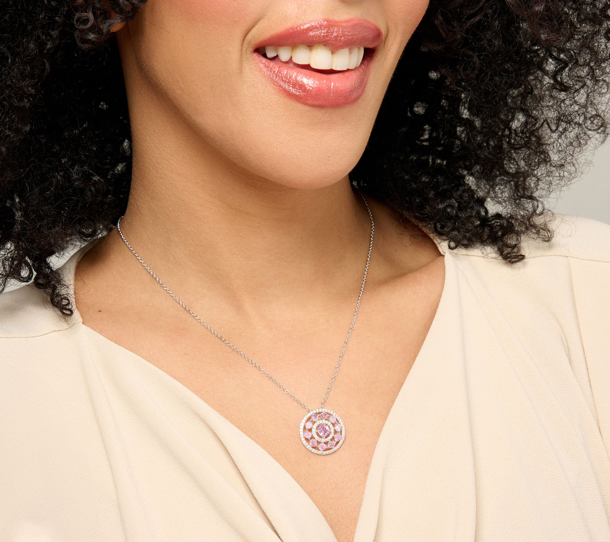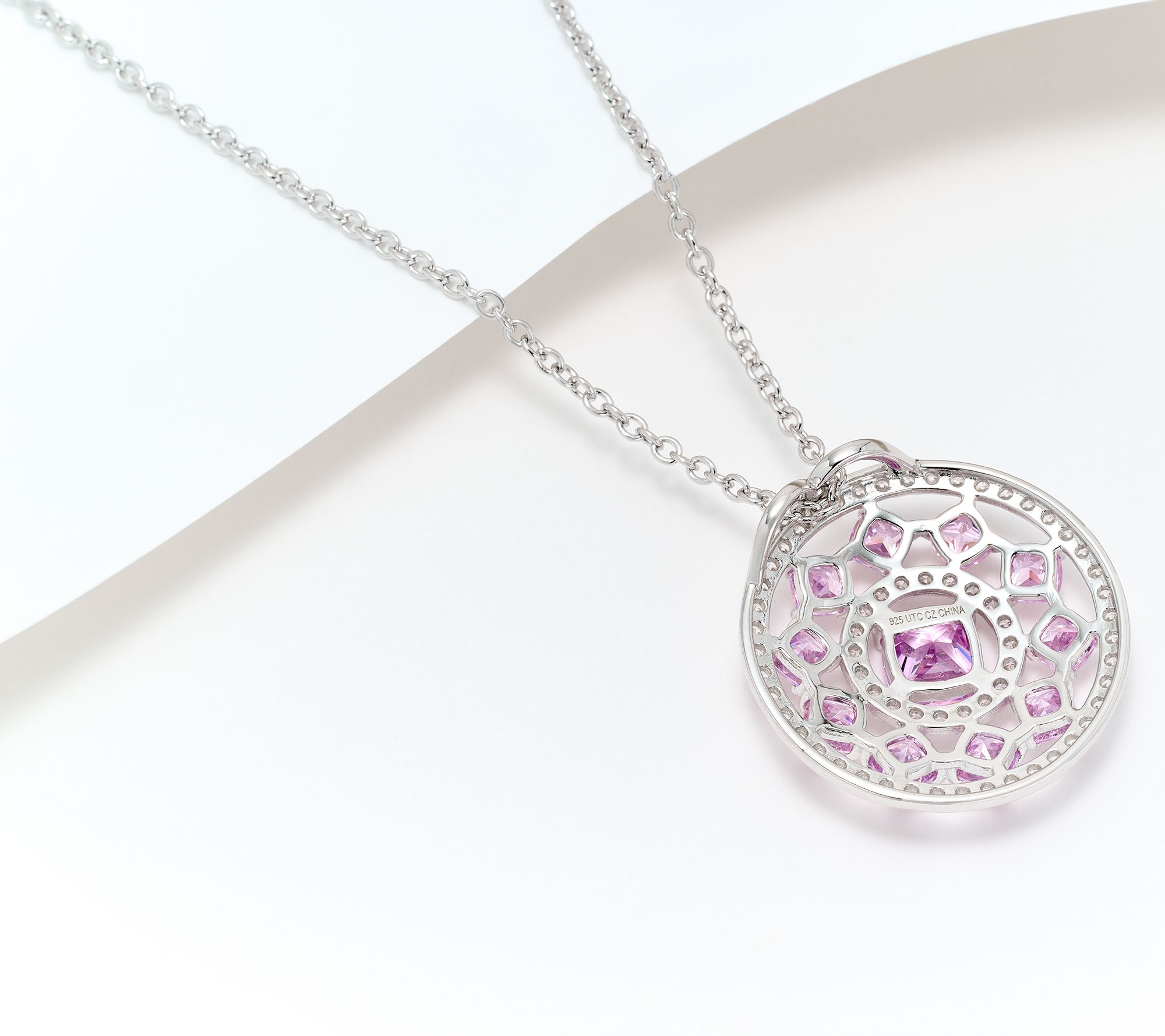 Round and cushion-cut Diamonique simulated diamonds in circular pendant