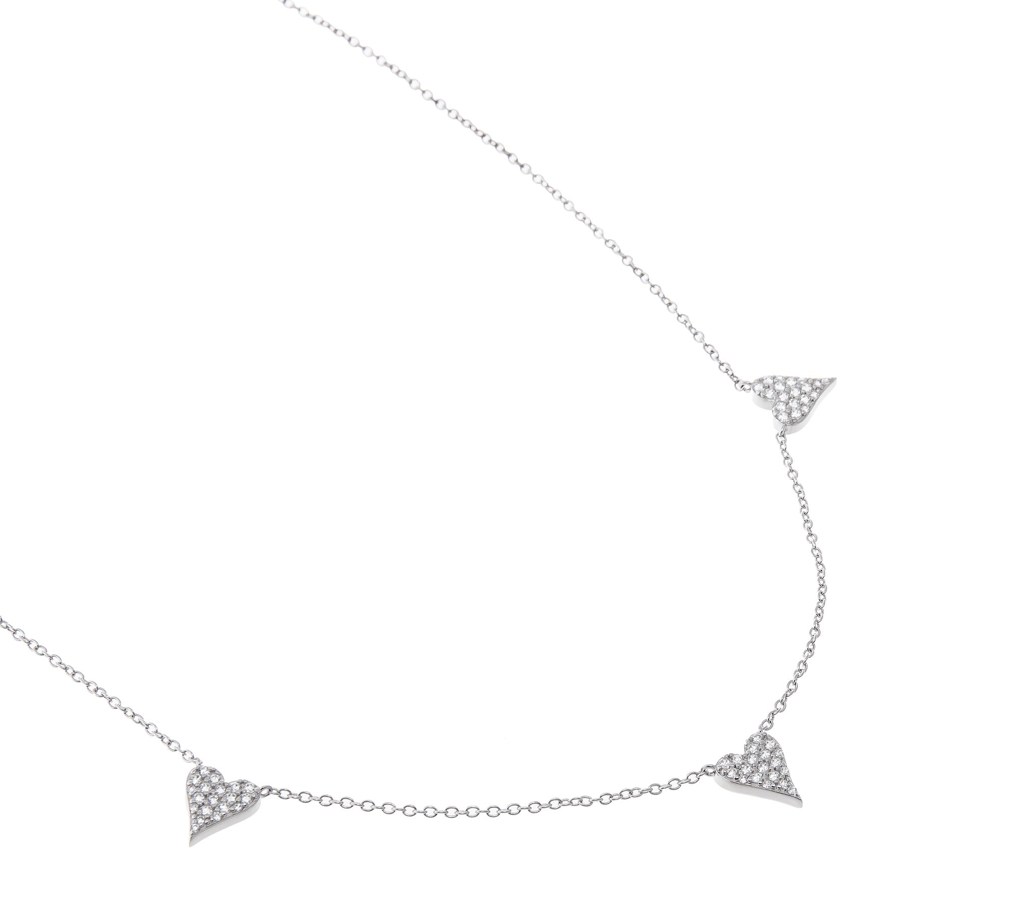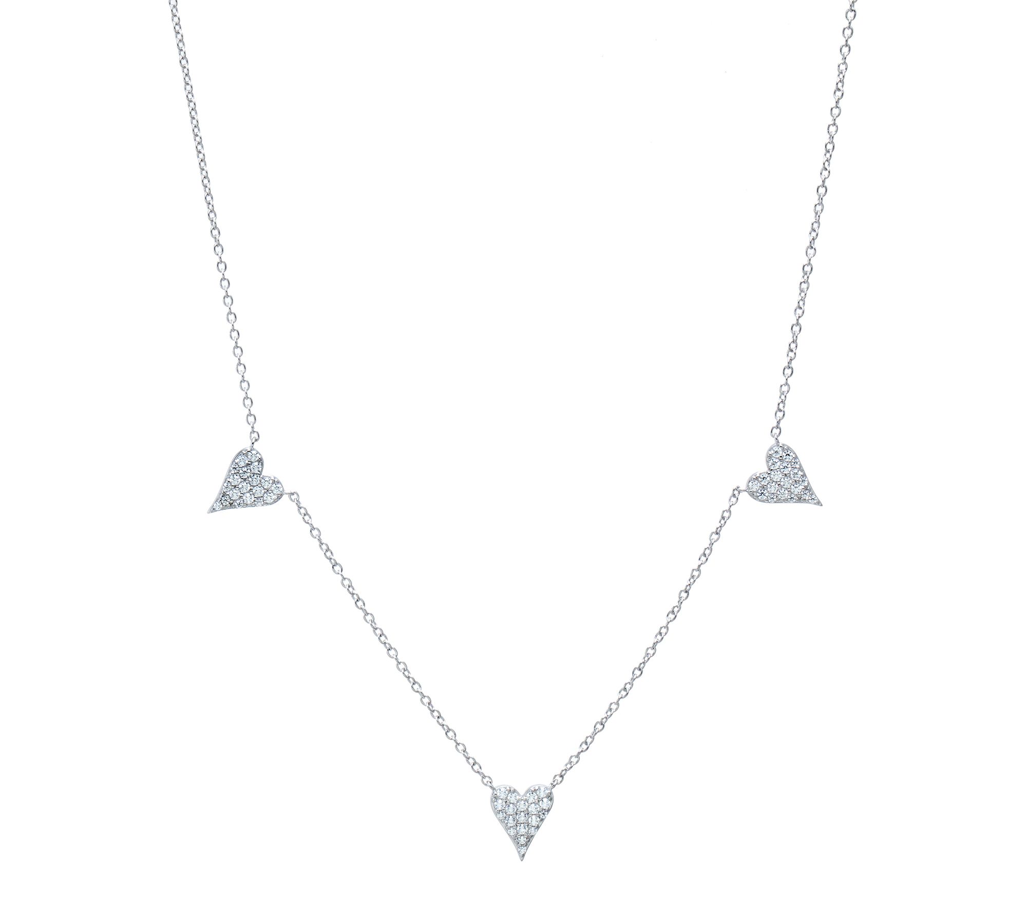 A trio of sparkling heart charms floats along a delicate station necklace, creating a charming accent that shines at day brunches or evening celebrations alike. With its pave-set Diamonique simulated diamonds and gleaming sterling silver or gold-plated finish, this piece offers a hint of radiance for any occasion. From Jennifer Miller.