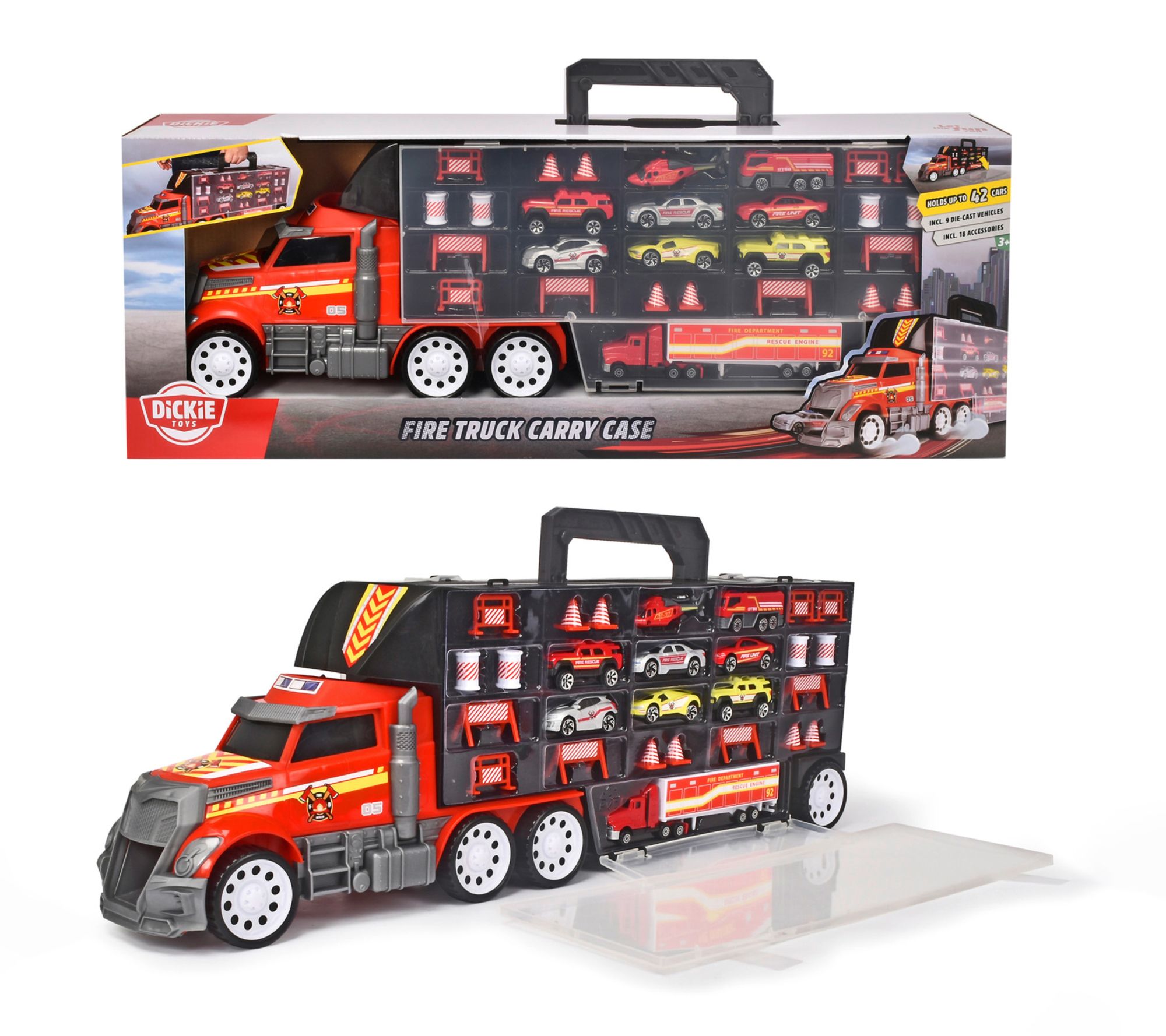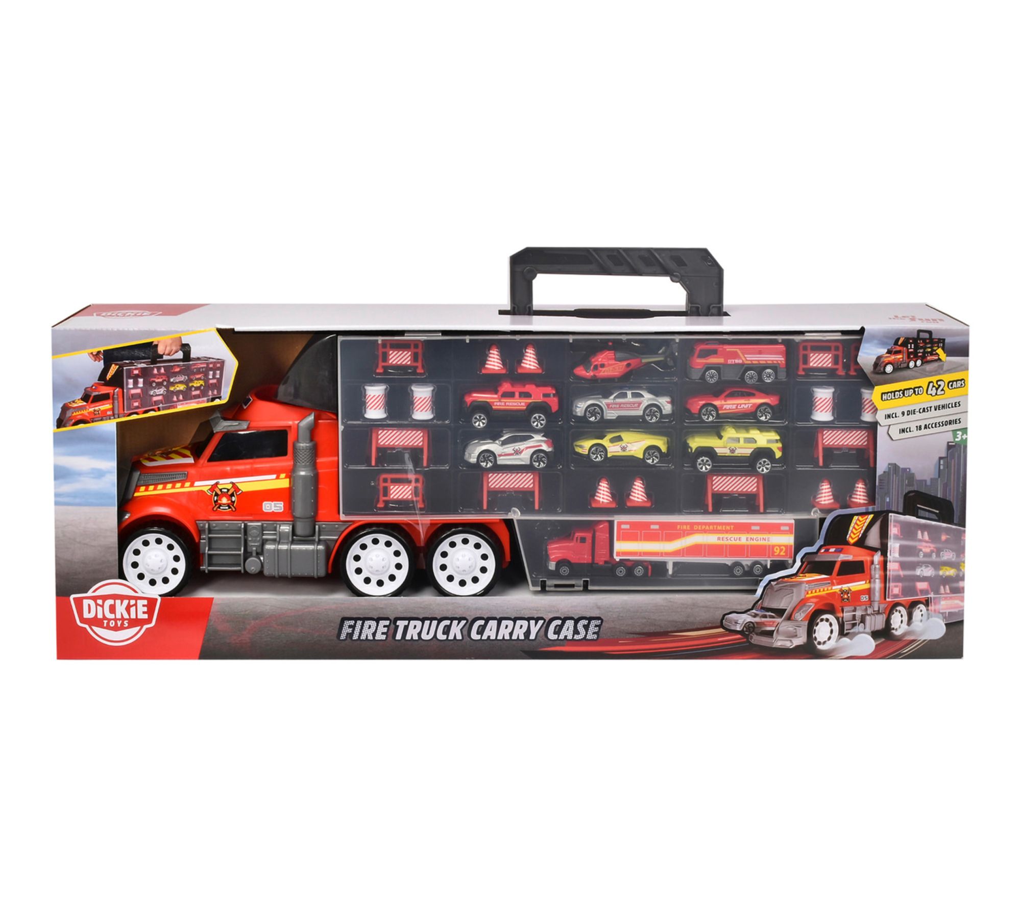 Fuel imaginative play with the Fire Truck Carry Case, cleverly designed to store and display up to 42 toy cars while keeping playtime organized. Multiple compartments and quick-access slots let you neatly arrange your collection, and the included die-cast vehicles and accessories set the stage for thrilling rescue missions and races. Take the excitement anywhere thanks to its sturdy handle and colorful fire truck design. From Dickie Toys.