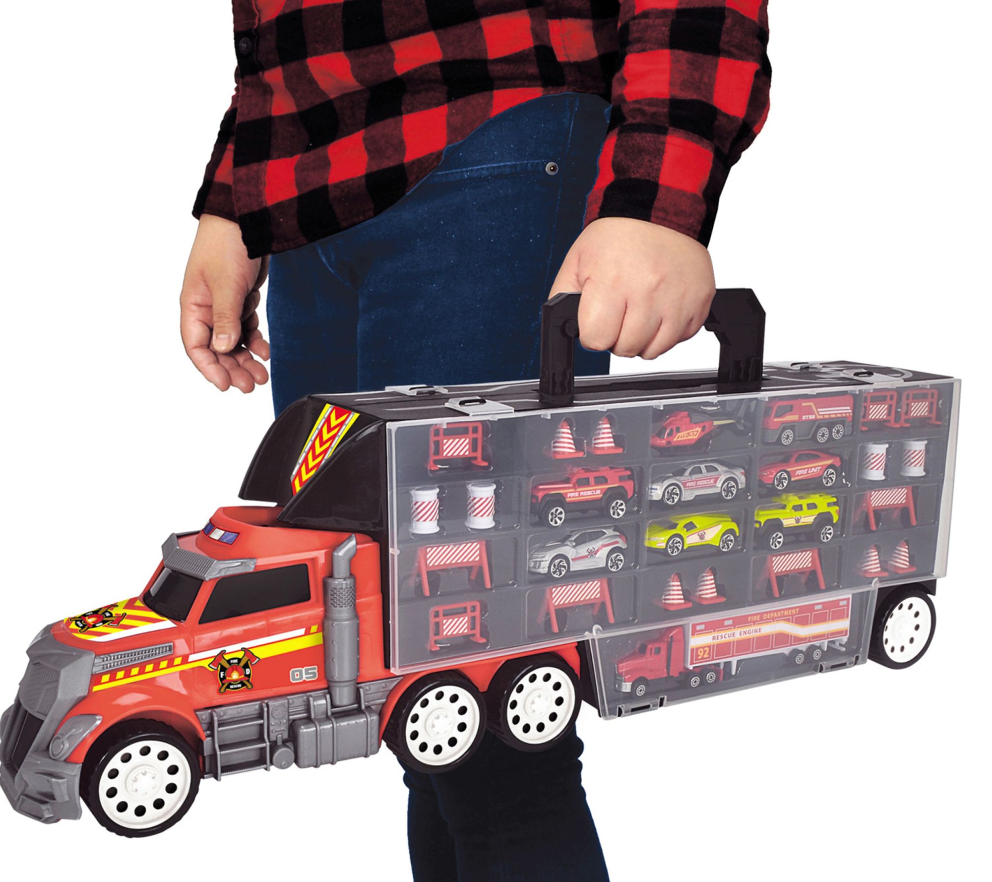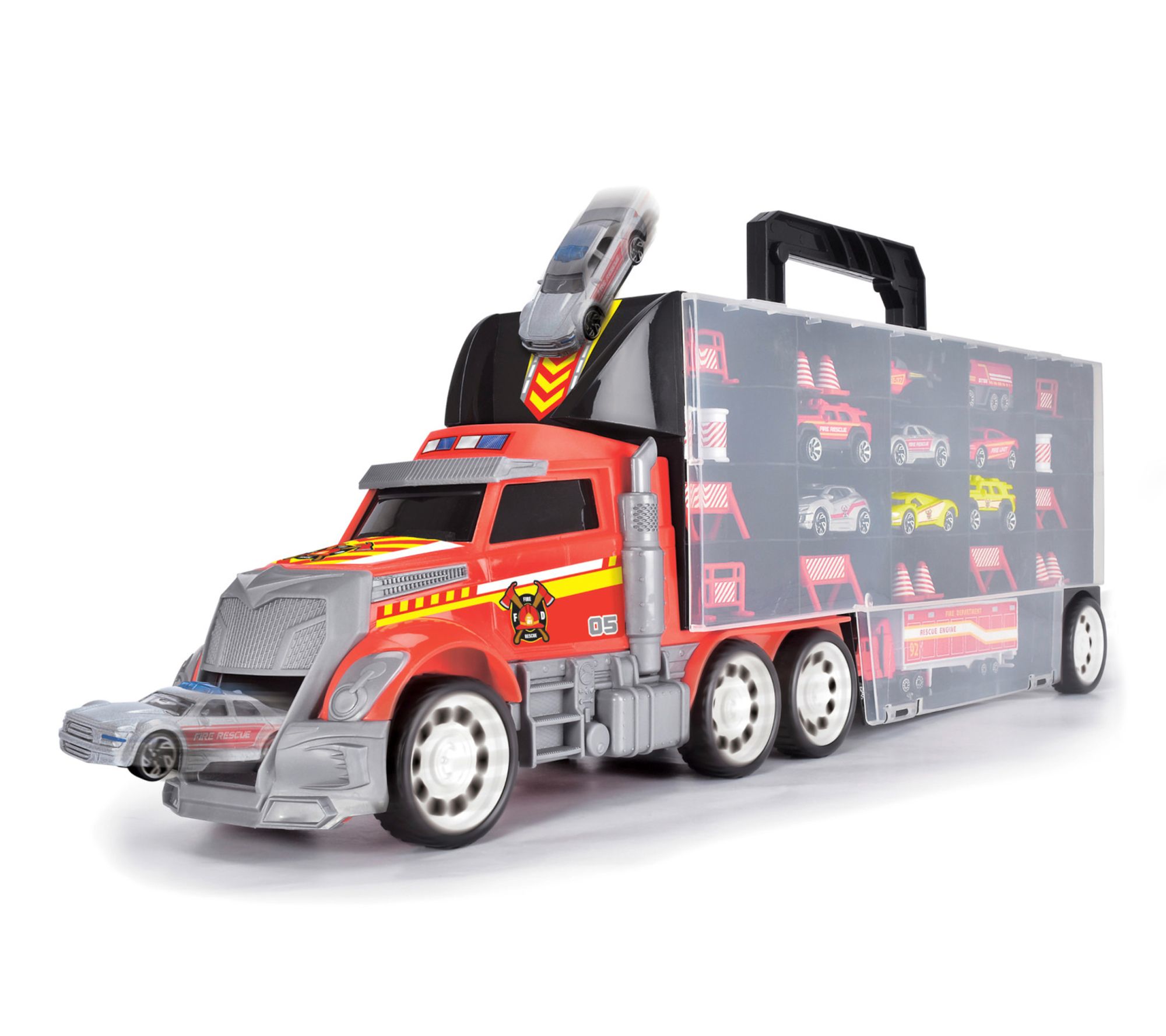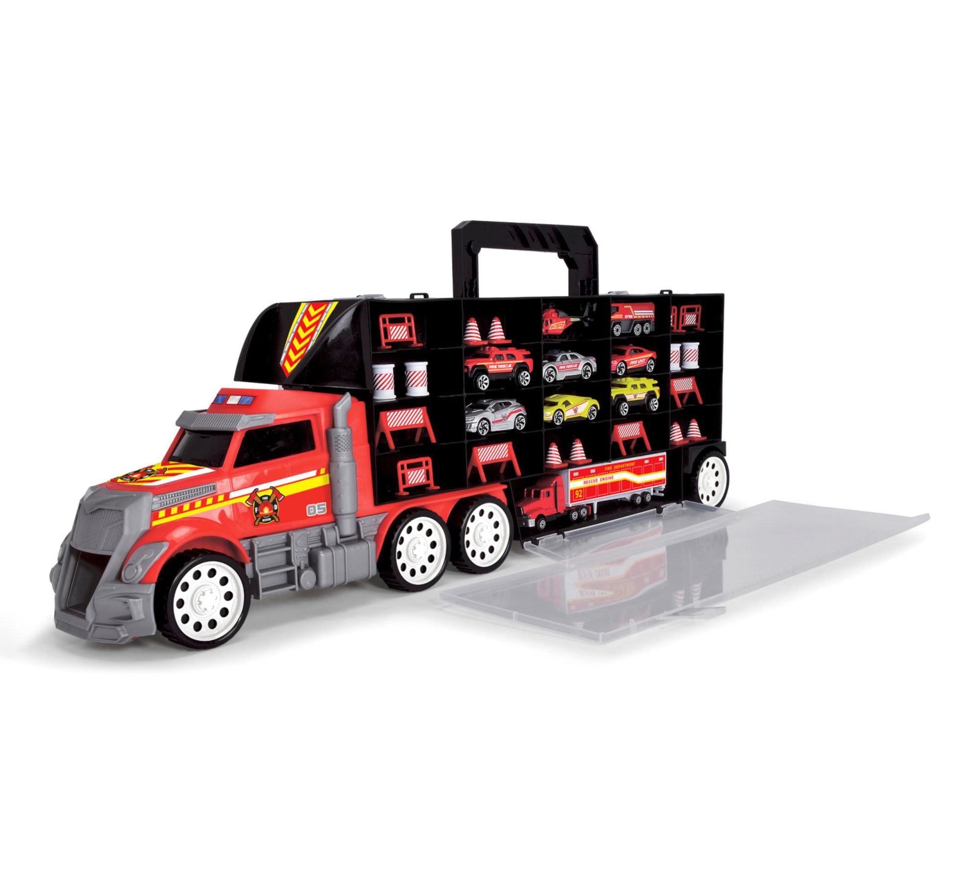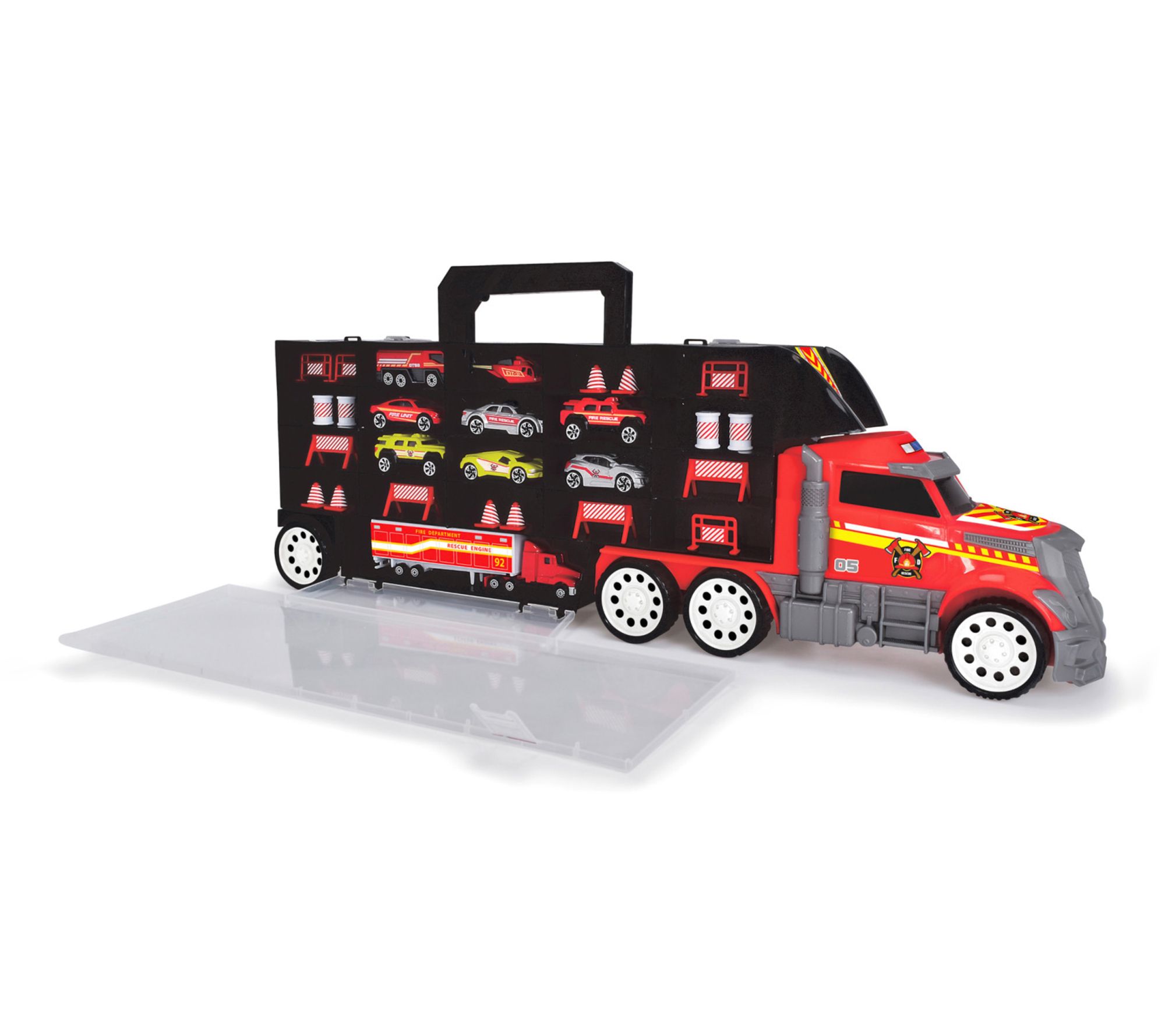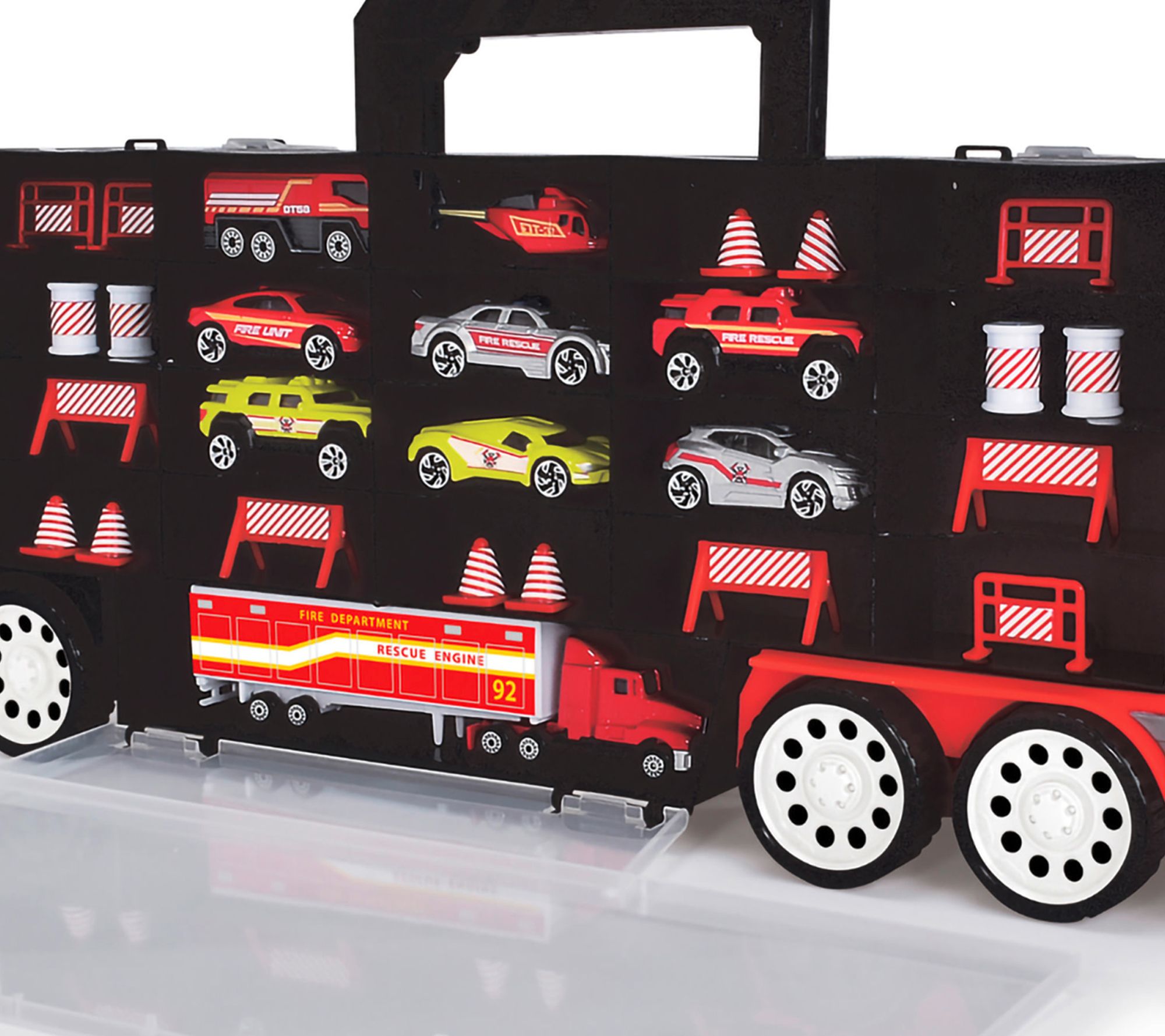 • Includes one firetruck transporter, nine die-cast vehicles, and eighteen accessories