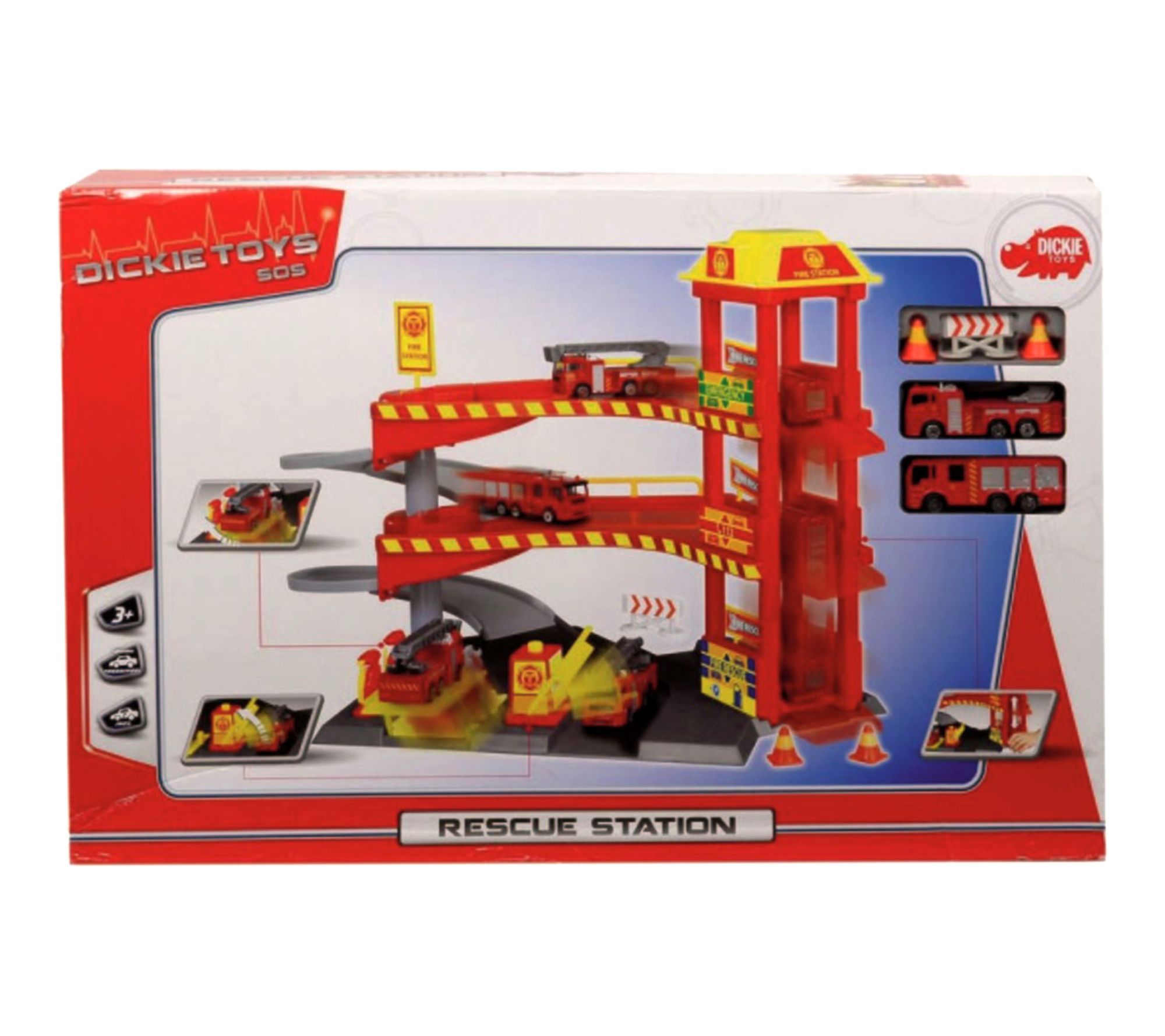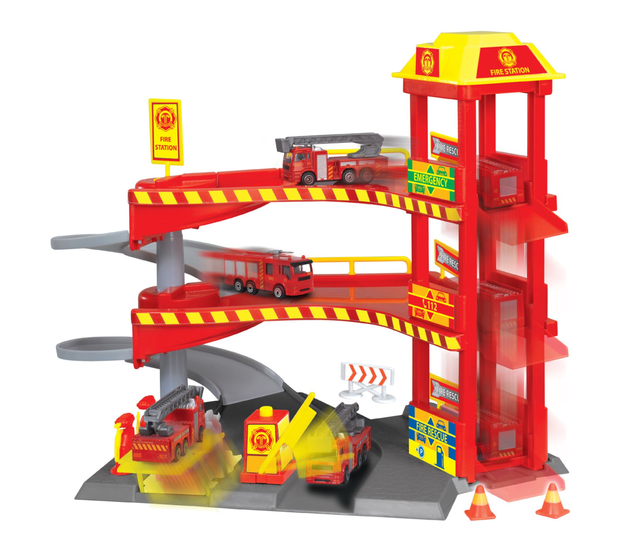 Bring excitement to playtime with this fire station playset featuring three levels of action, a manual lift, and a barrier for authorized vehicles. Young vehicle enthusiasts can enjoy fueling up at the petrol station and sending rescue cars on daring missions over ramps and through traffic cones. Complete with two die-cast cars and accessories, it's designed to spark hours of imaginative adventure. From Dickie Toys.