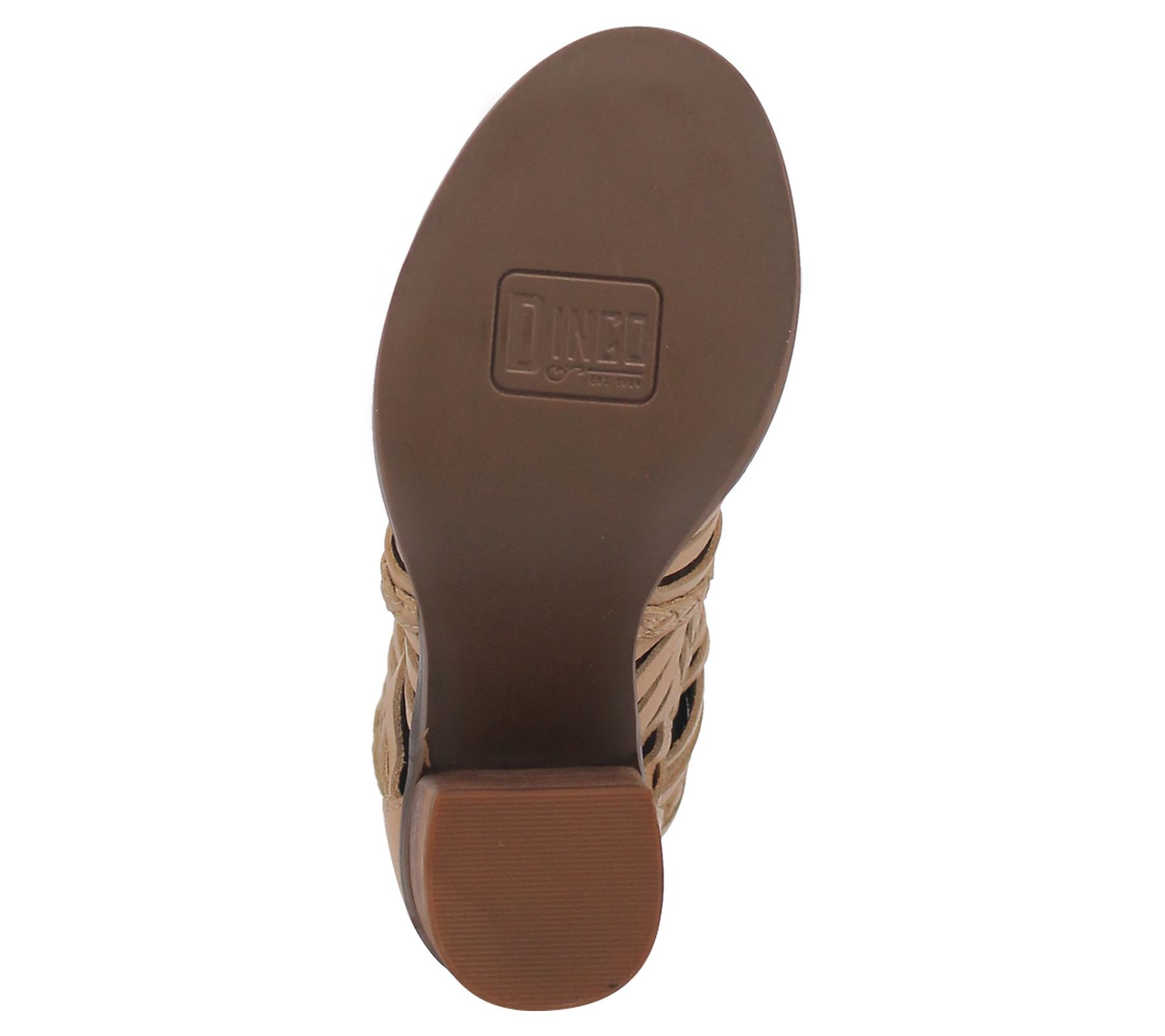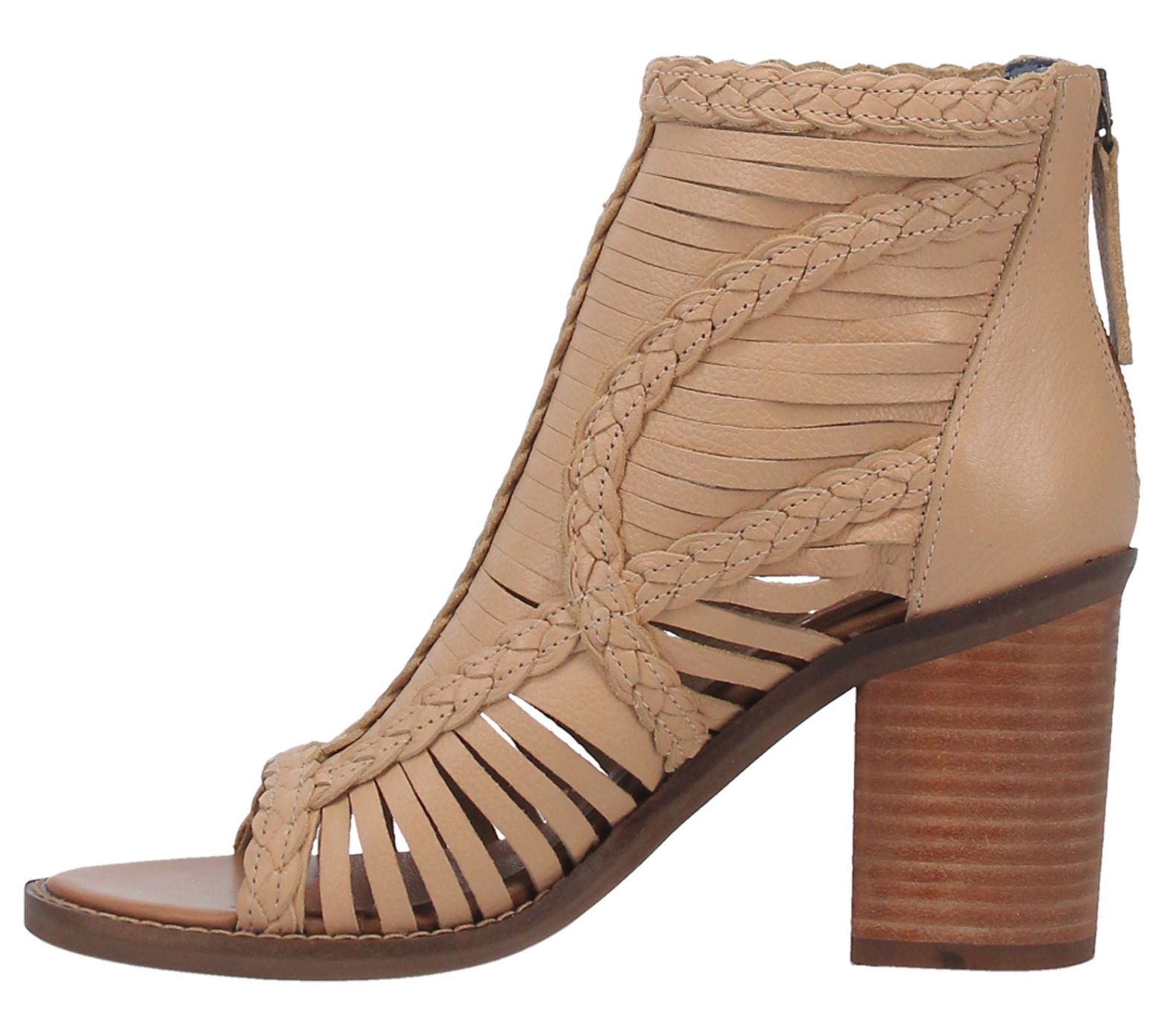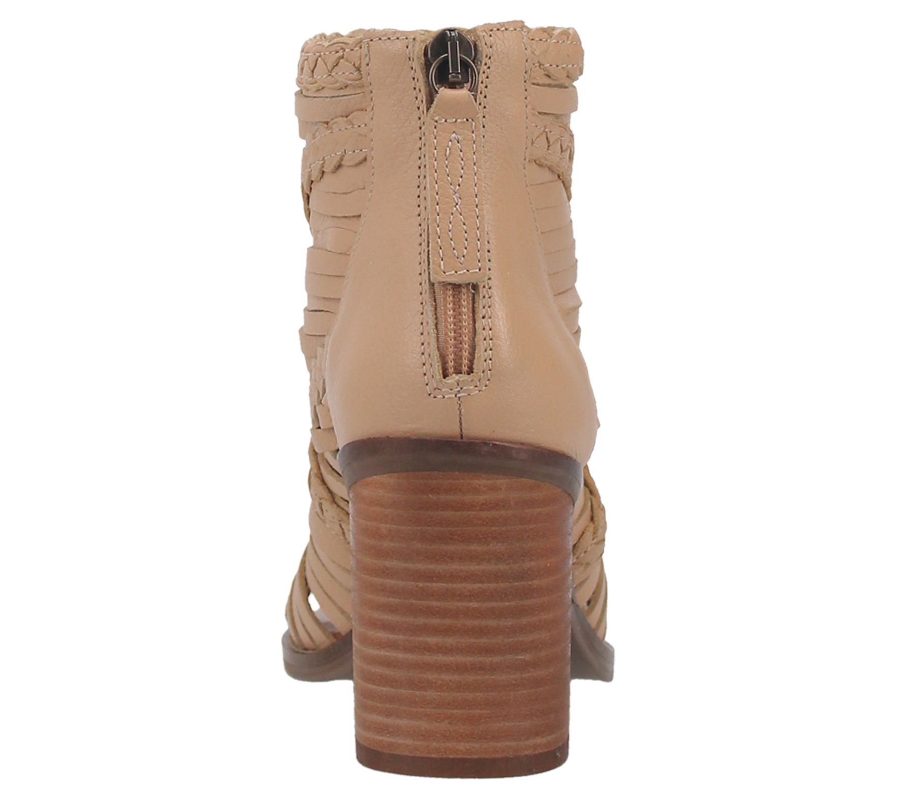 • Back zip, leather strips with leather woven braid overlays, open toe, chunky heel