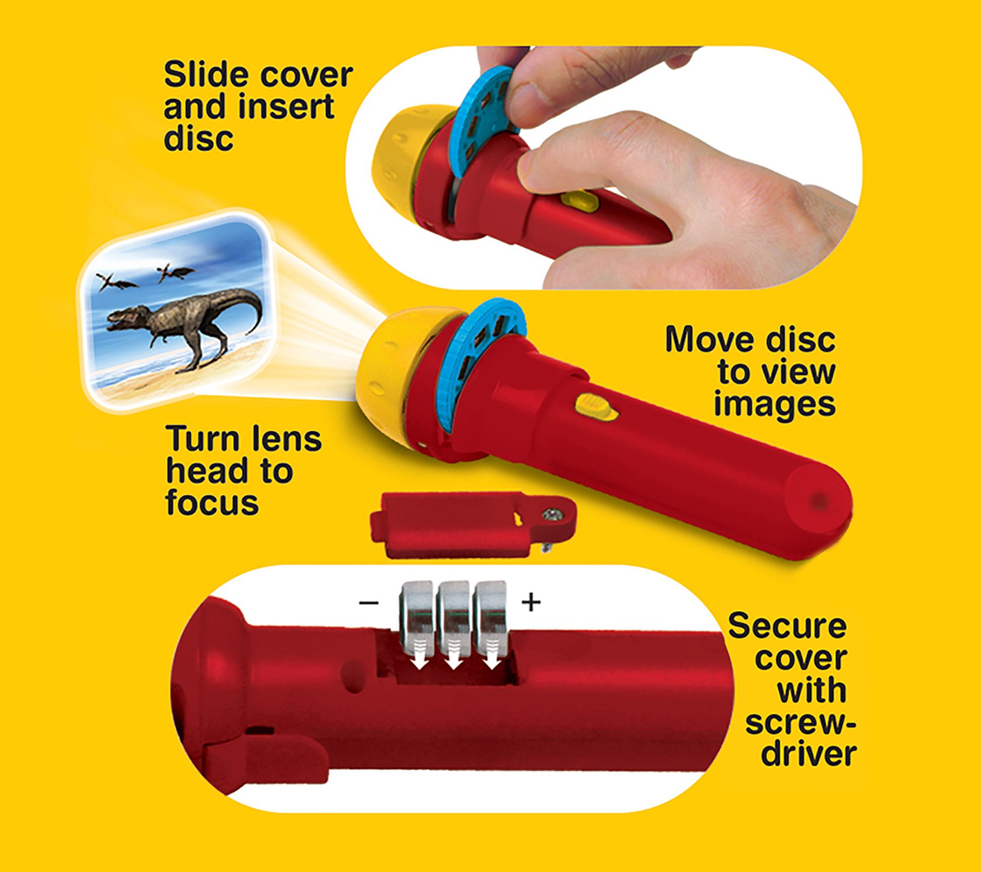 • Includes flashlight projector, three slides, and three LR44 batteries