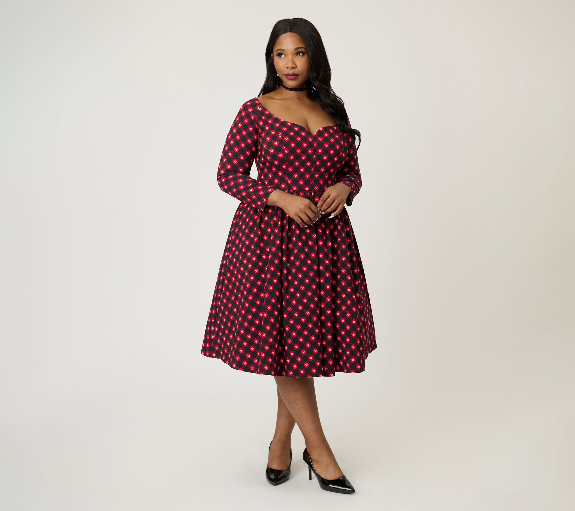 • Features: sweetheart neckline, no collar, long sleeves, knee length, side pockets, A-line silhouette, green and black plaid with white Mickey heads