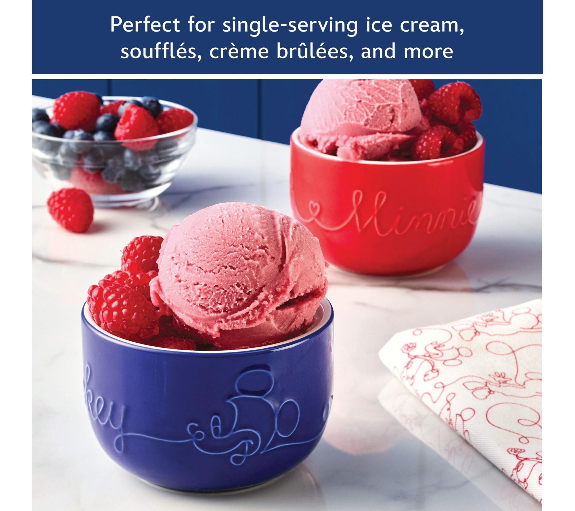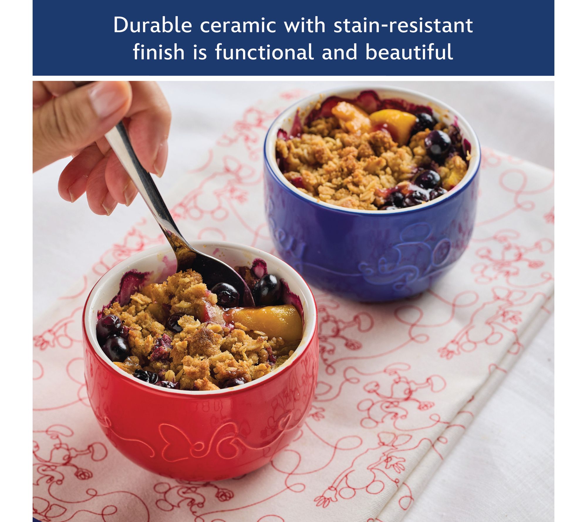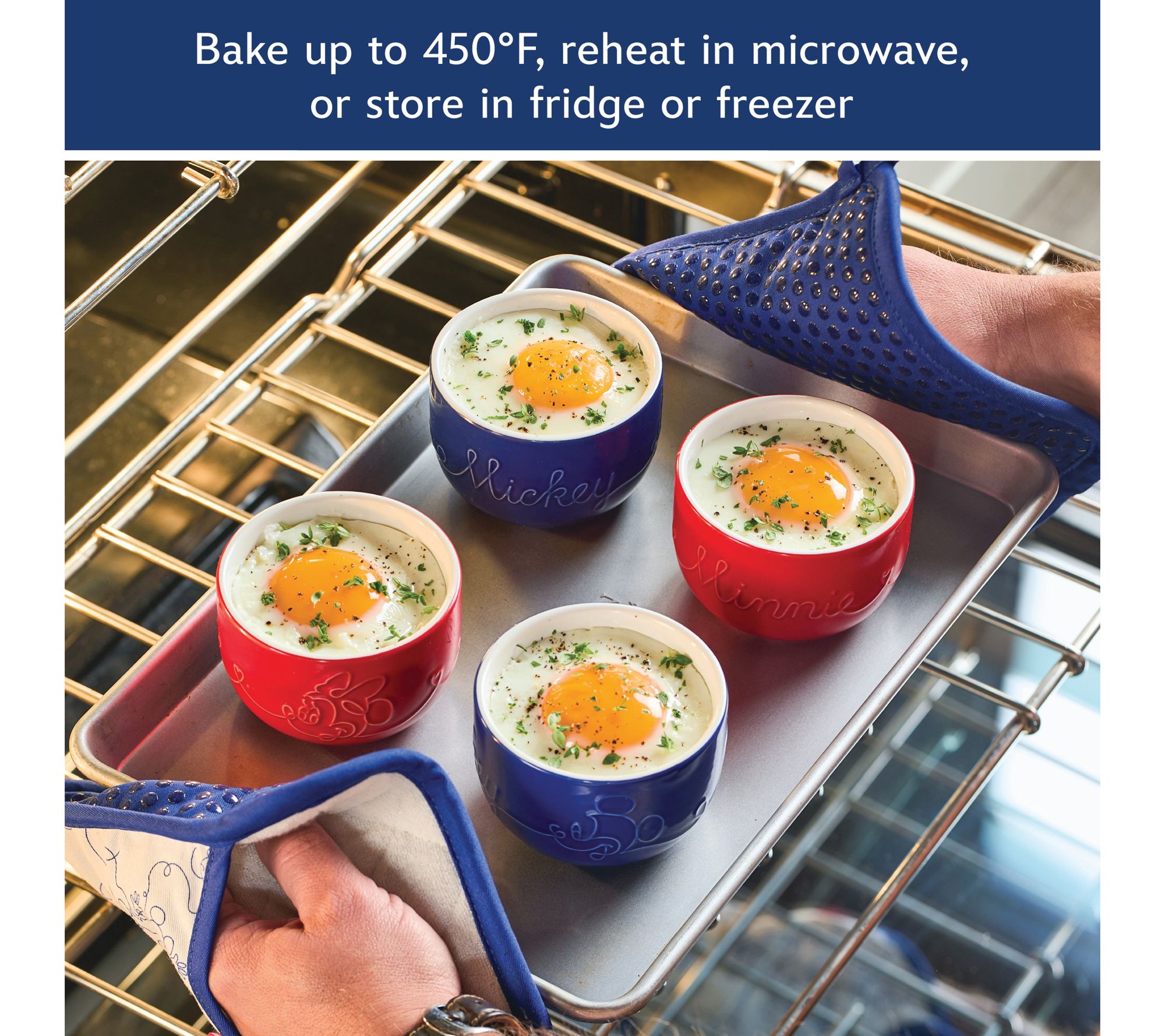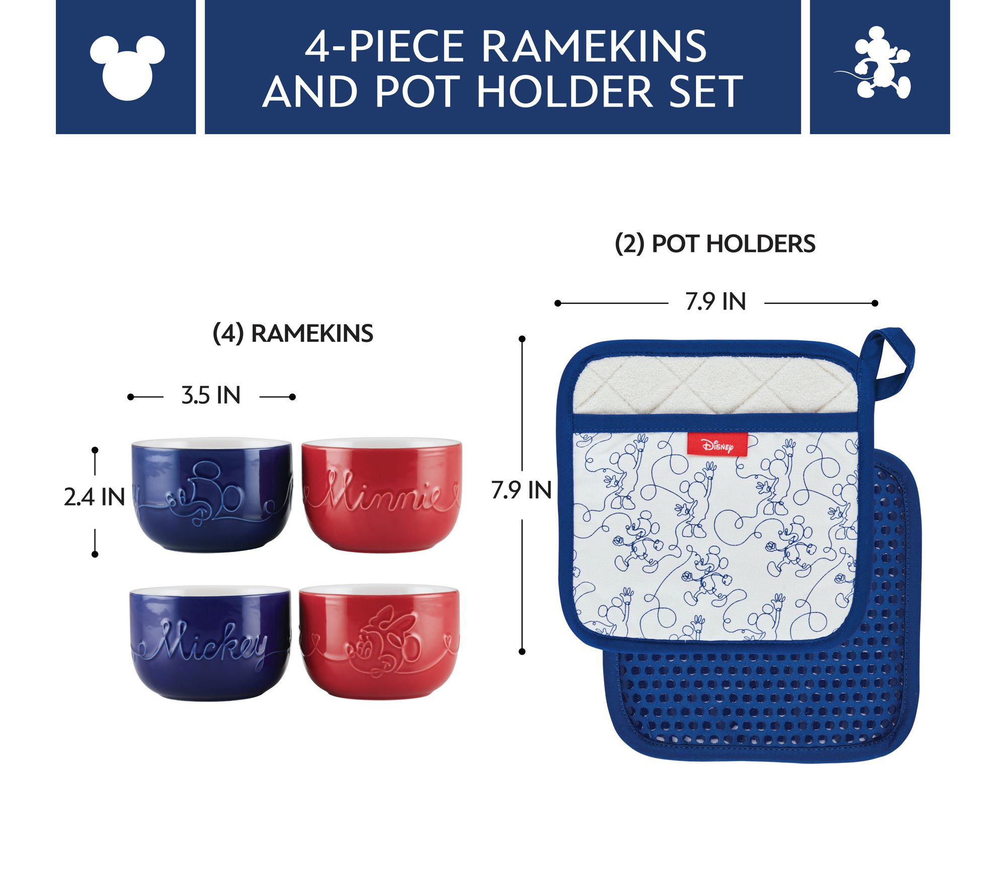 • Includes four 1-cup ceramic ramekins (two red and two blue) and two pot holders