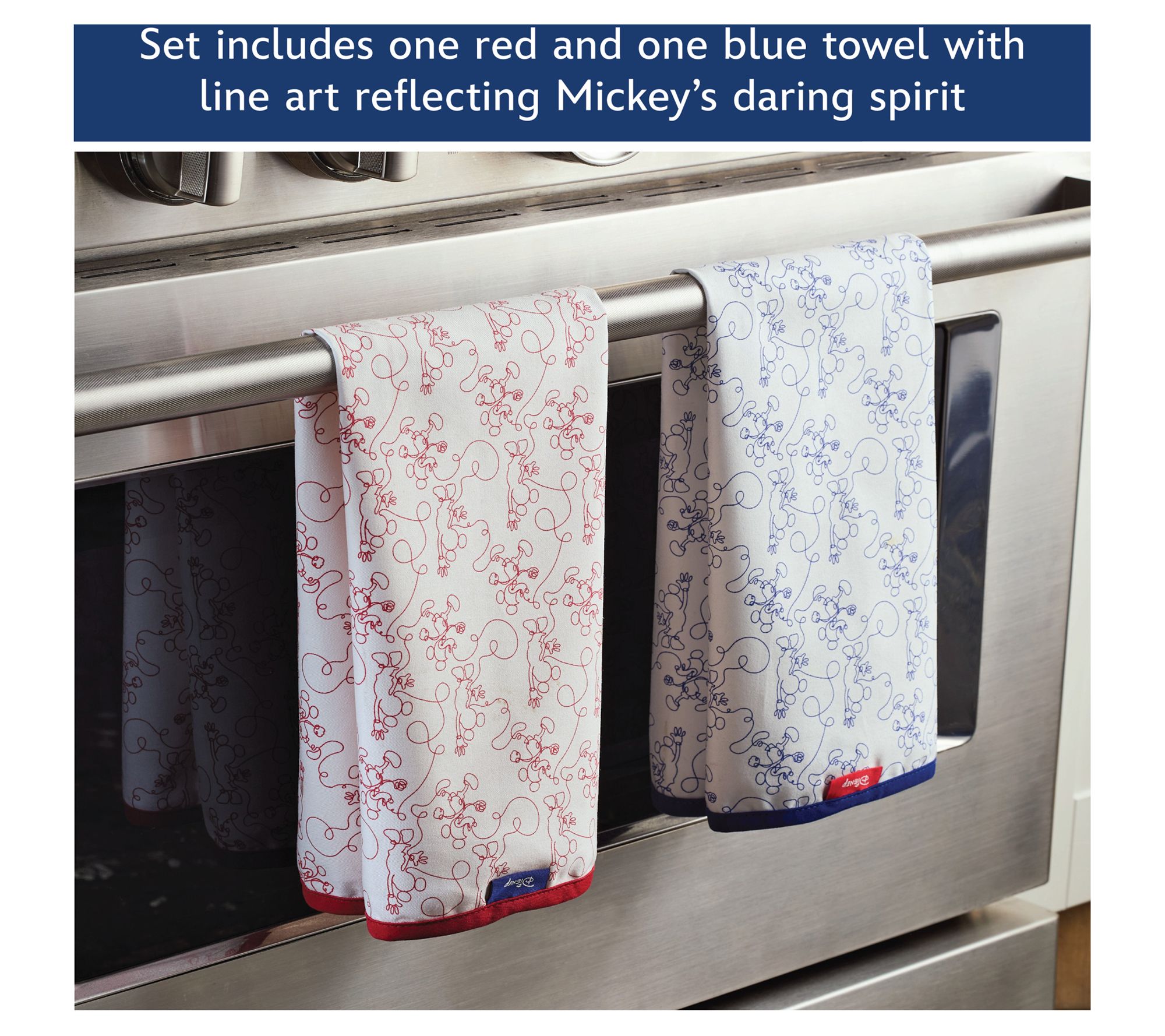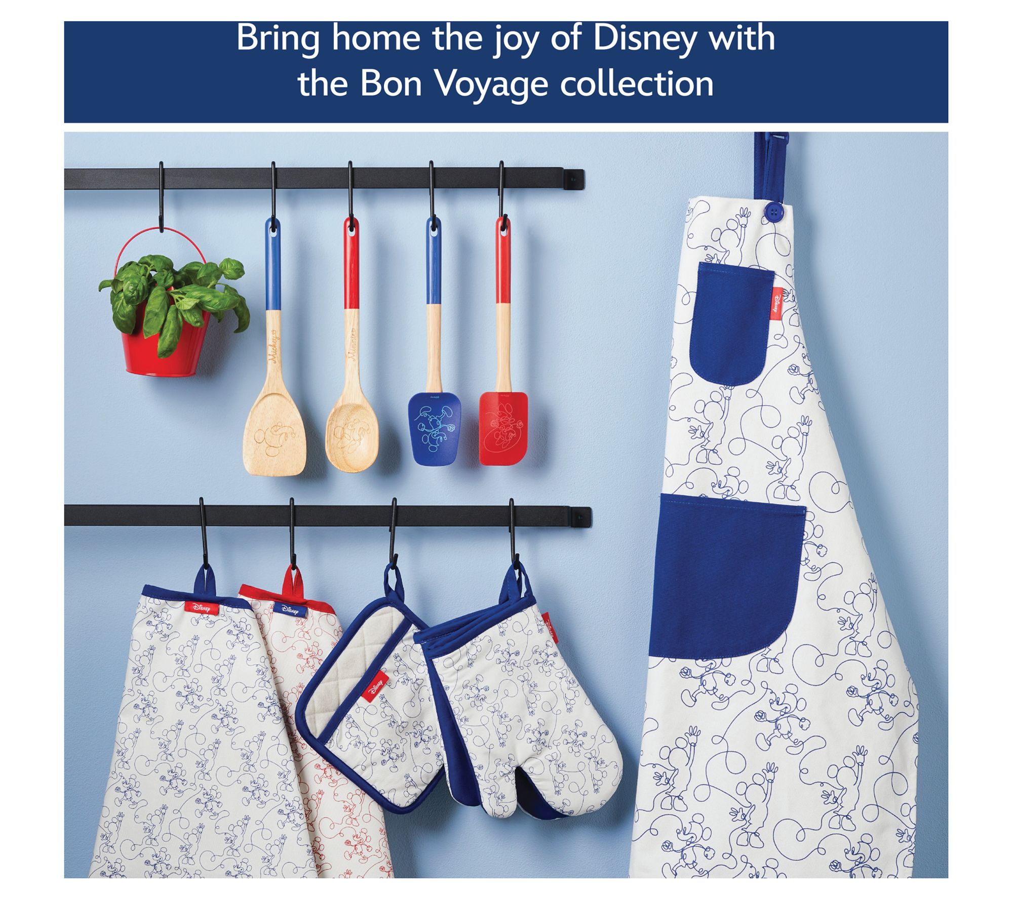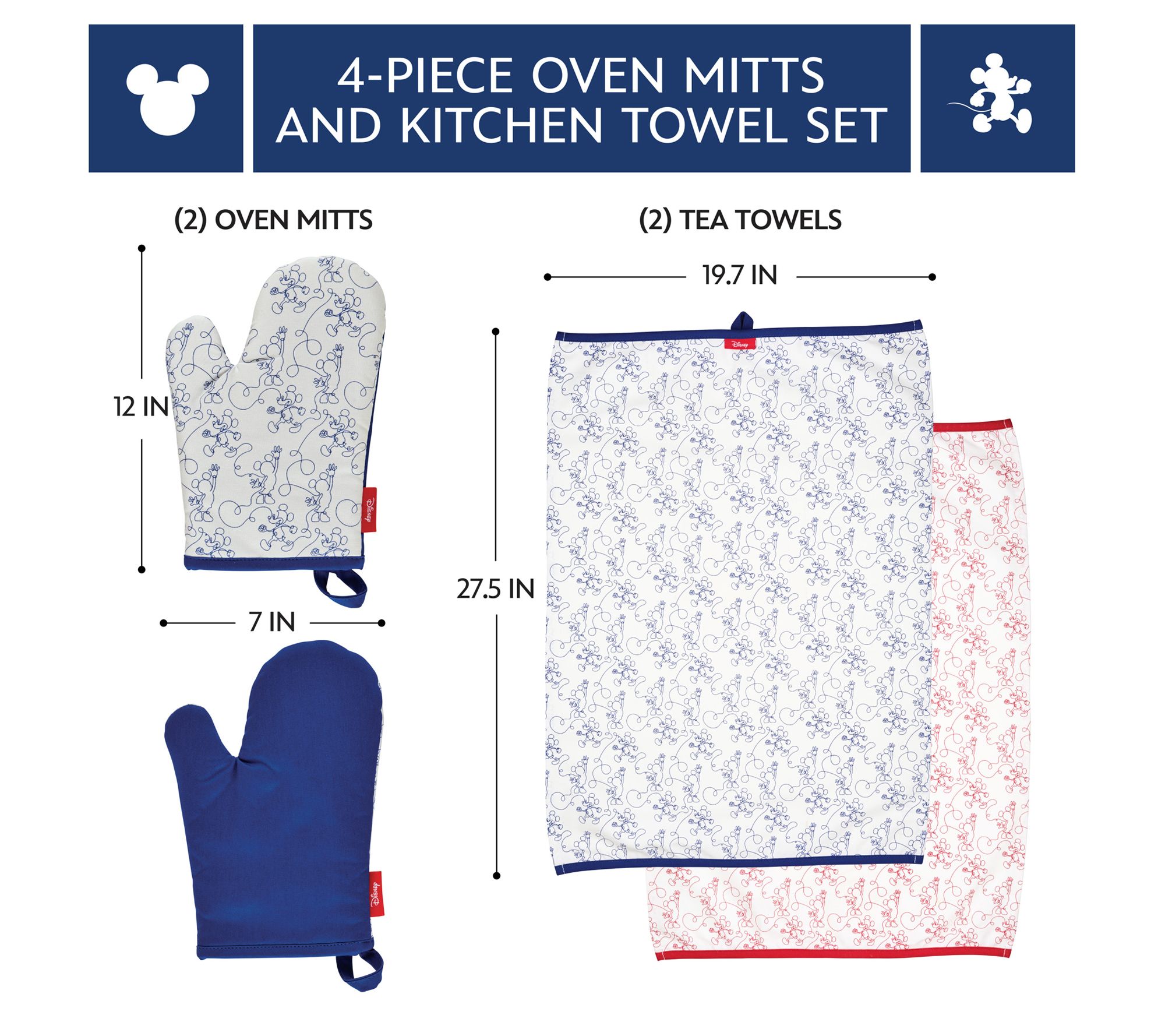 Bring a sense of adventure to your kitchen with this four-piece set of oven mitts and kitchen towels from the Bon Voyage collection by Disney Home. Inspired by the nautical adventures of Disney Mickey Mouse, the Bon Voyage collection is designed for those who embrace the joy of exploration. Featuring a bold blue, red, and white color palette and fun line art, this set invites you to add a touch of playfulness and vibrancy to your kitchen. From Disney Home.