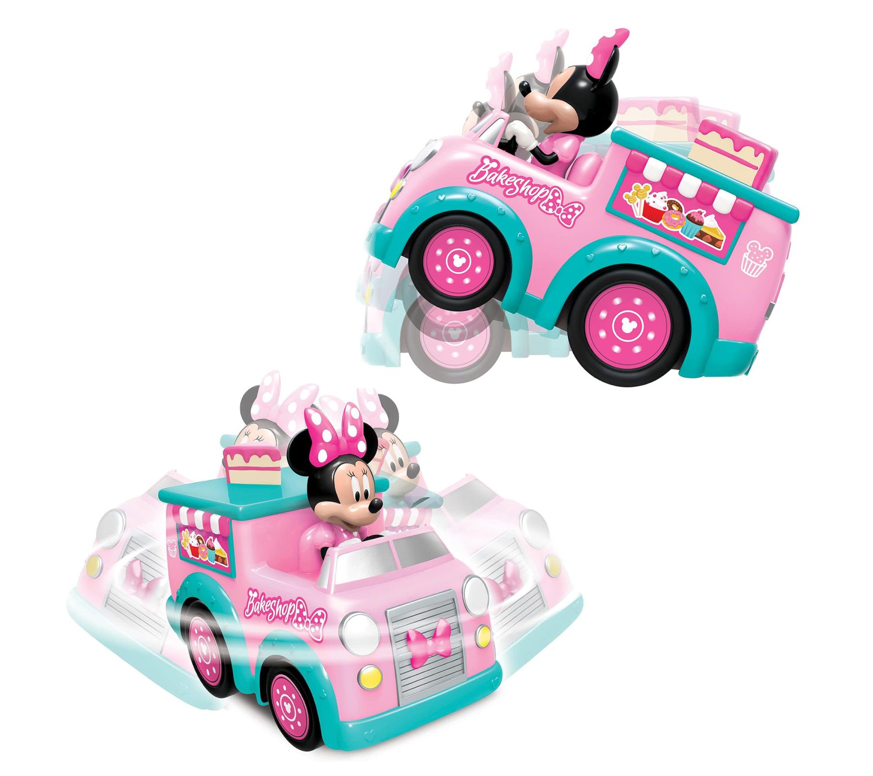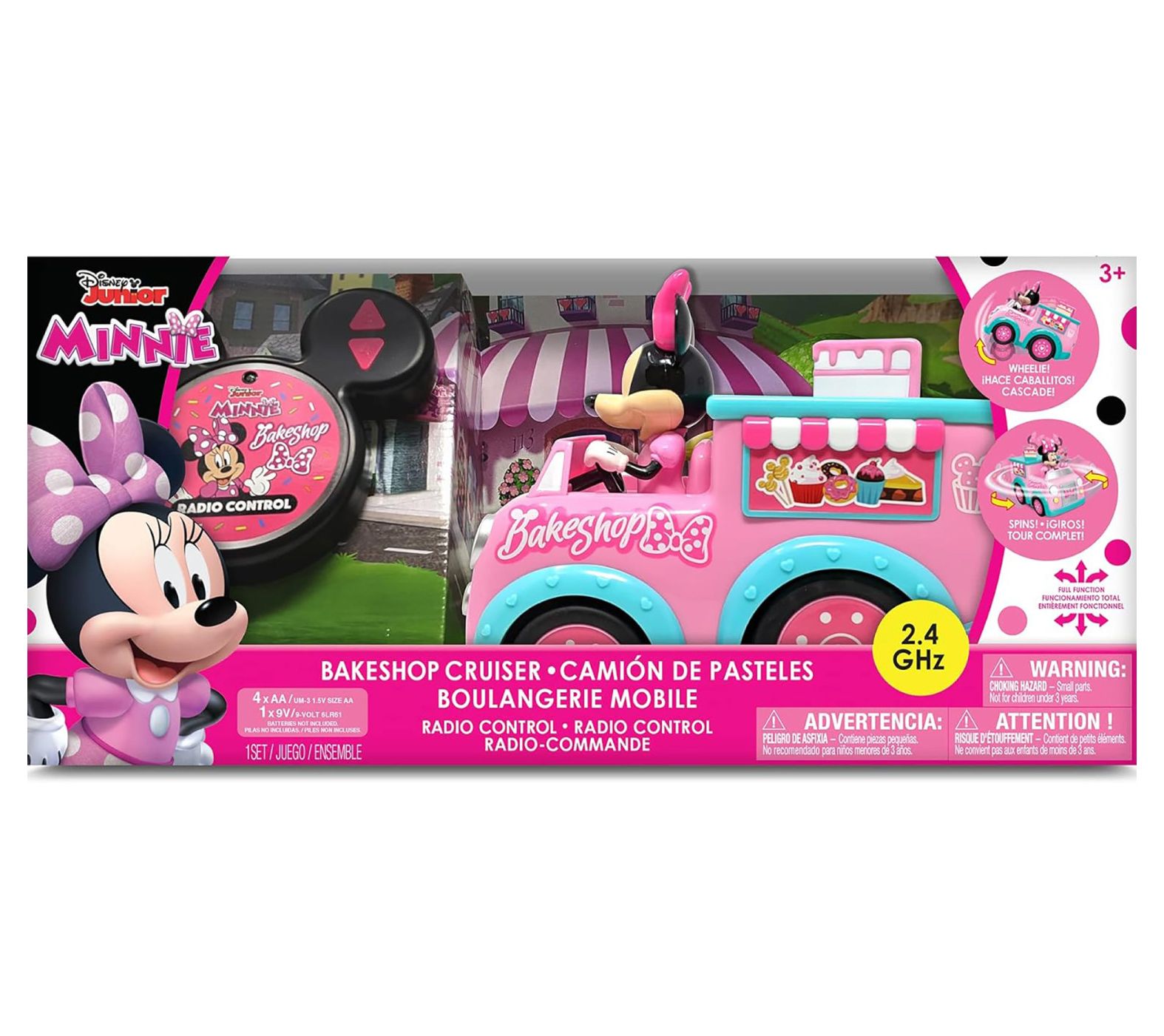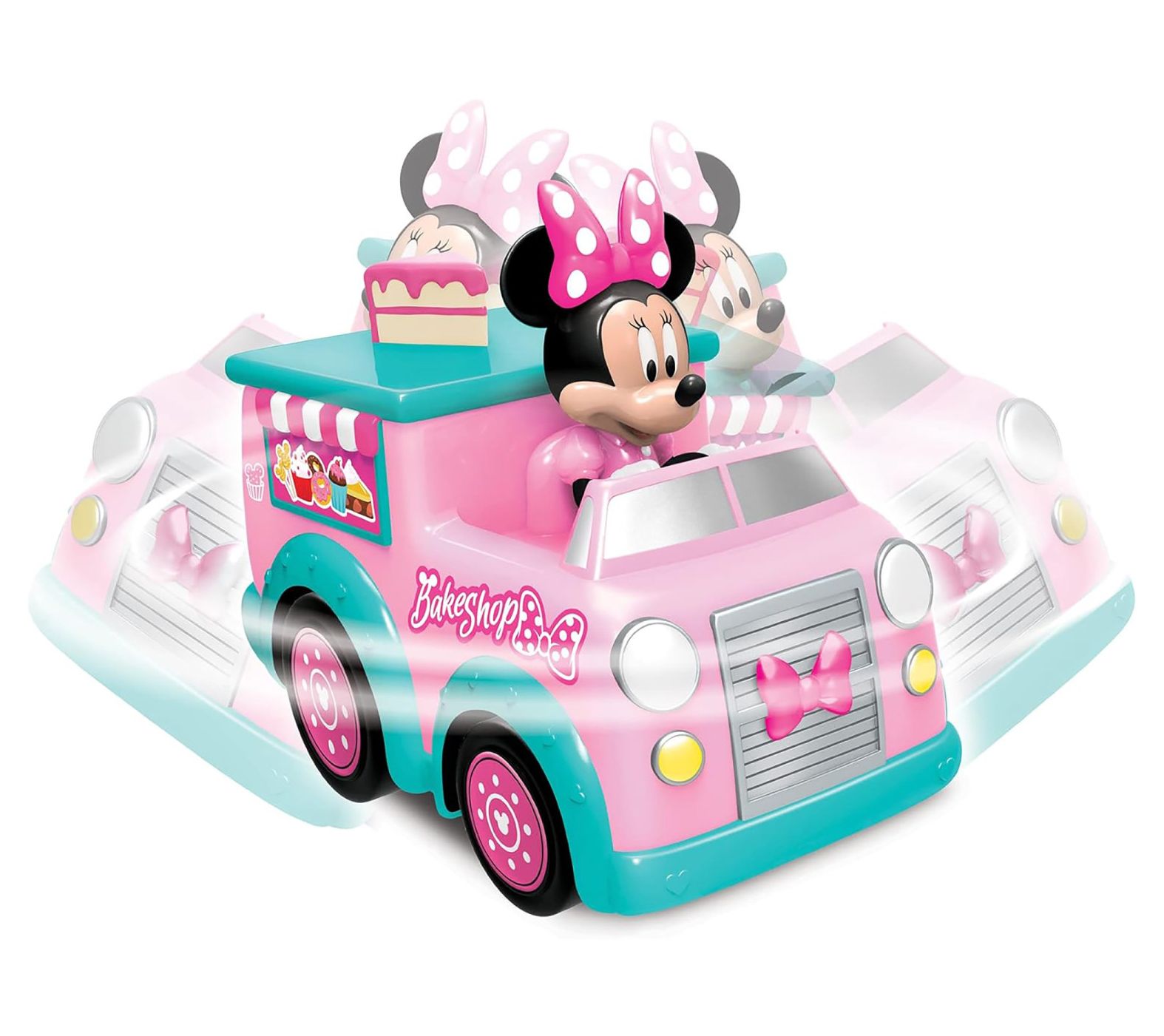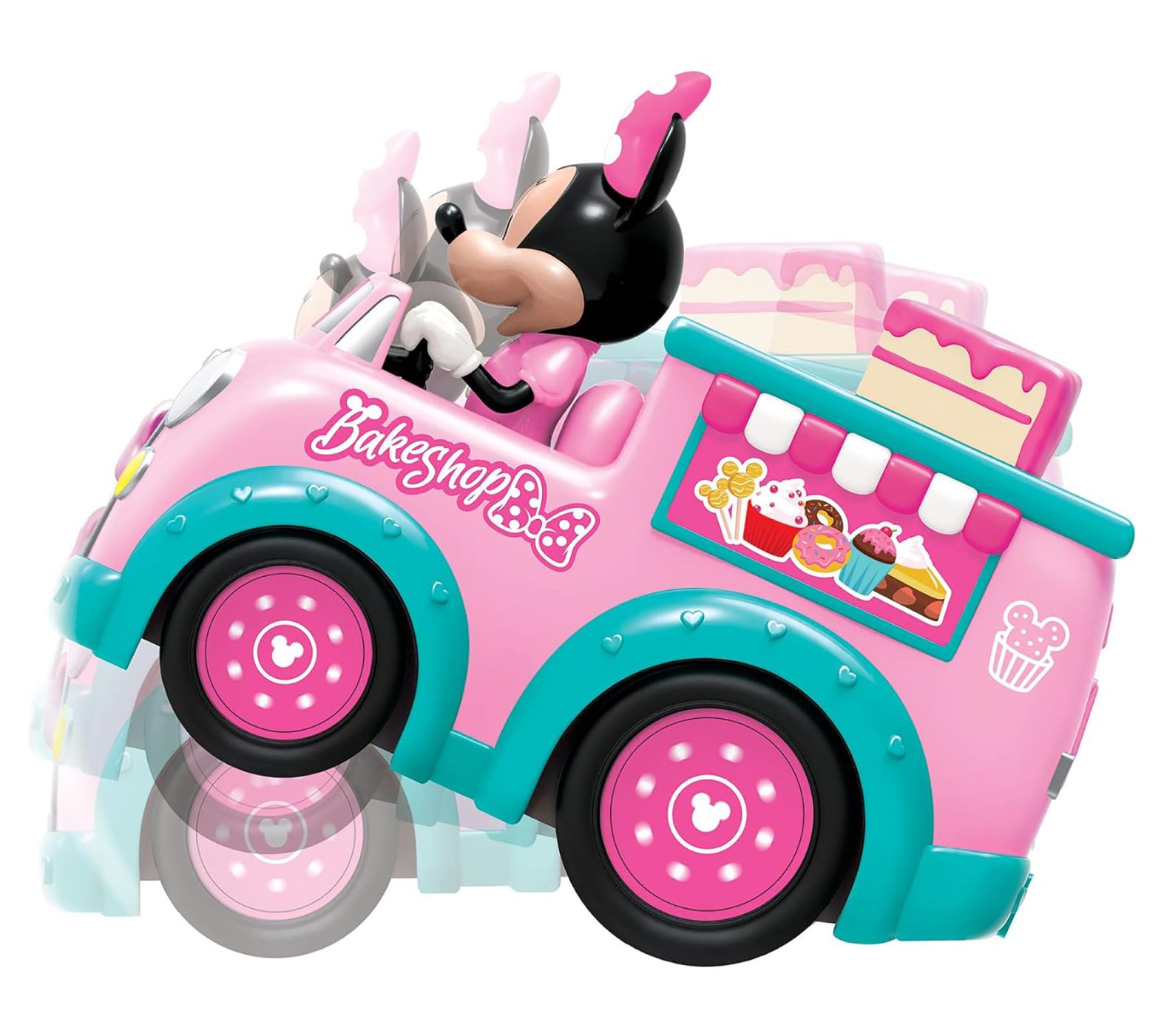 Send little imaginations on a delightful journey as Minnie's Bakeshop Truck zips, spins, and does wheelies at the touch of a button. Styled just like Disney Junior's Minnie Mouse, this remote control car brings bakery adventures to playtime with its iconic Mouse Ears remote and whimsical polka-dot details. From Disney.