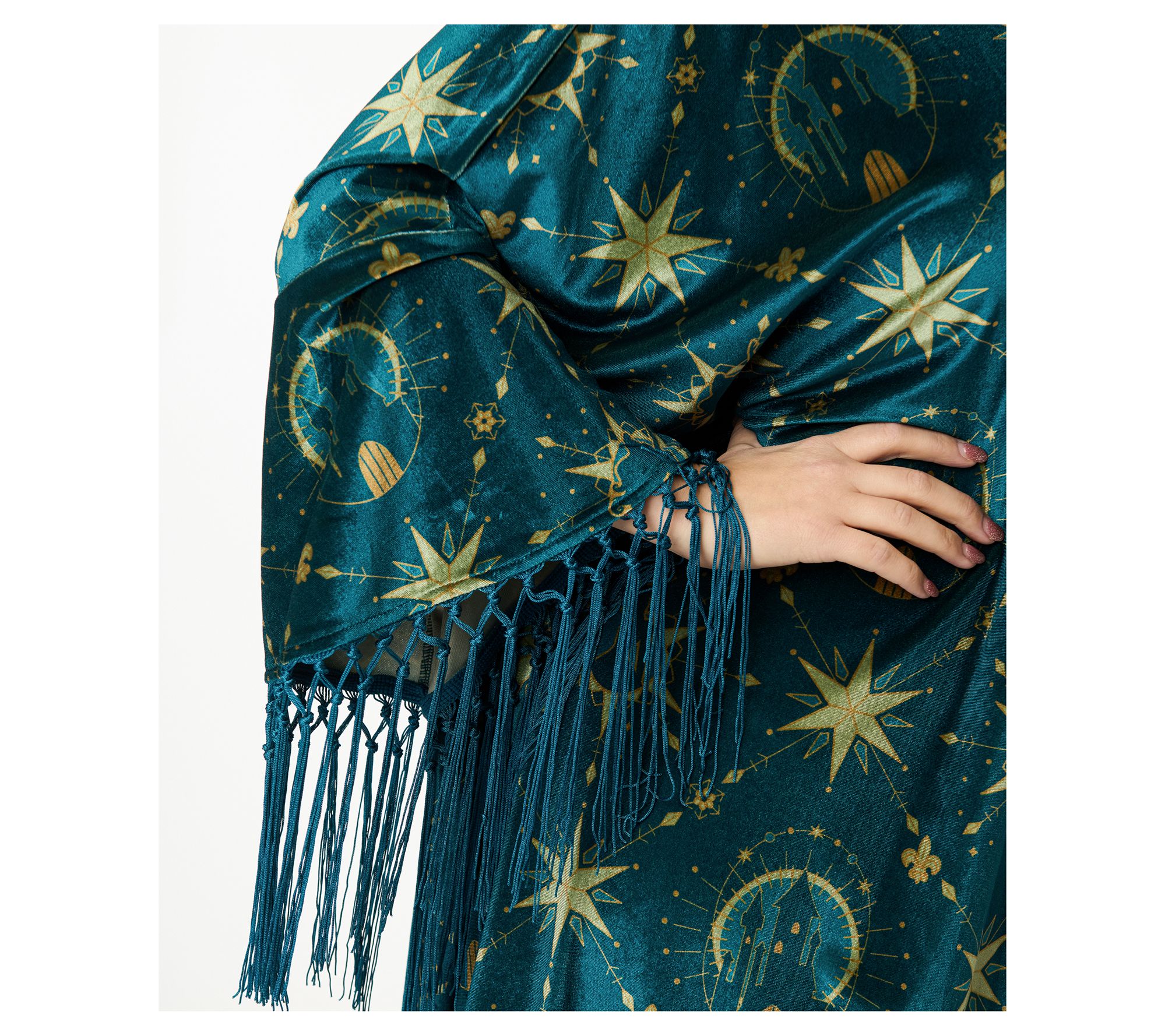 A velvet kimono adorned with a gold royal palace motif and playful fringe trim adds a whimsical twist to day or evening looks. Layer this long-sleeve piece over tees, dresses, or denim for an effortlessly chic style inspired by your favorite Disney tales. From Disney Princess Collection by Unique Vintage.