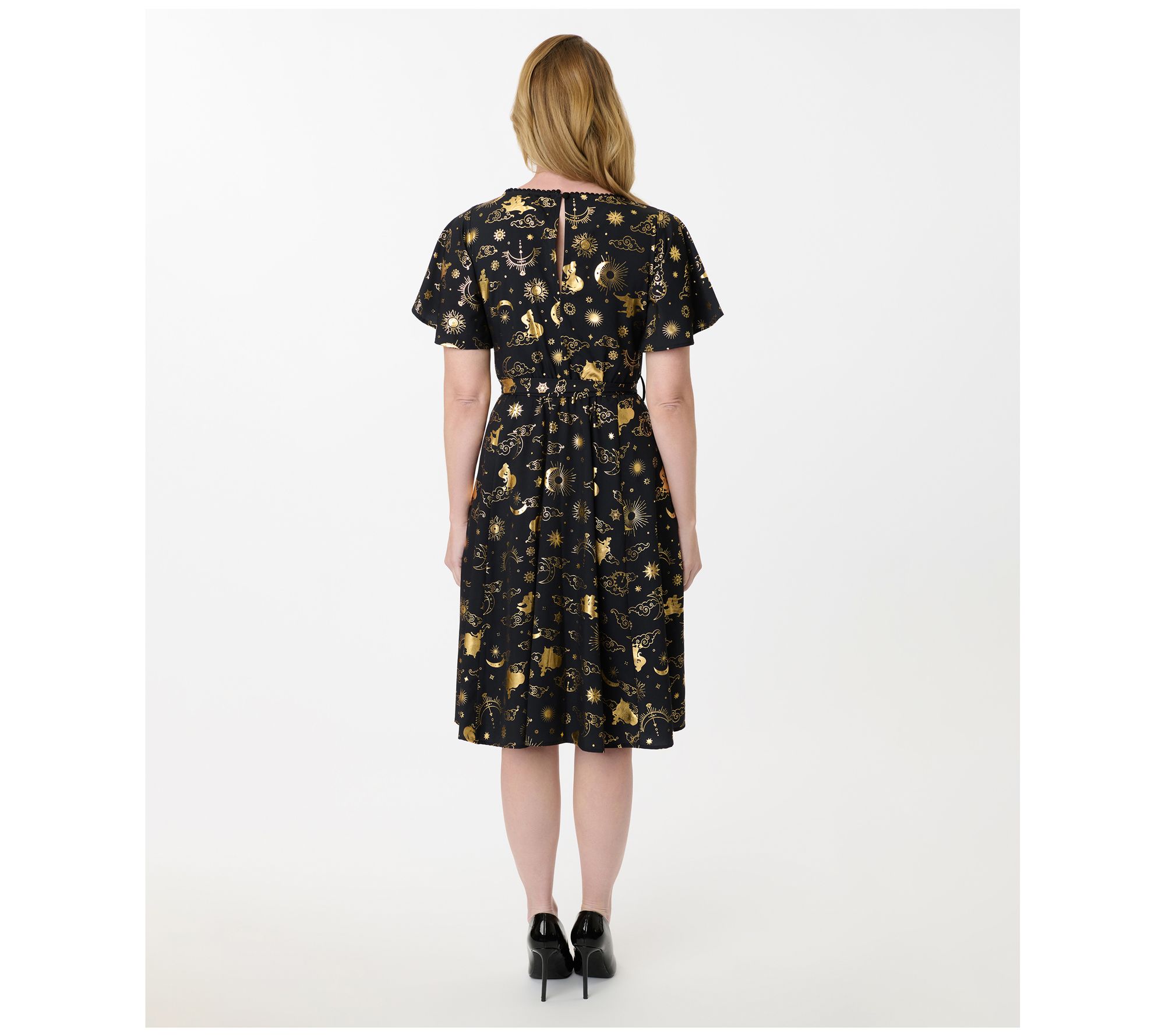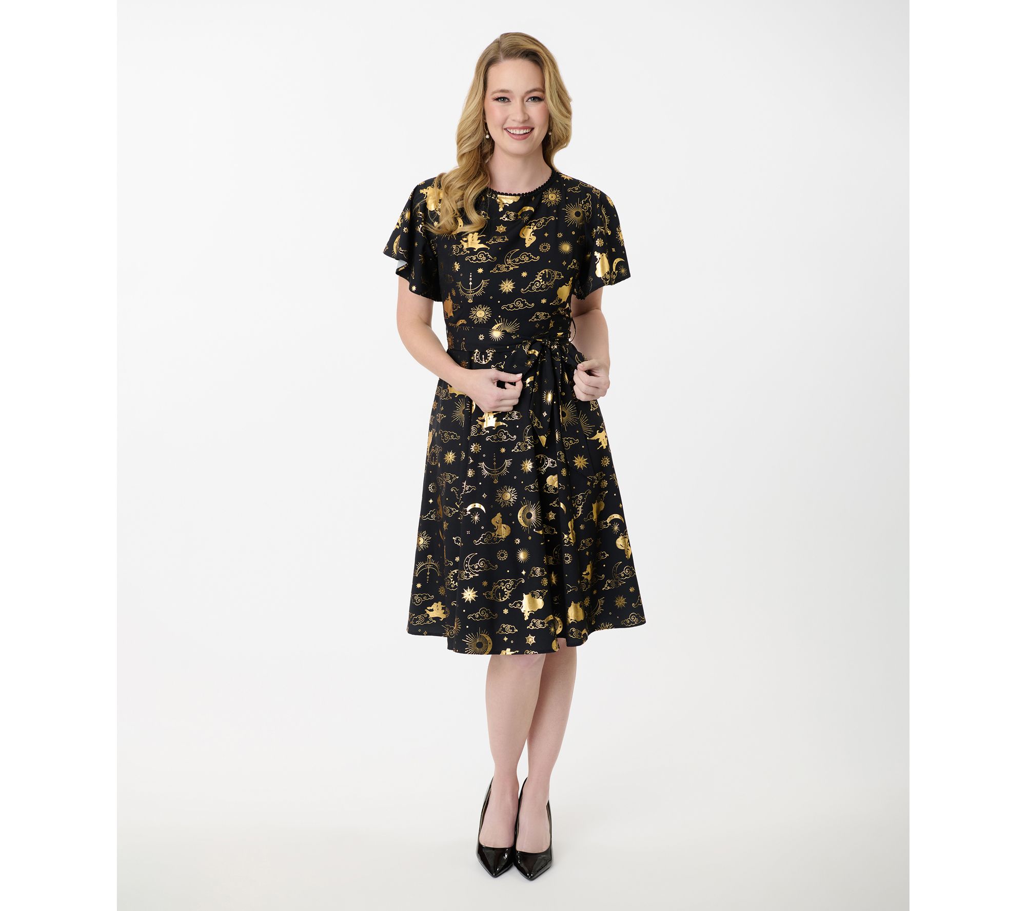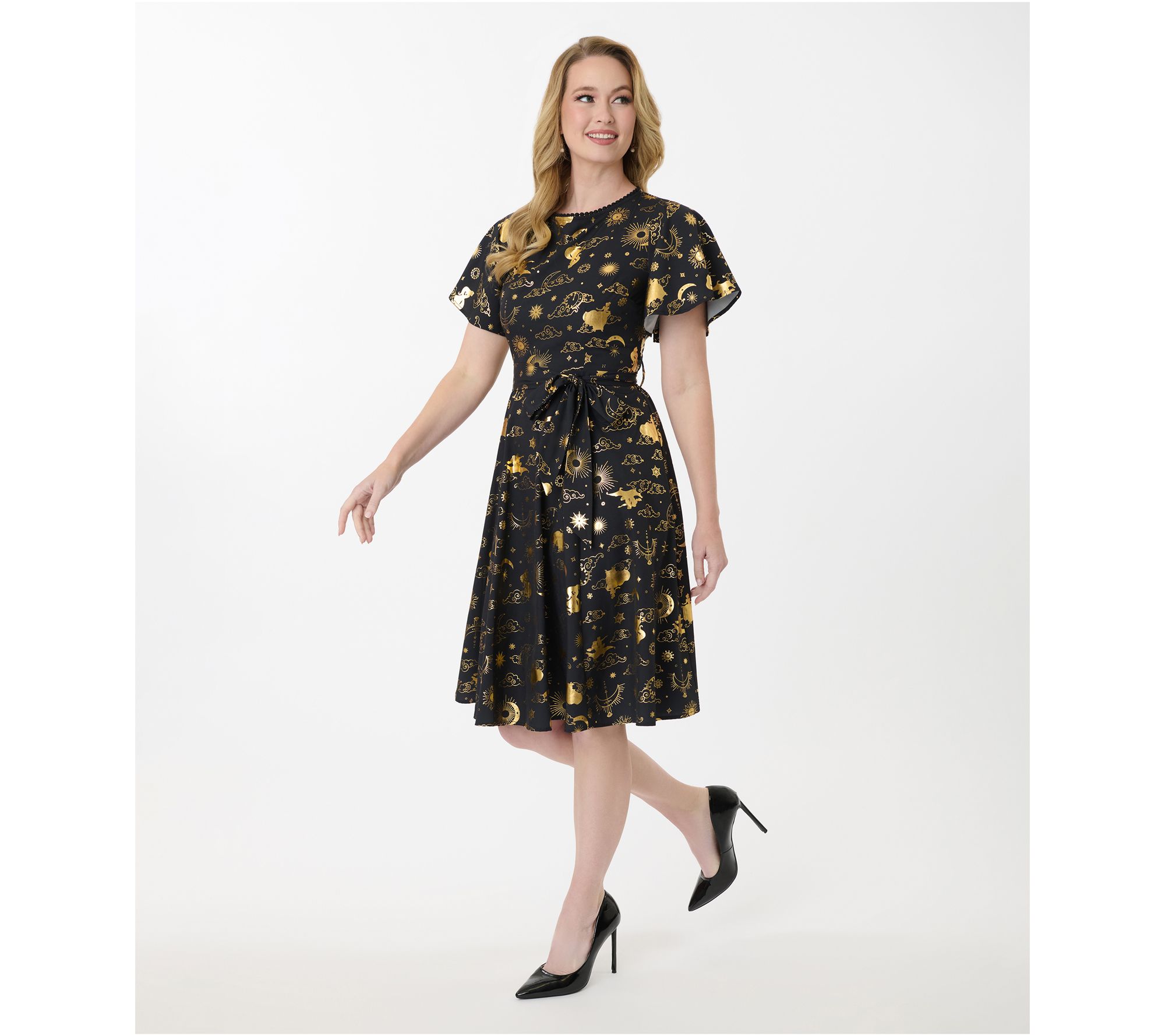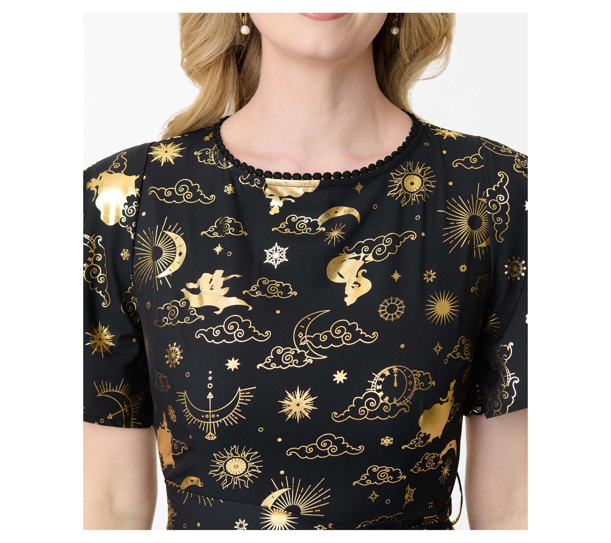 Throw on this dazzling A-line dress and let every moment feel like a royal celebration, whether you're headed to a themed party or simply want to channel enchanting vibes for a special night out. Shimmering gold princess details and flutter sleeves add a touch of magic to your look. From Disney Princess Collection by Unique Vintage.