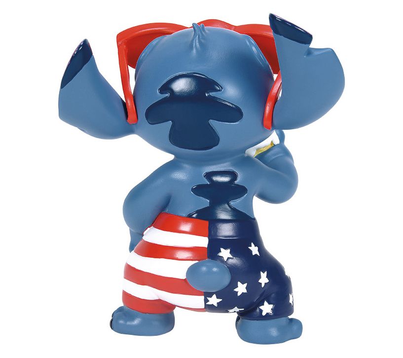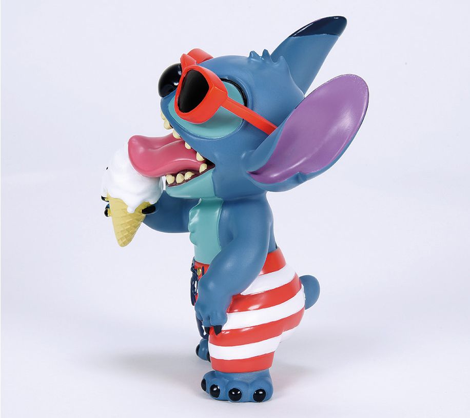 Enjoy the summer season with Disney's beloved Stitch in patriotic style. This charming figurine captures Stitch looking festive in Stars & Stripes shorts while indulging in a delicious soft-serve ice cream cone. A delightful addition to any collection or seasonal decor, perfect for celebrating warm, sunny days. From Disney.