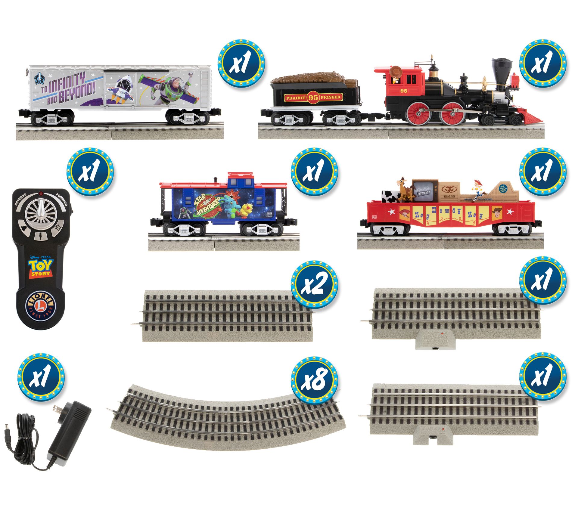 • Includes locomotive, tender, boxcar, chasing gondola, caboose, eight curved track sections, two straight track sections, FasTrack terminal section, plug-expand-play power lock-on section, wall-pack power supply, and remote