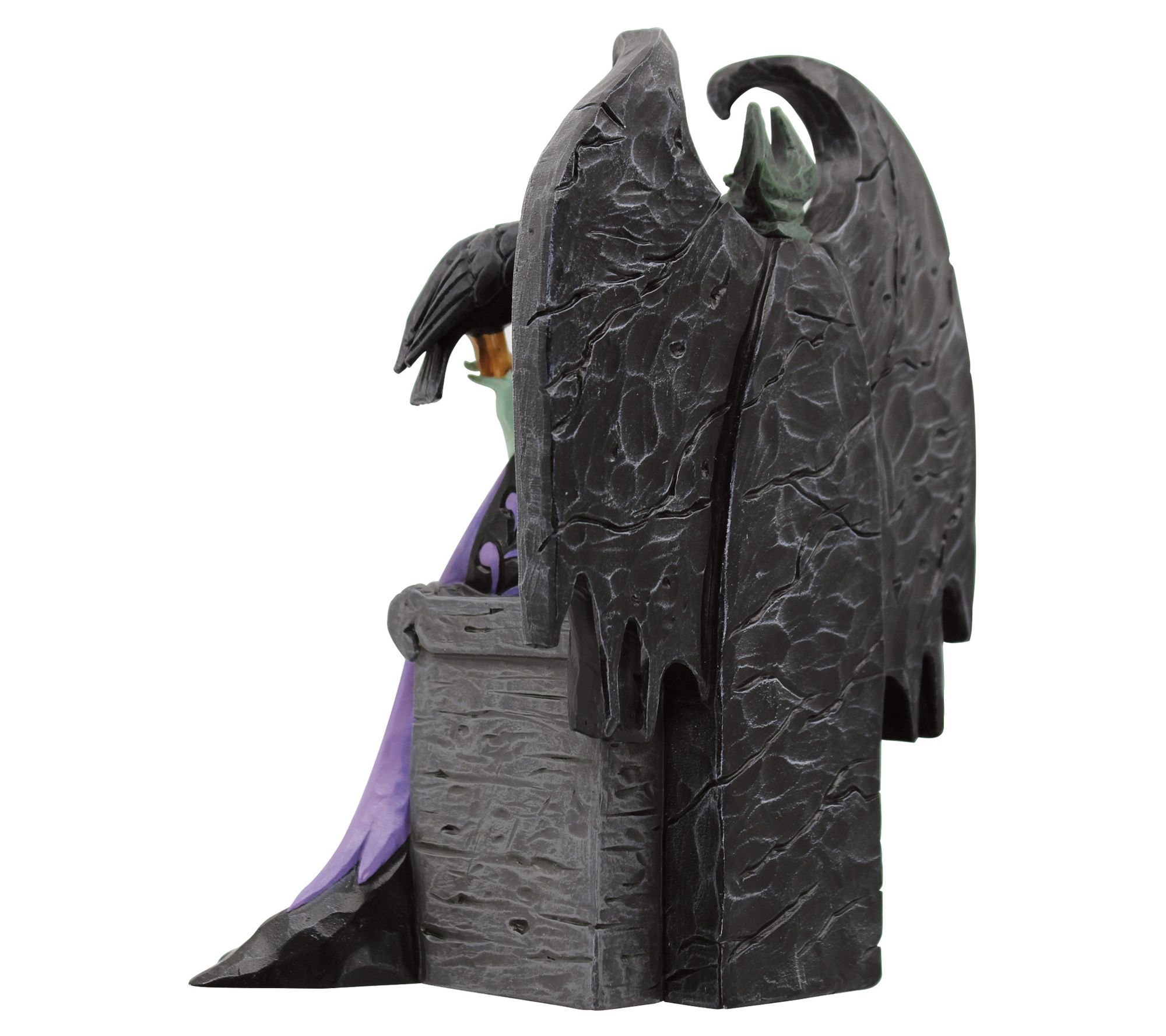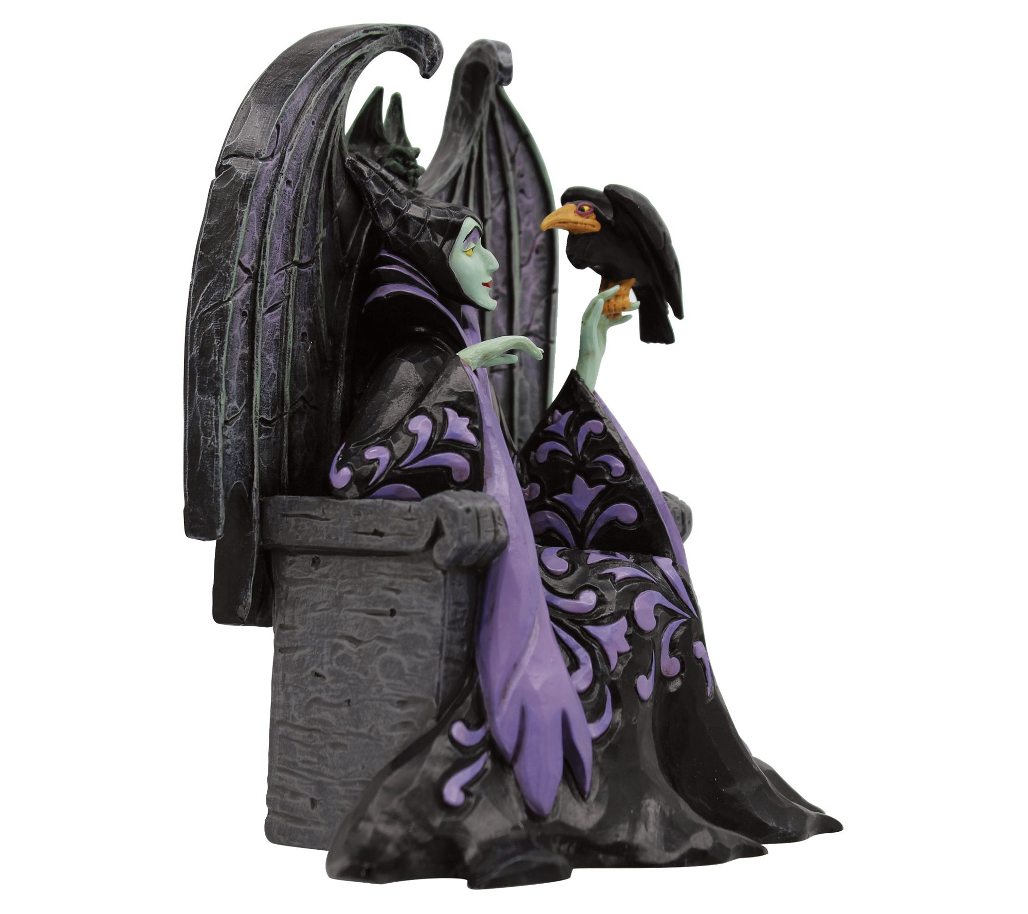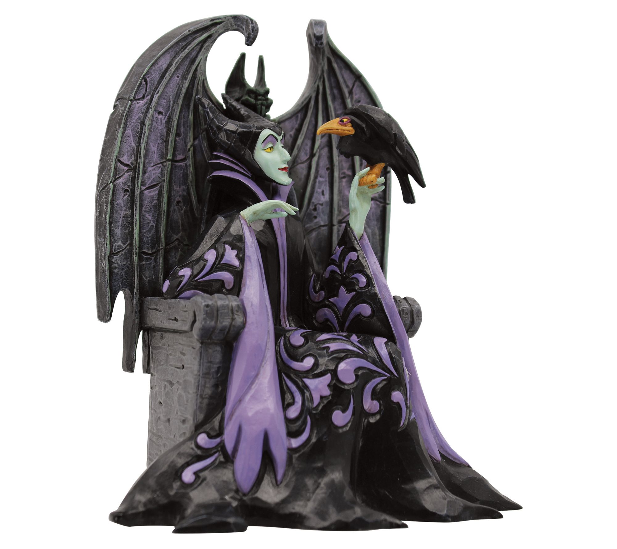 Celebrate the 65th anniversary of Sleeping Beauty with this gorgeous Maleficent figurine. This piece showcases the iconic character in her black robe, complete with purple rosemale patterning, as she commands her crow. It's a beautiful way to capture the essence of the beloved villain. From Disney Traditions.