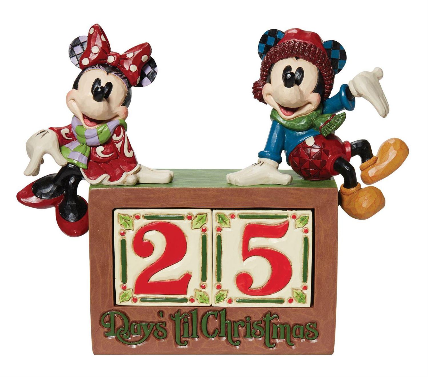 Track the days as your favorite holiday approaches with this colorful countdown calendar featuring the iconic Mickey Mouse and Minnie Mouse wearing festive winter outfits. From Disney Traditions.