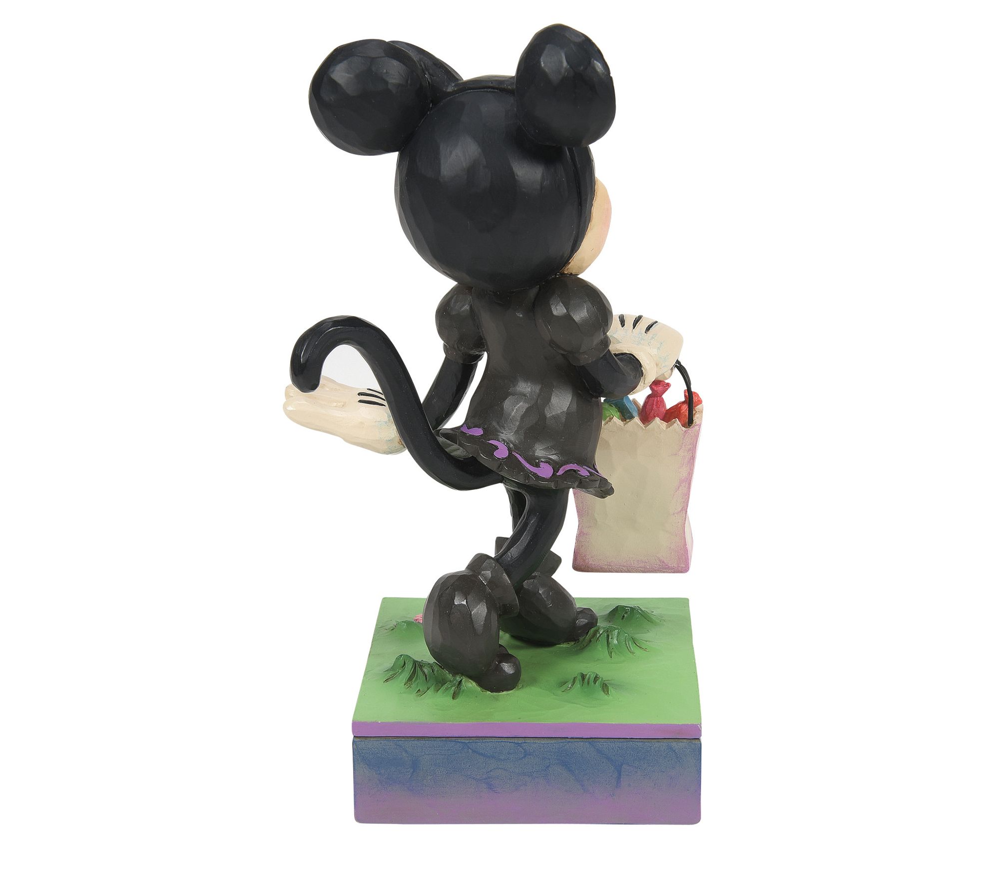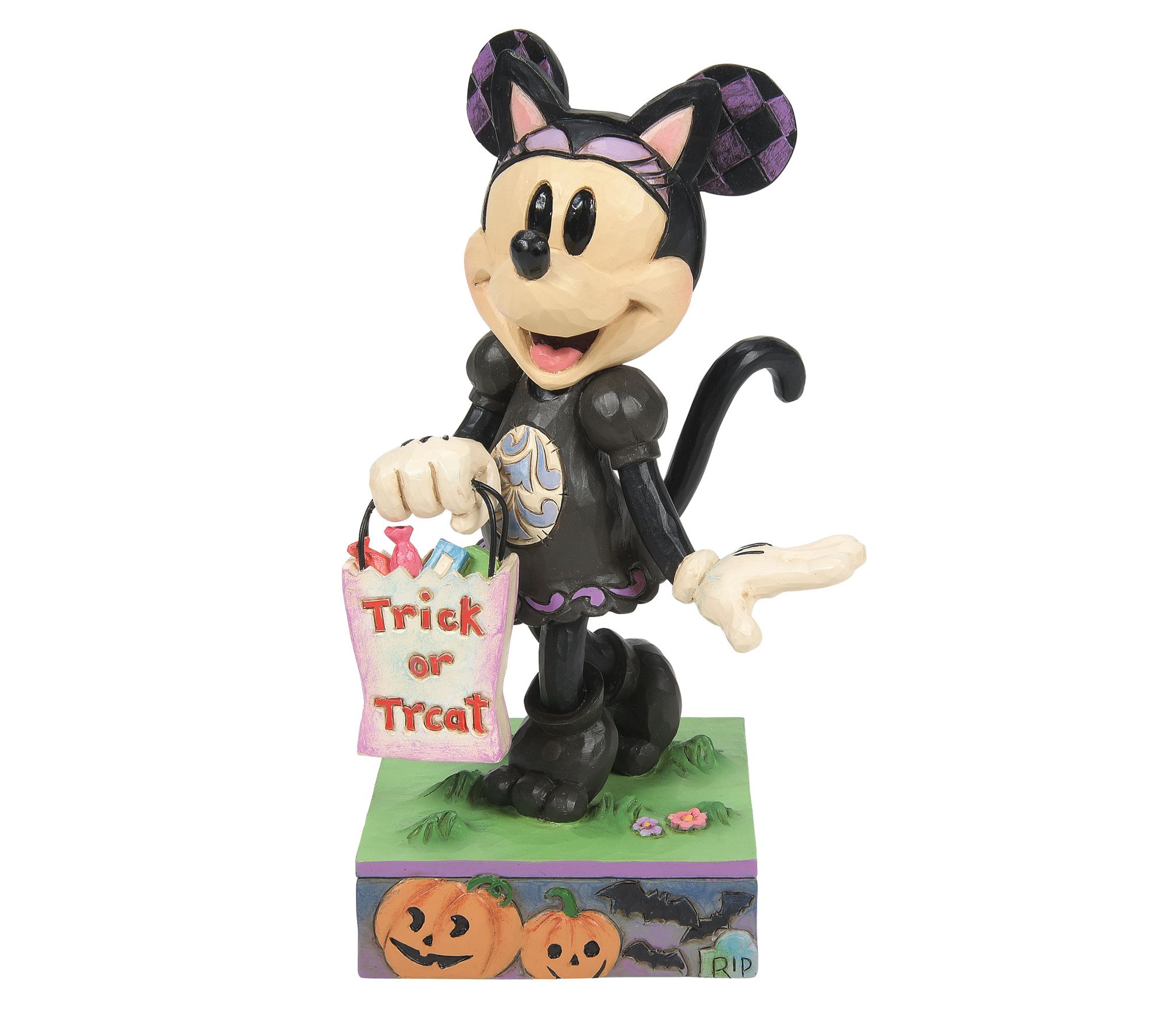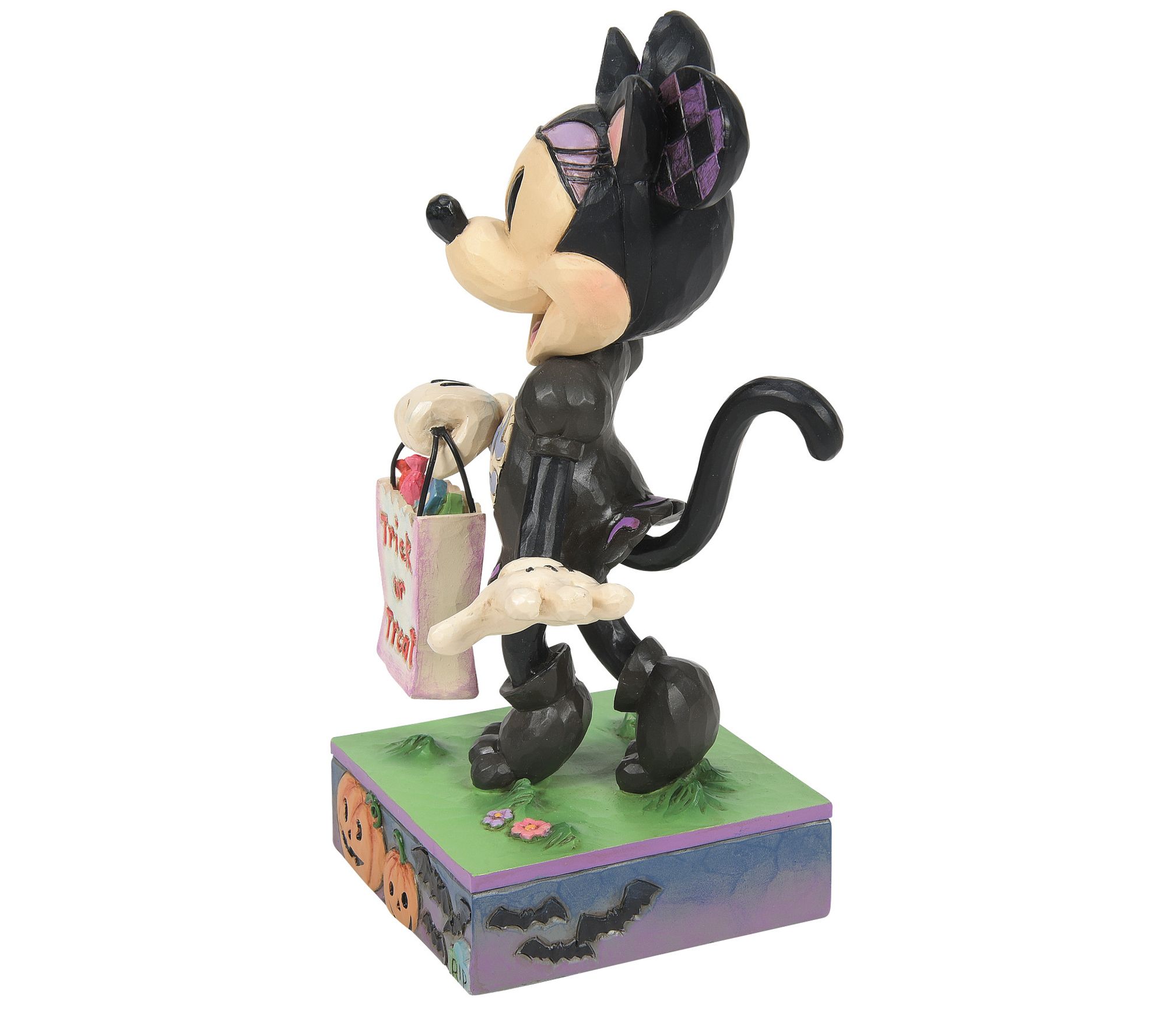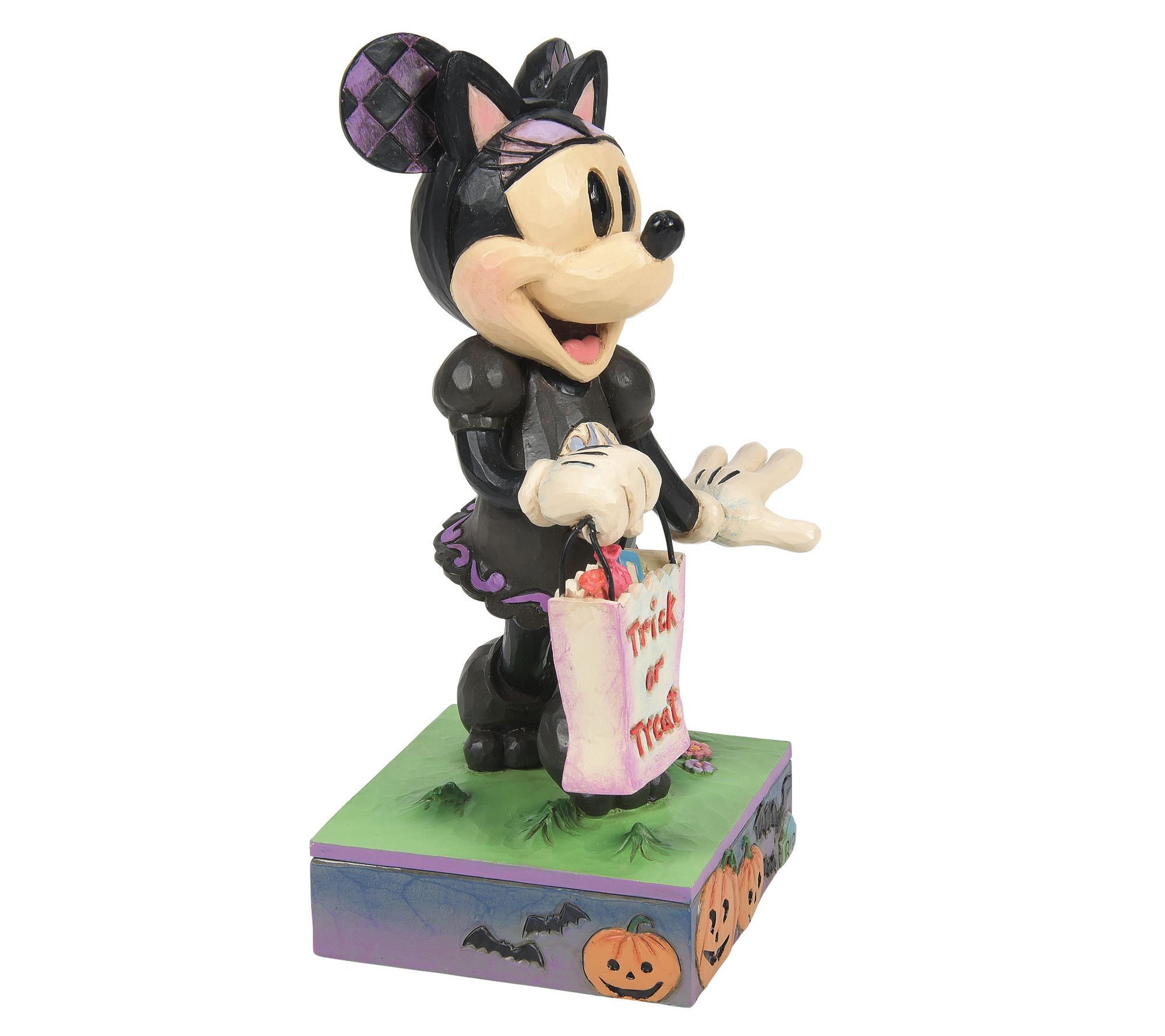 Bring a touch of Disney magic to your Halloween decor with the Disney Traditions Minnie Black Cat Costume Figurine by Jim Shore. Minnie Mouse, dressed as a black cat, stands amidst a whimsical scene of jack-o-lanterns and bats, ready to collect candy. From Disney Traditions.