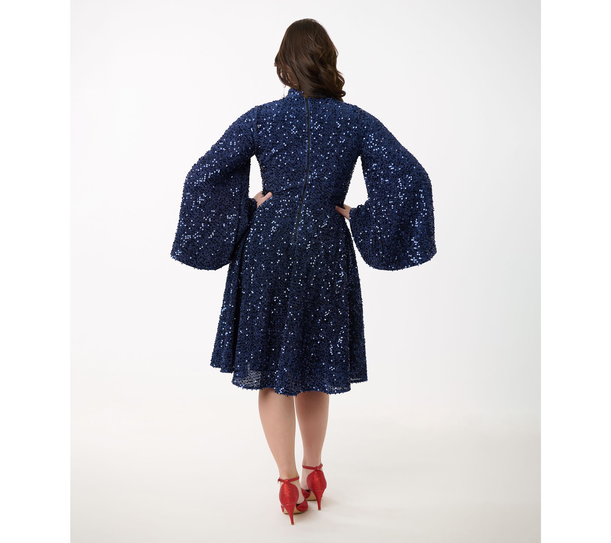 • Features: mock neckline, long bell sleeves, A-line silhouette