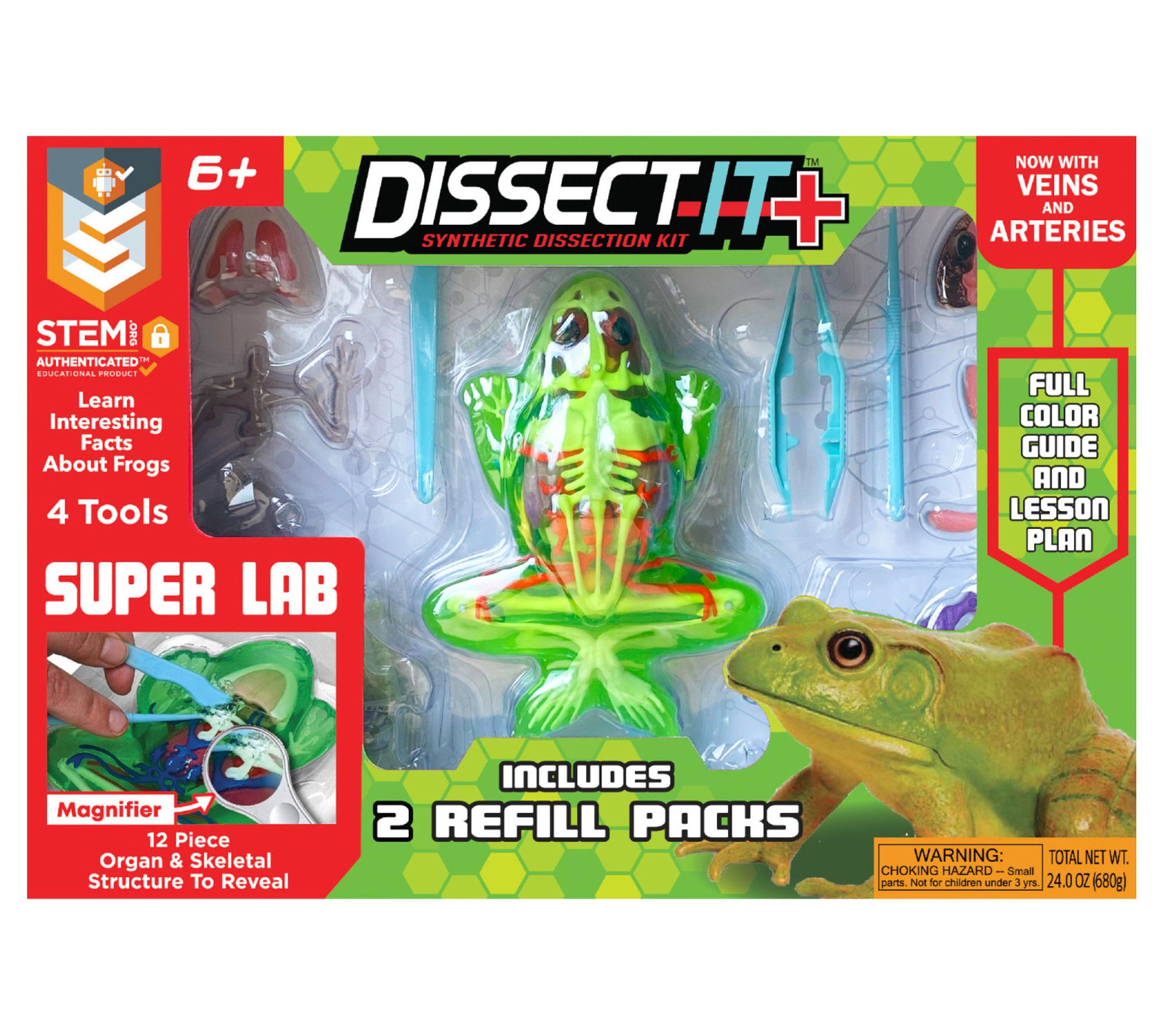 • Includes gelatin frog, dissection table, instructions, access to online learning plan, plastic tools, two refill kits, 10 organs, two veins, and arteries