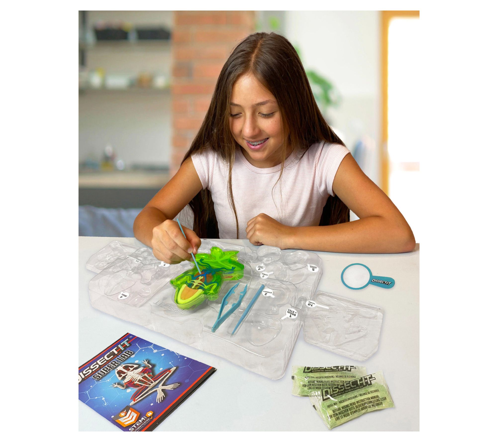 Turn your home into a science lab with the Dissect-It Deluxe Super Frog Lab. Designed for an educational and authentic experience, this kit features a life-like synthetic frog complete with veins, arteries, and organs. Kids will love learning about frog anatomy through hands-on dissection, all without the mess or smell of a real frog, perfect for curious minds eager to explore biology in a fun and engaging way. From Top Secret Toys.