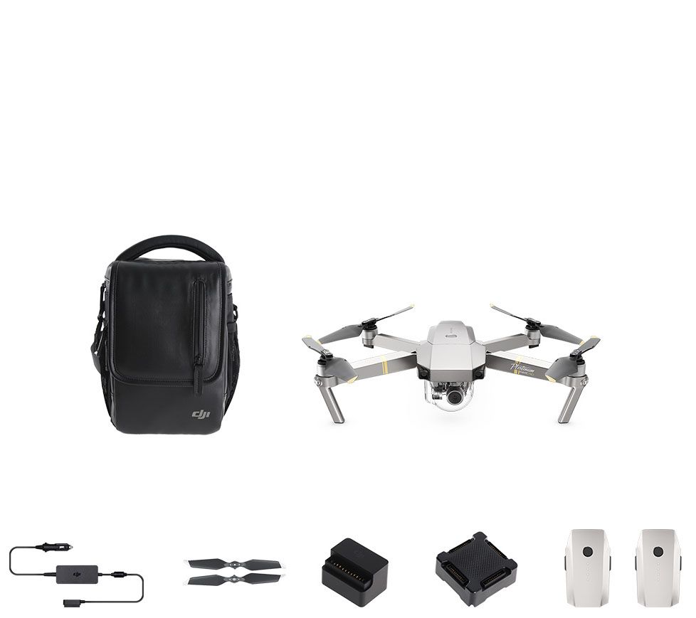 • Includes Mavic Pro drone with remote control, noise-reduction propellers, RC cable, two RC cable sliders, battery charger, AC power cable, gimbal clamp, 16GB microSD memory card; and micro USB cable, car charger, battery-to-power bank adapter, battery charging hub, and shoulder bag