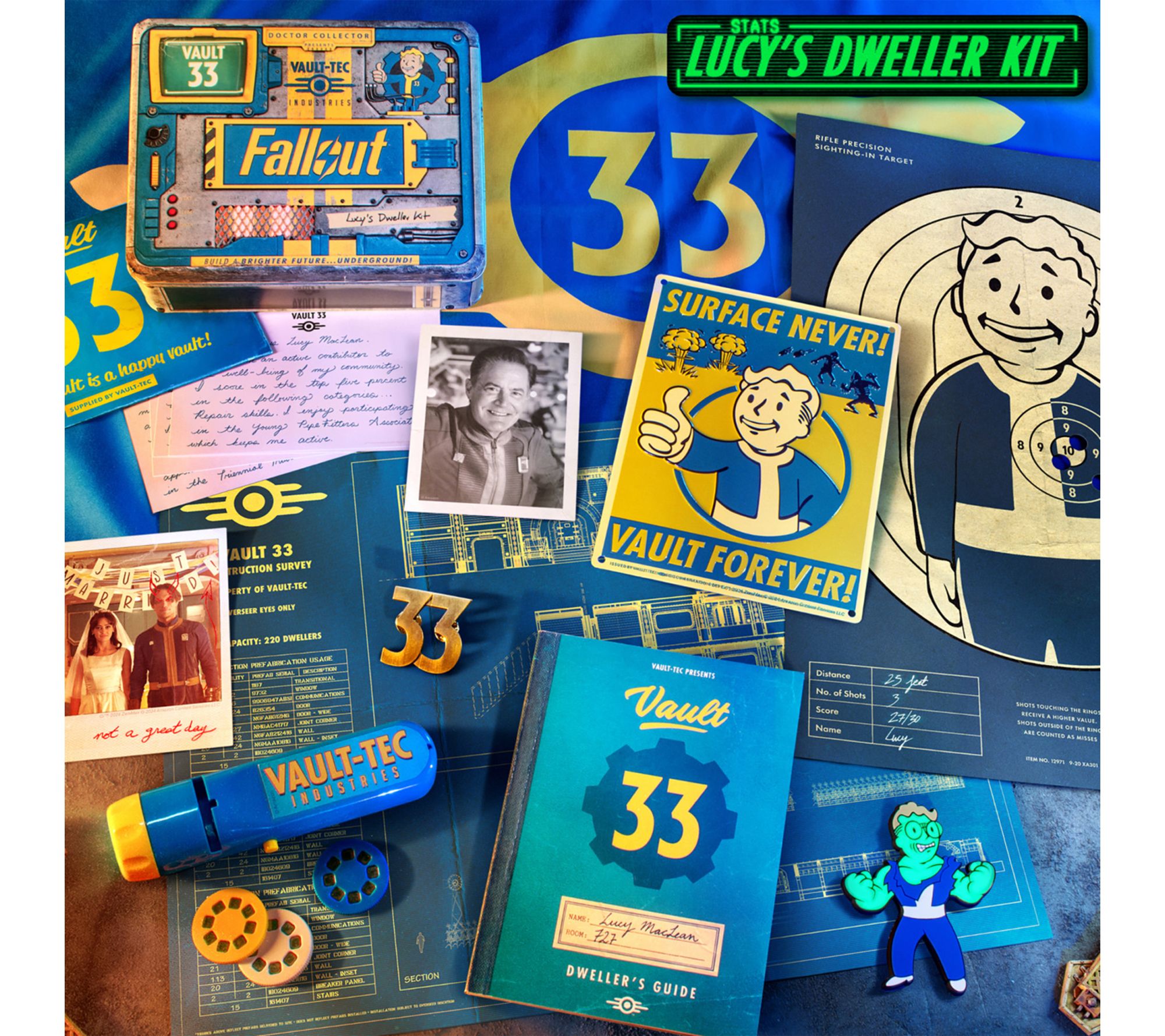 • Vault Blueprint Map (16.5" x 12.4"), Vault Boy bullseye target, Vault 33 envelope, and pin