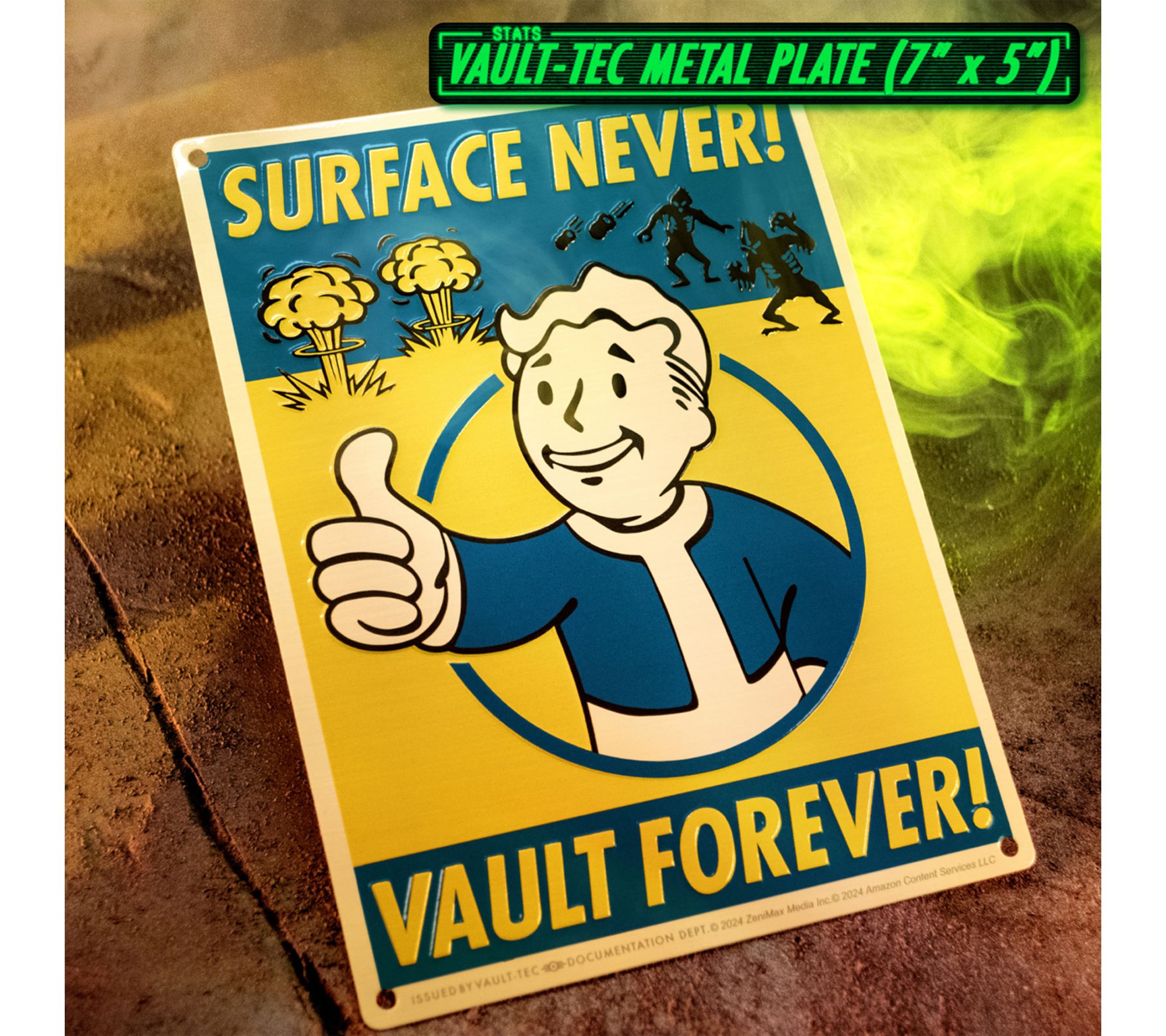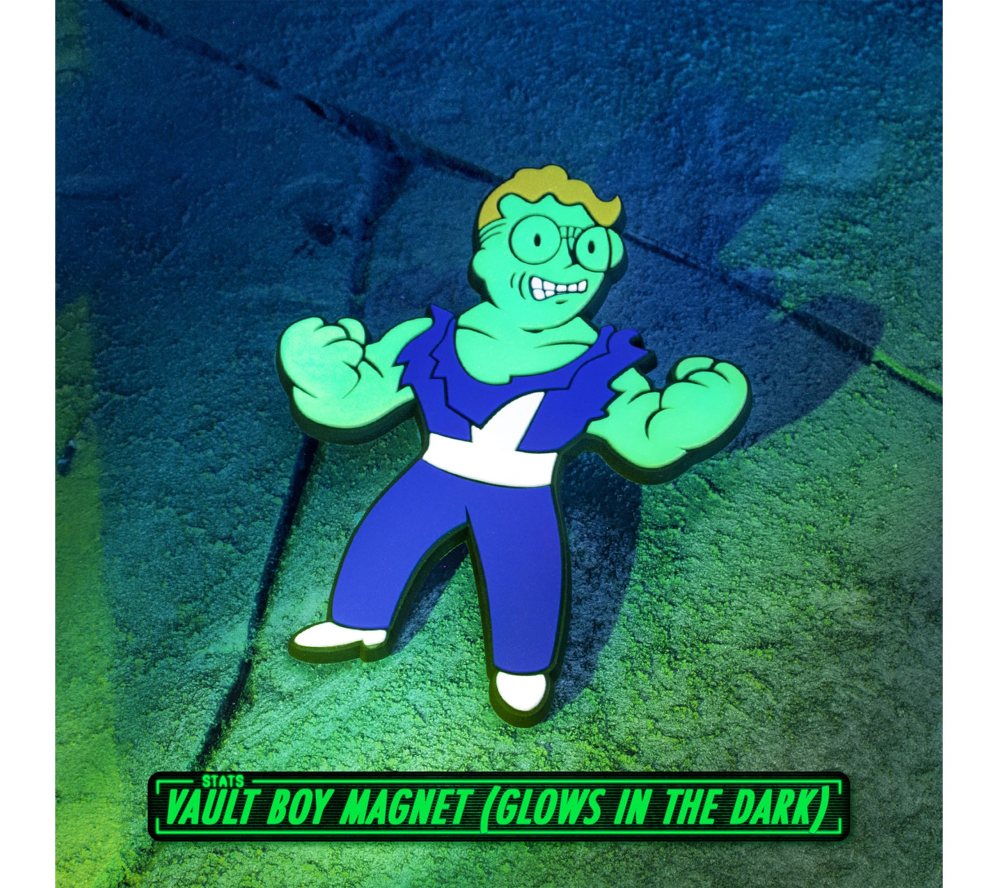 • Vault Boy magnet glows in the dark; Vault 33 flag and metal plate for display