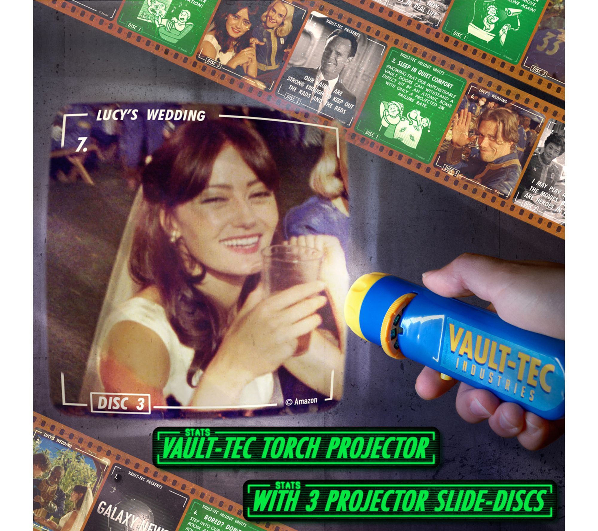 • Vault-Tec torch projector (batteries not included) and three slide-discs for immersive adventures