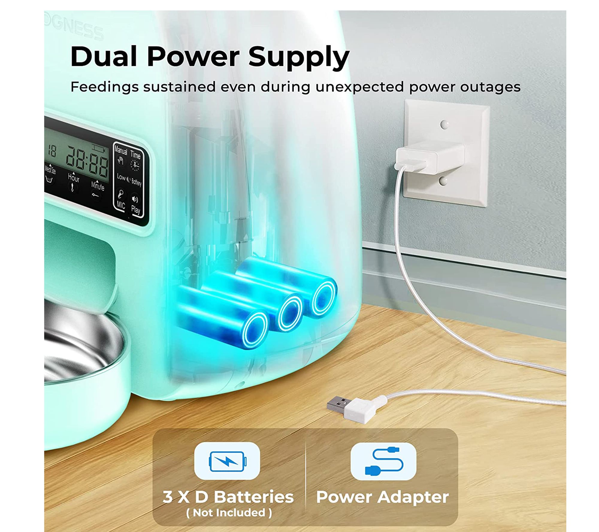 • Includes feeder, USB power cable, USB power adapter, and stainless steel bowl