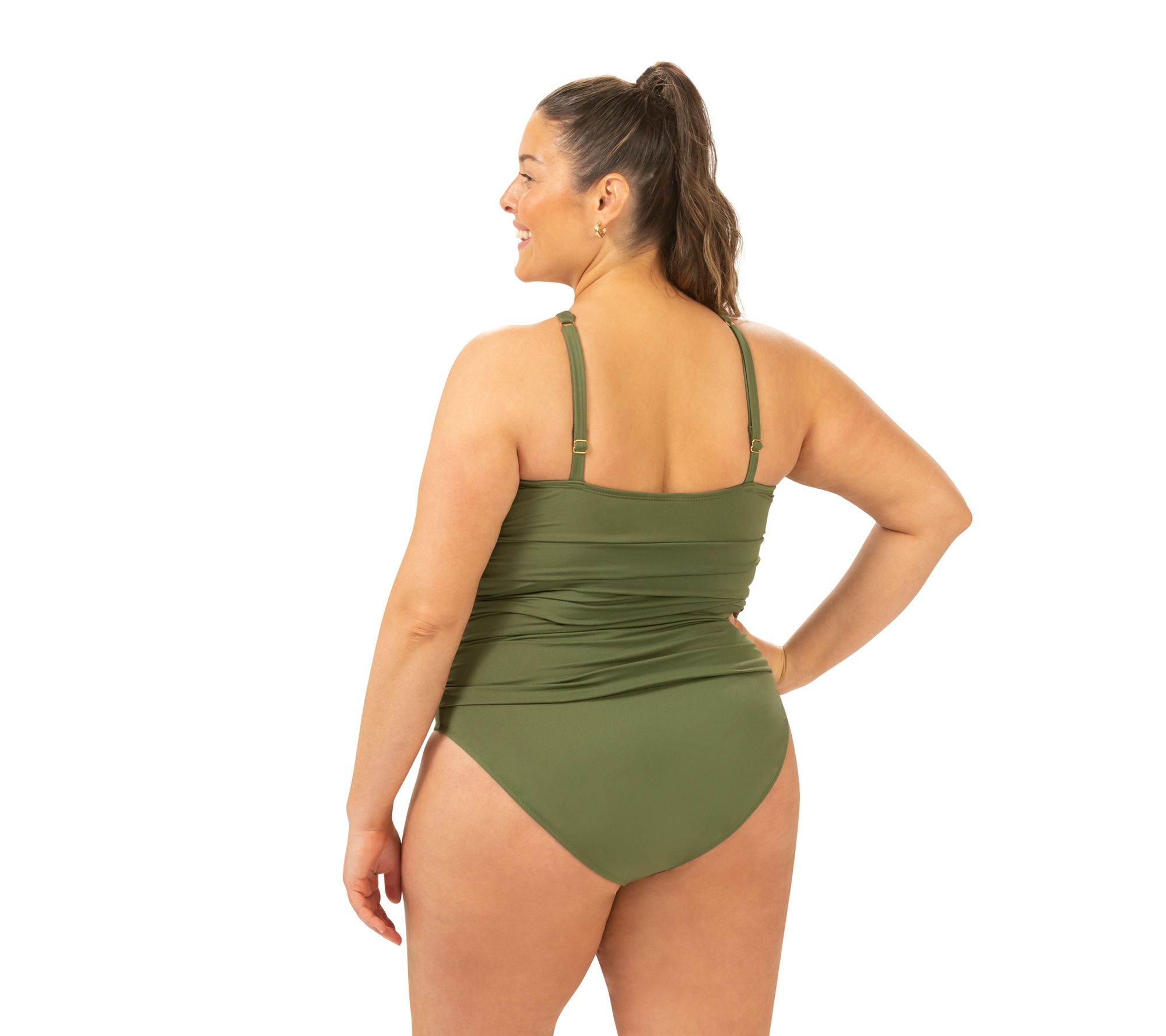 • Features: halter tank style, keyhole neck, front and back ruching, adjustable straps, removable cups, lined, contemporary leg cut