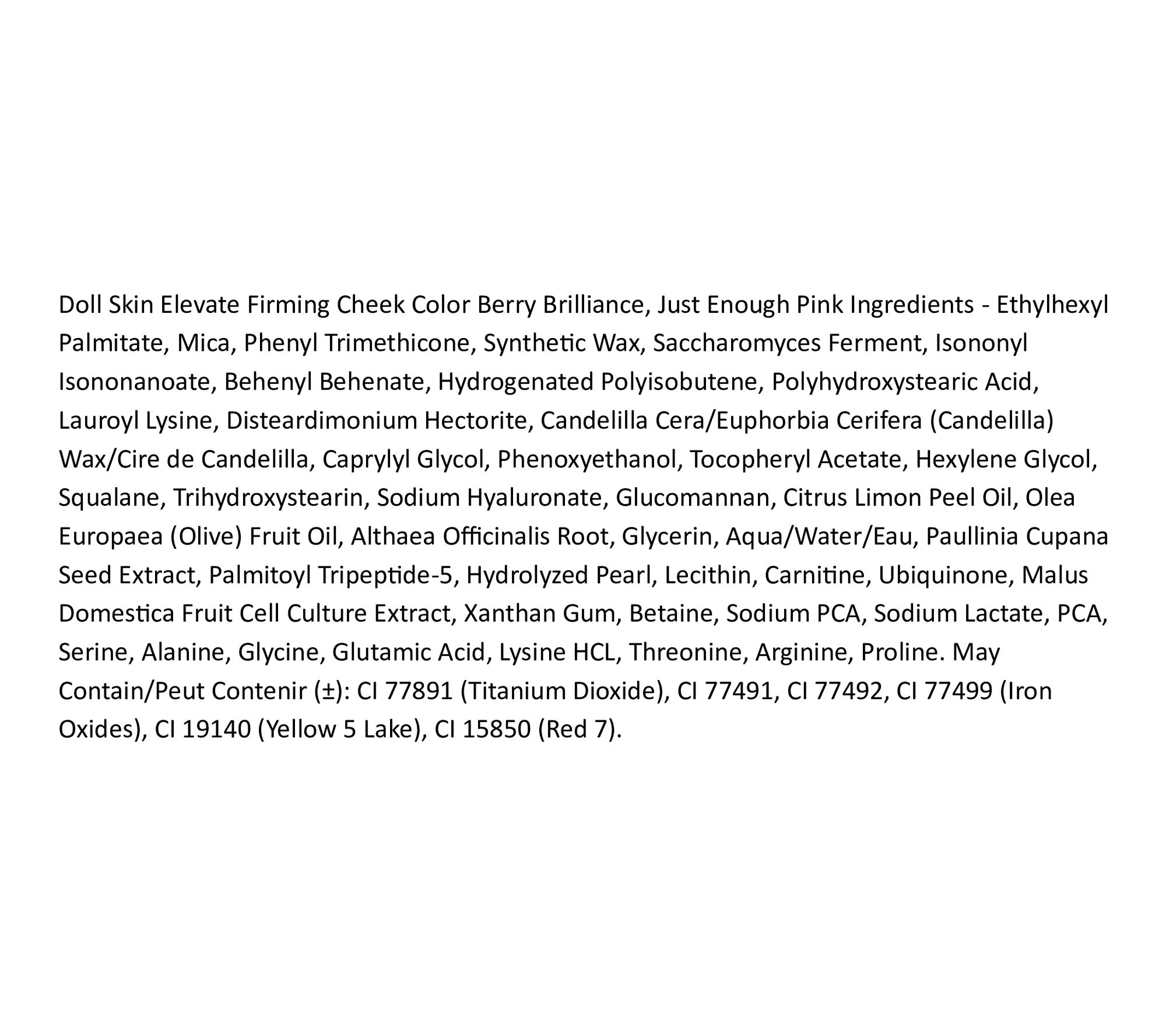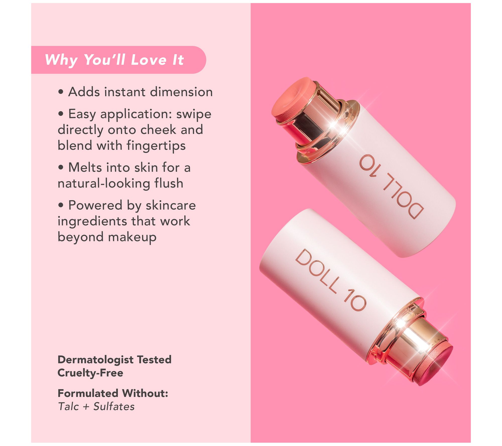 Your shortcut to a healthy-looking, radiant flush. Doll Skin Elevate Smoothing Cheek Color is a creamy balm that melts into skin to deliver hydrating color on the go. The breathable, buildable formula blends seamlessly for a natural-looking finish that looks like your skin-only brighter. More than just a blush, this multitasking stick is powered by guarana extract, marshmallow extract, and coenzyme Q10. The mistake-proof, cream-to-powder formula brightens the look of your complexion in seconds and can be used as blush, contour, or highlight for instant dimension.