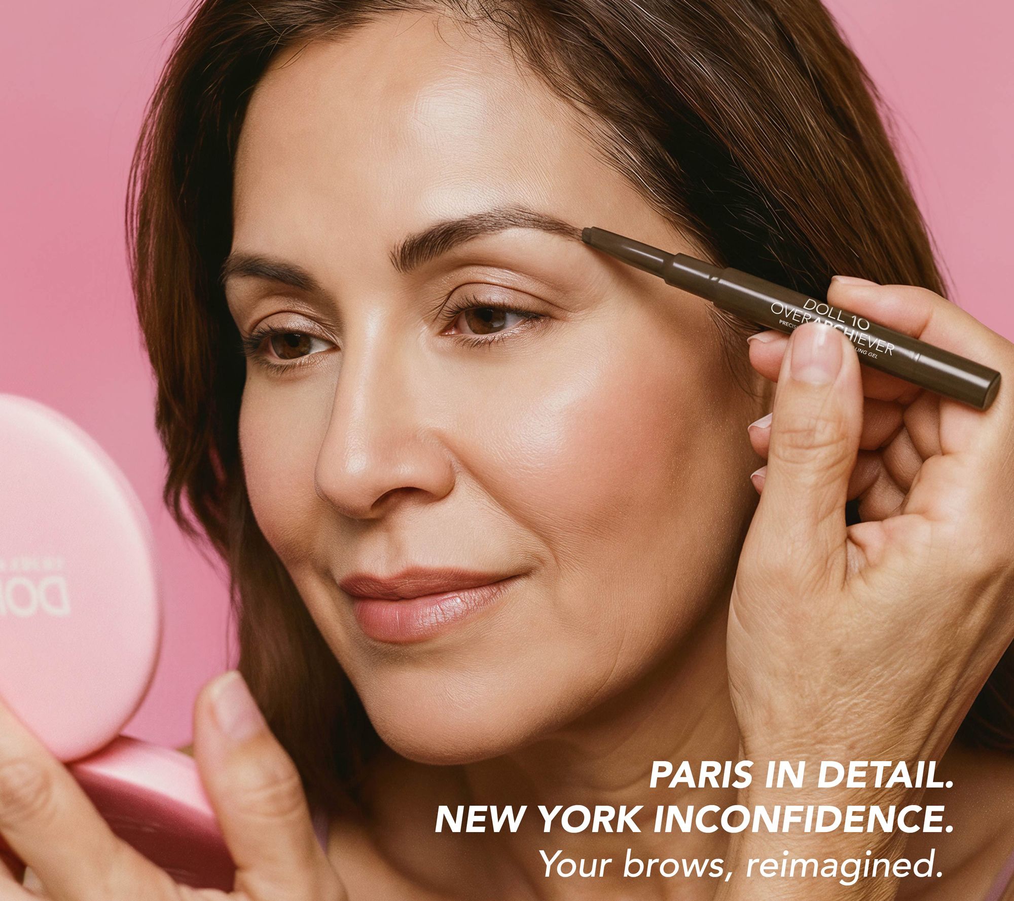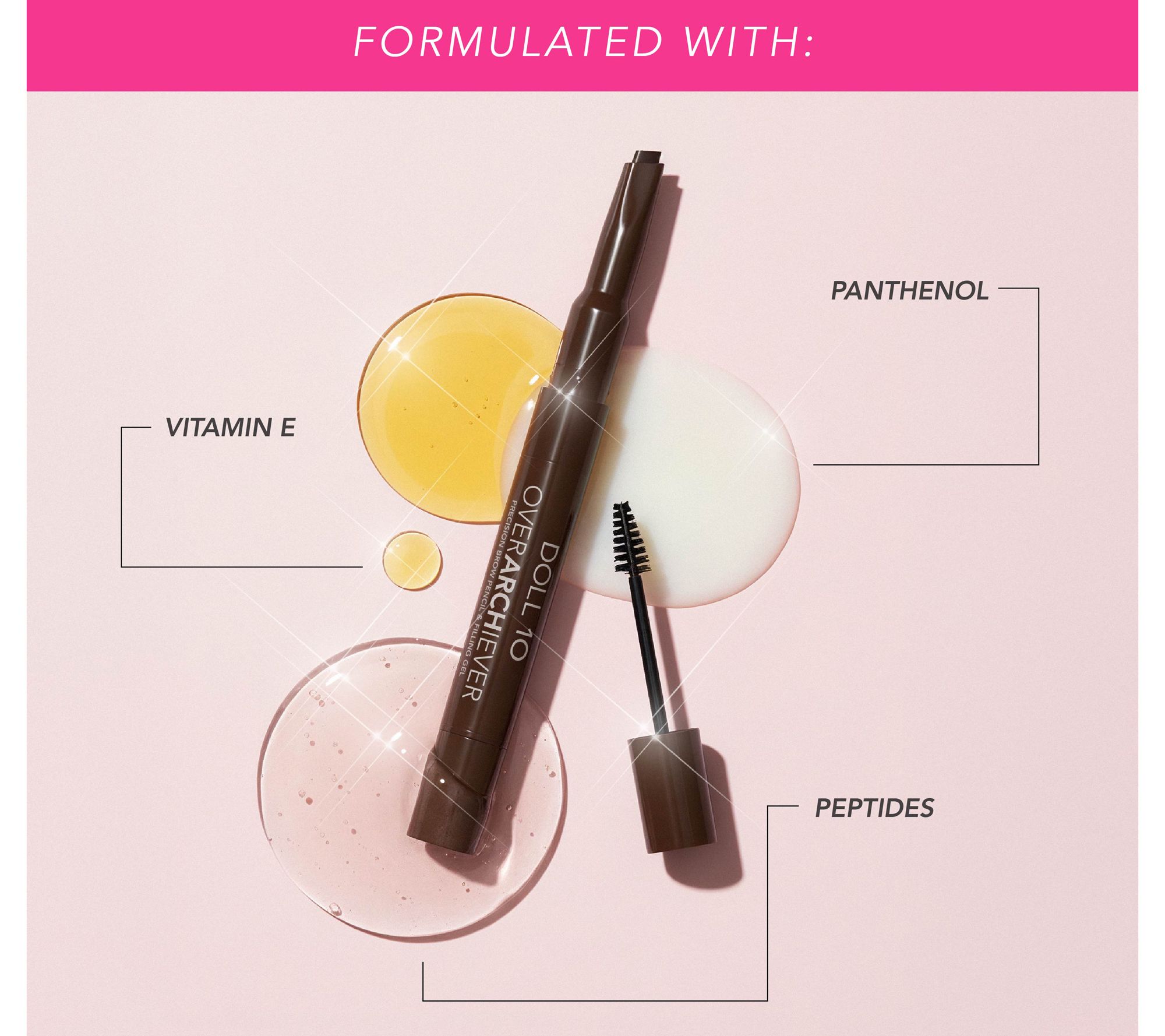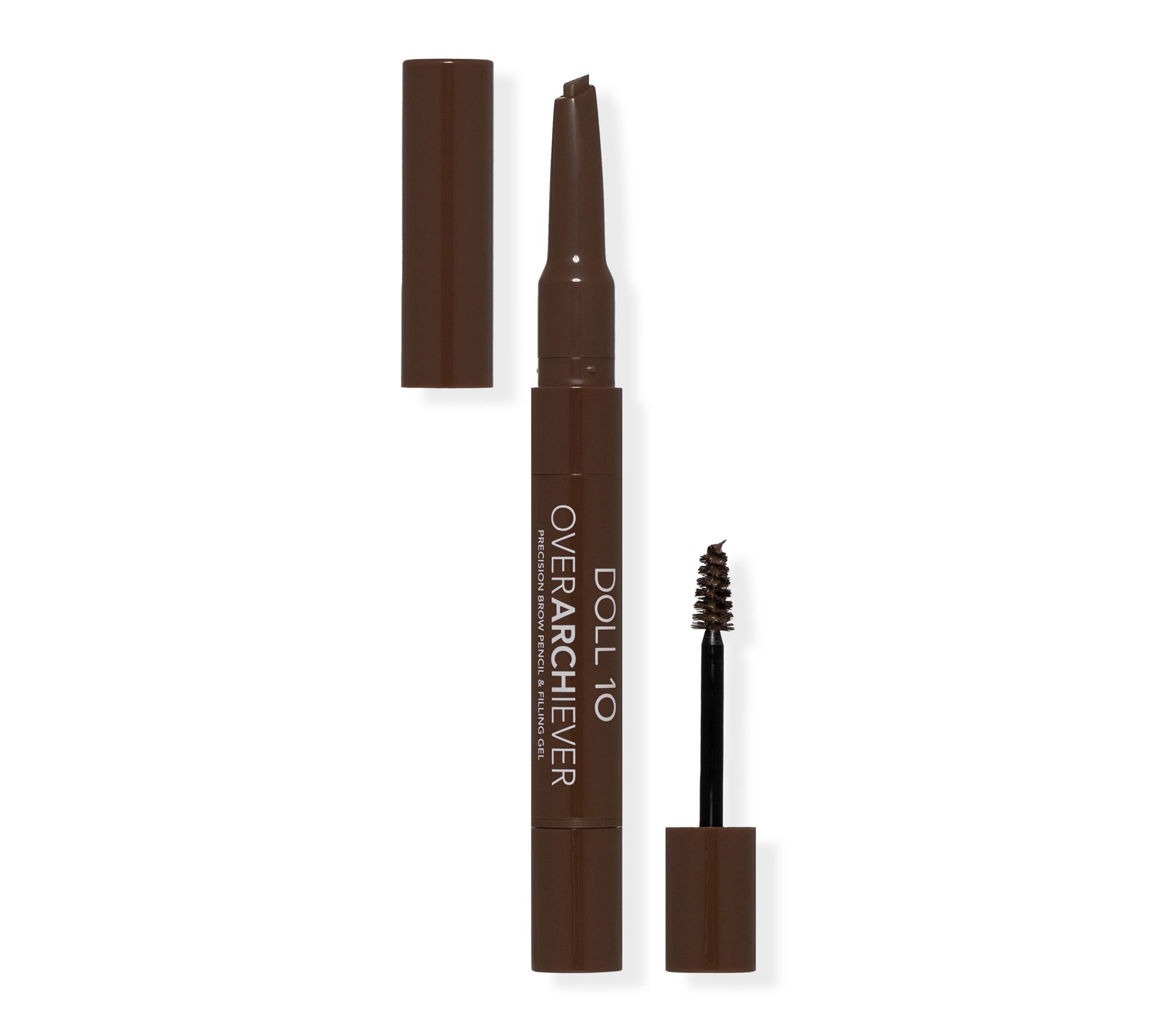 Doll 10 OverARCHiever Precision Brow Pencil & Filling Gel is a brow duo that fills in and evens out the appearance of your brow shape with the look of a realistic hair-like finish. It features a hybrid 2-in-1 primer and powder micro pencil to enhance grip on the brows and a conditioning brow-filling gel.