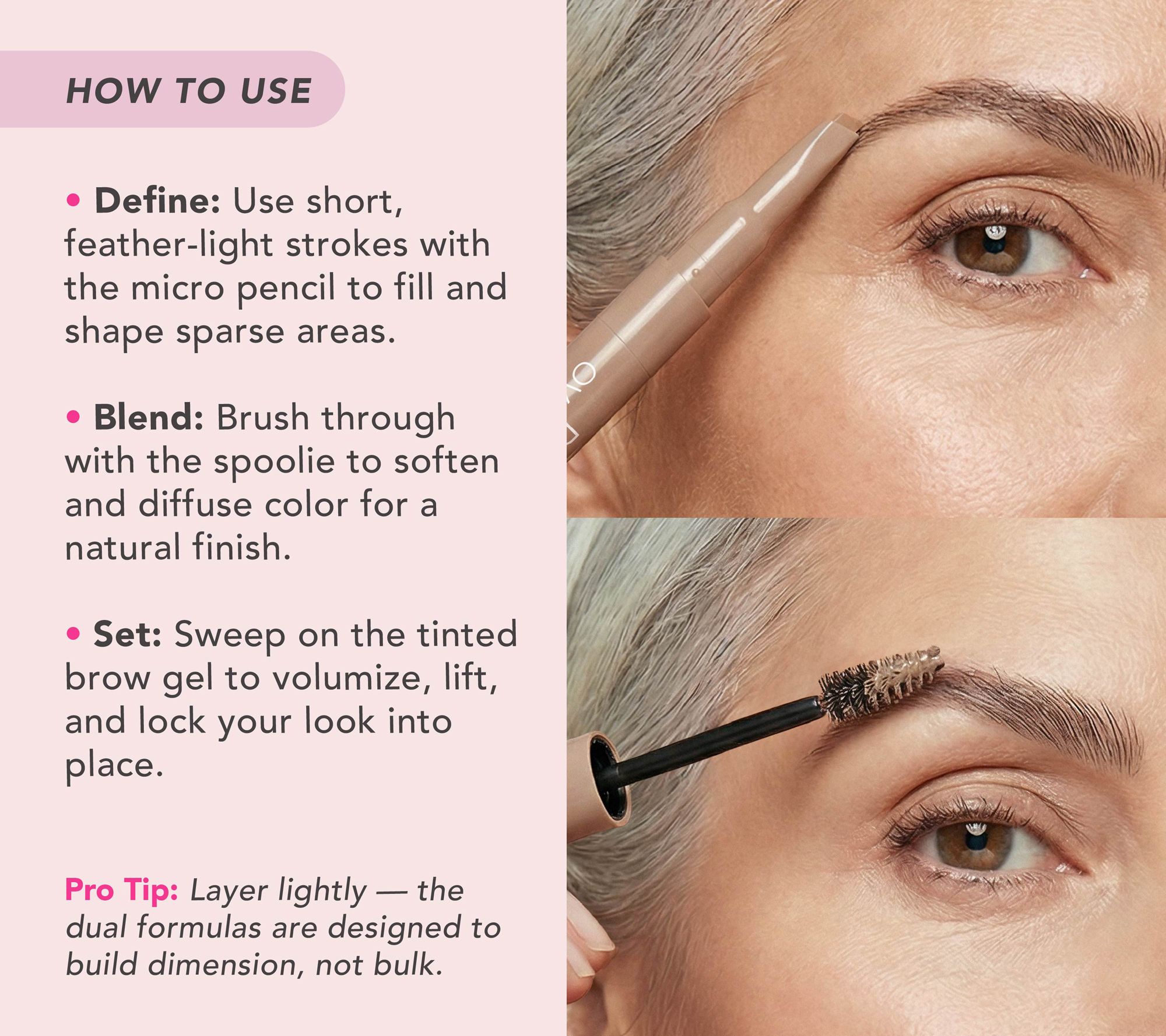 This brow duo fills in and evens out the look of your brow shape with the appearance of a realistic, hair-like finish. It features a hybrid two-in-one primer and powder micro pencil to enhance grip and wear-time on the brows and a conditioning, brow-filling gel. The micro brow pencil transforms the look of your brows in just one swipe, while the brow gel grooms brows and adds incredibly natural-looking hair-like strokes that volumize and define the look of brows. Each formula helps to nourish your brow hair and get you dolled up in 10 minutes or less! This duo helps fill in the appearance of eyebrows in a completely natural-looking way.