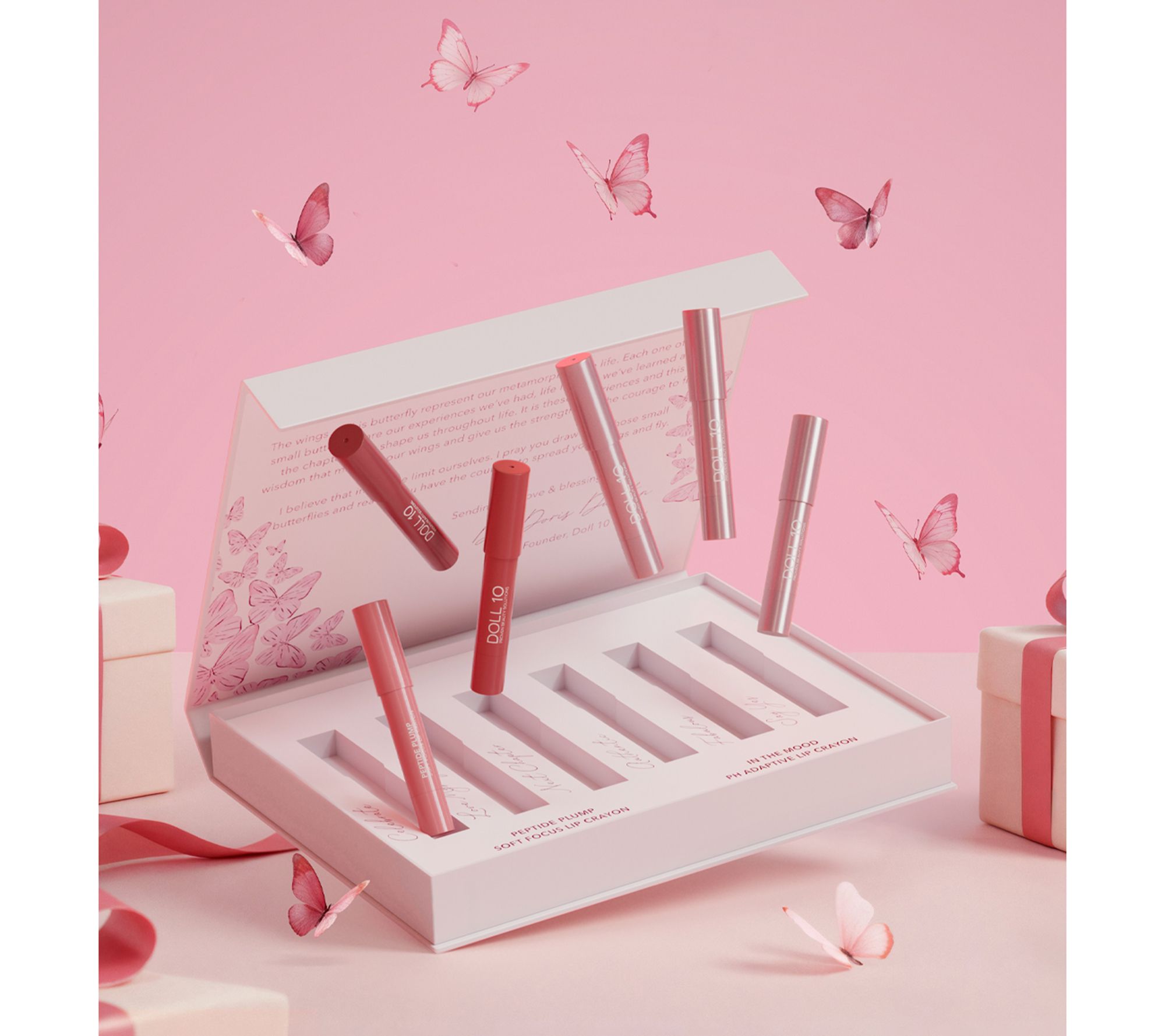 Caution: This will give you butterflies! Doll 10's Shades of Possibility six-piece Lip Crayon collection takes your lip look to new heights with three Peptide Plump Soft Focus shades and three brand new In the Mood pH Adaptive shades that temporarily hydrate, condition, and boldly color your lips. It's the must-have lip crayon library that looks good on every skin tone -- and every age!