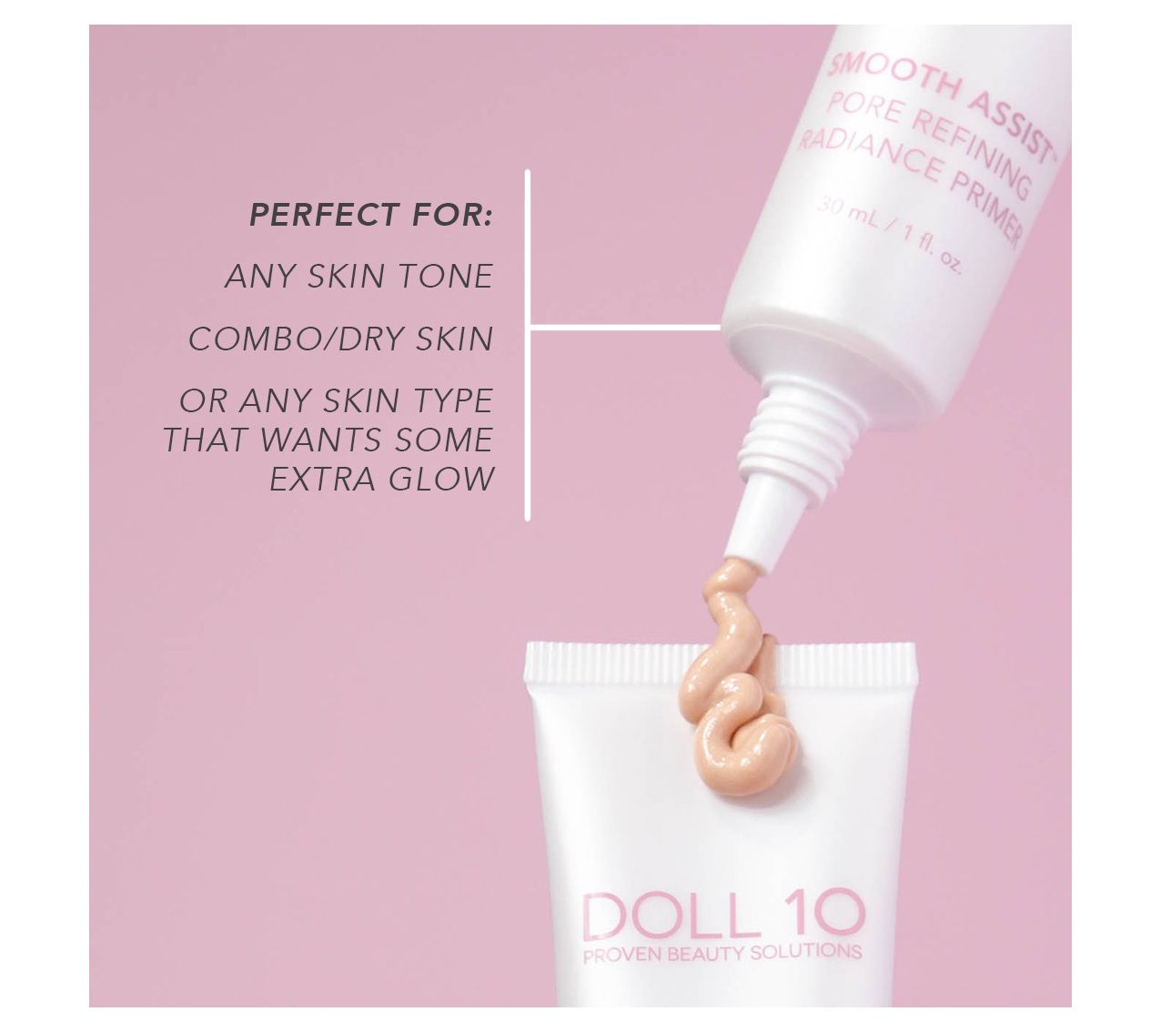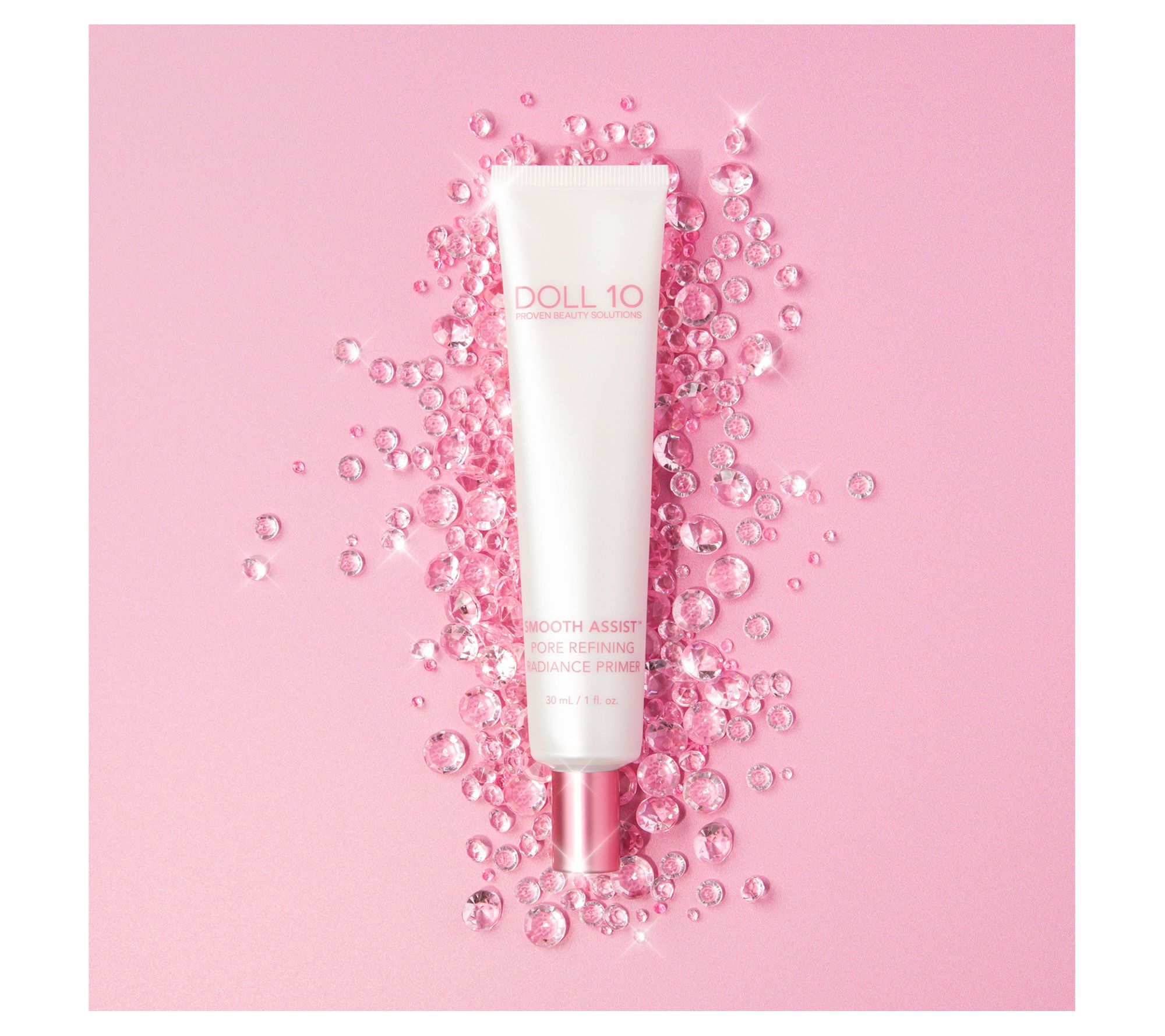 Discover a recipe for smoother, more radiant-looking skin! Doll 10 Beauty's Smooth Assist Pore Refining Radiance Primer immediately goes to work smoothing the look of skin texture, temporarily minimizing the appearance of pores and fine lines while adding subtle luminosity to the look of skin. It hydrates with a transparent, radiant-looking finish.