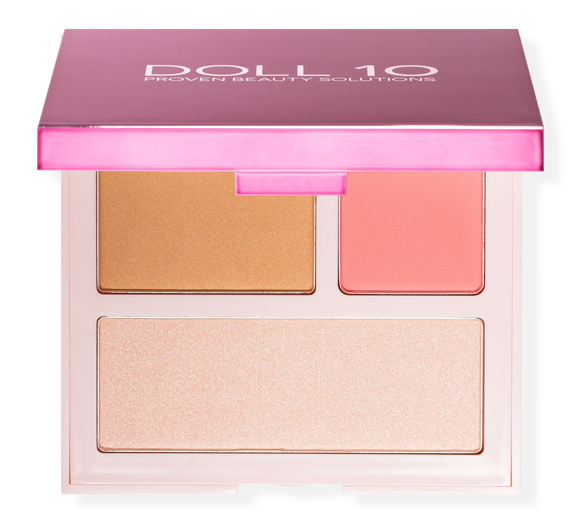 This multitasking full-face palette from Doll 100 features shades to highlight, blush, bronze, and define in new sultry shades. The micro-pixel blurring powder works to brighten and reduce the appearance of uneven skin tones, large pores, redness, fine lines, and wrinkles while complementing and enhancing your skin. Doll 10 is a QVC® Clean Beauty brand. Cruelty-free.