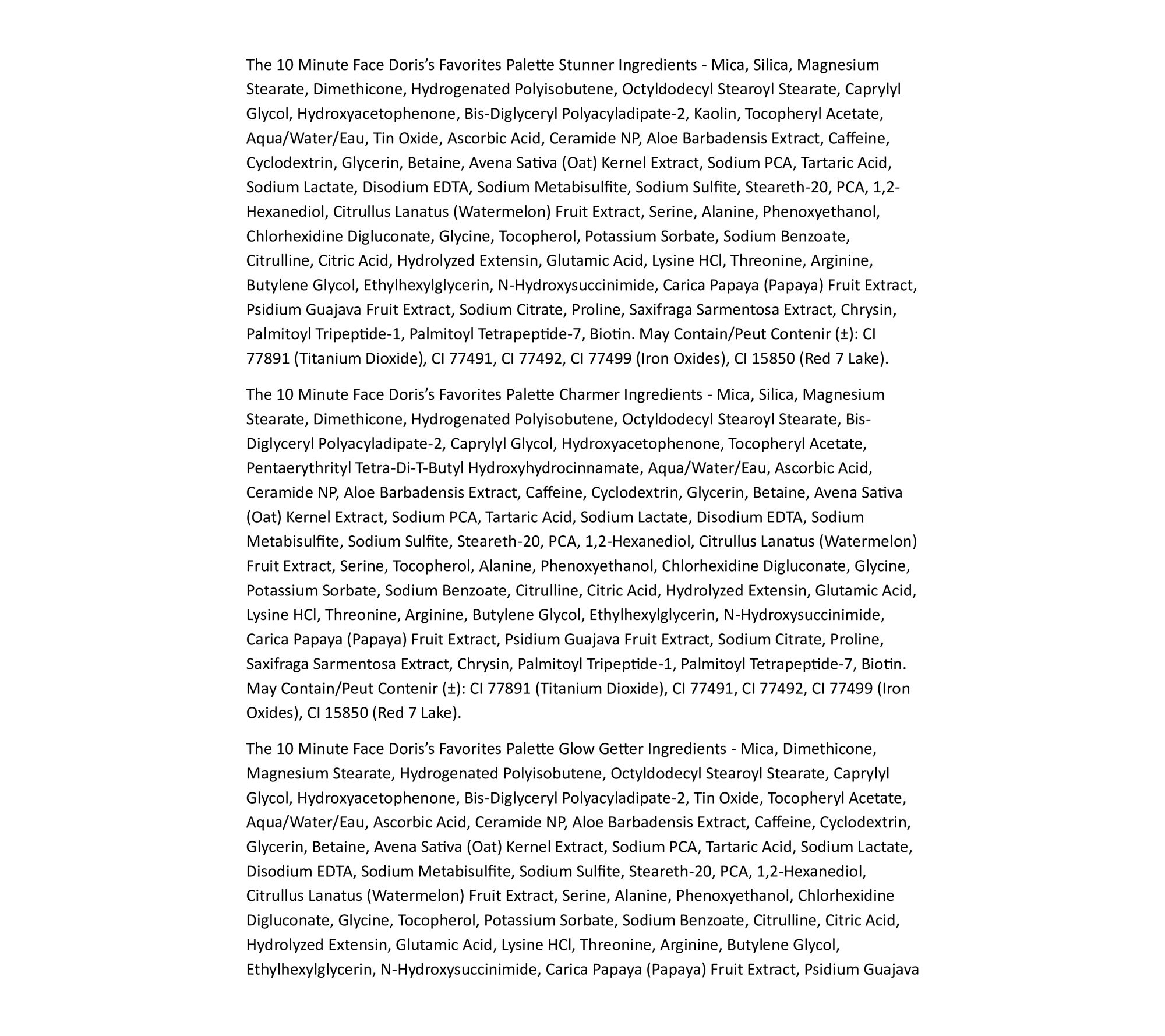 Includes the 10 Minute Face Doris's Favorites Palette with 0.20-oz bronzer, 0.18-oz blush, and 0.24-oz highlighter