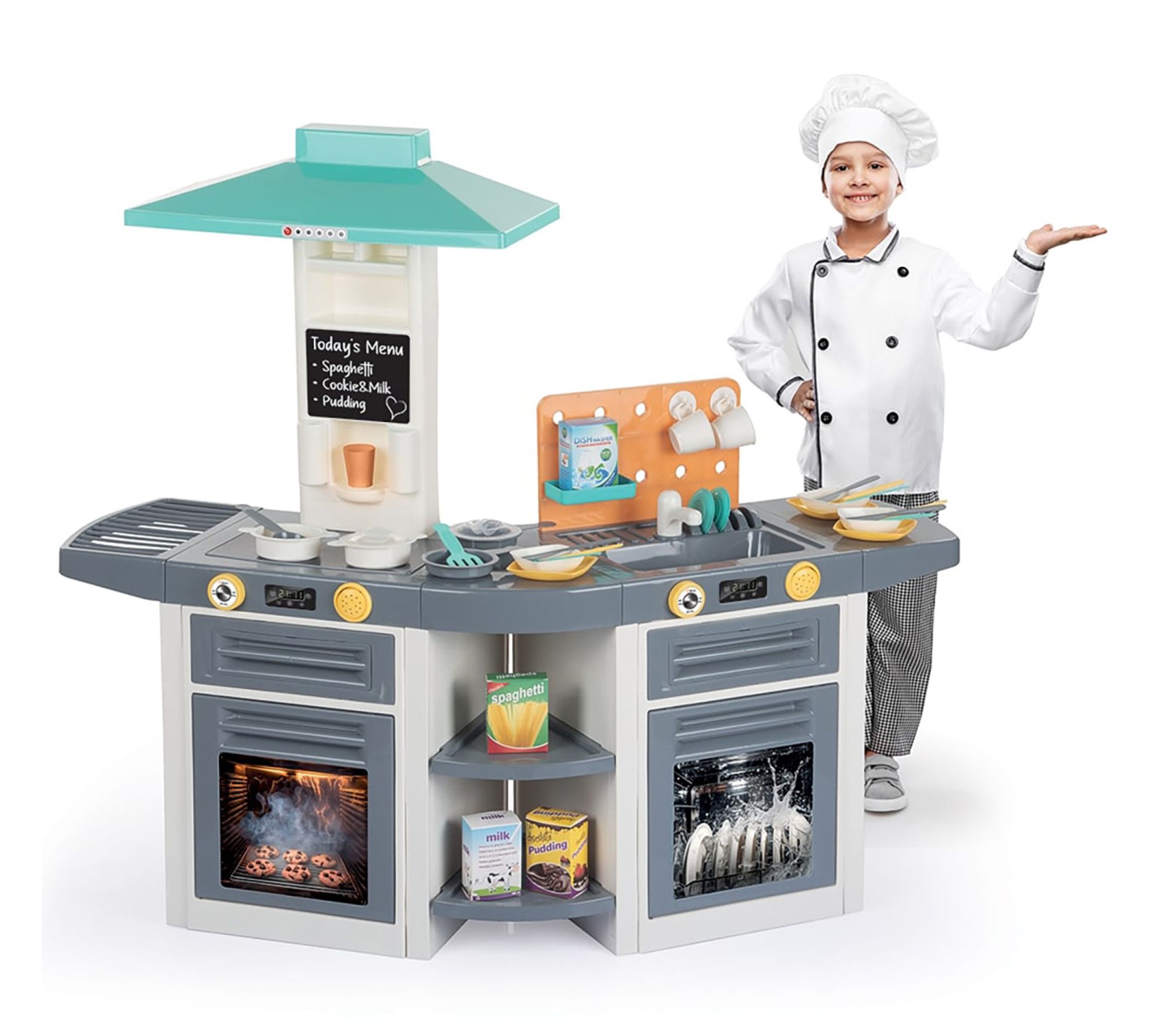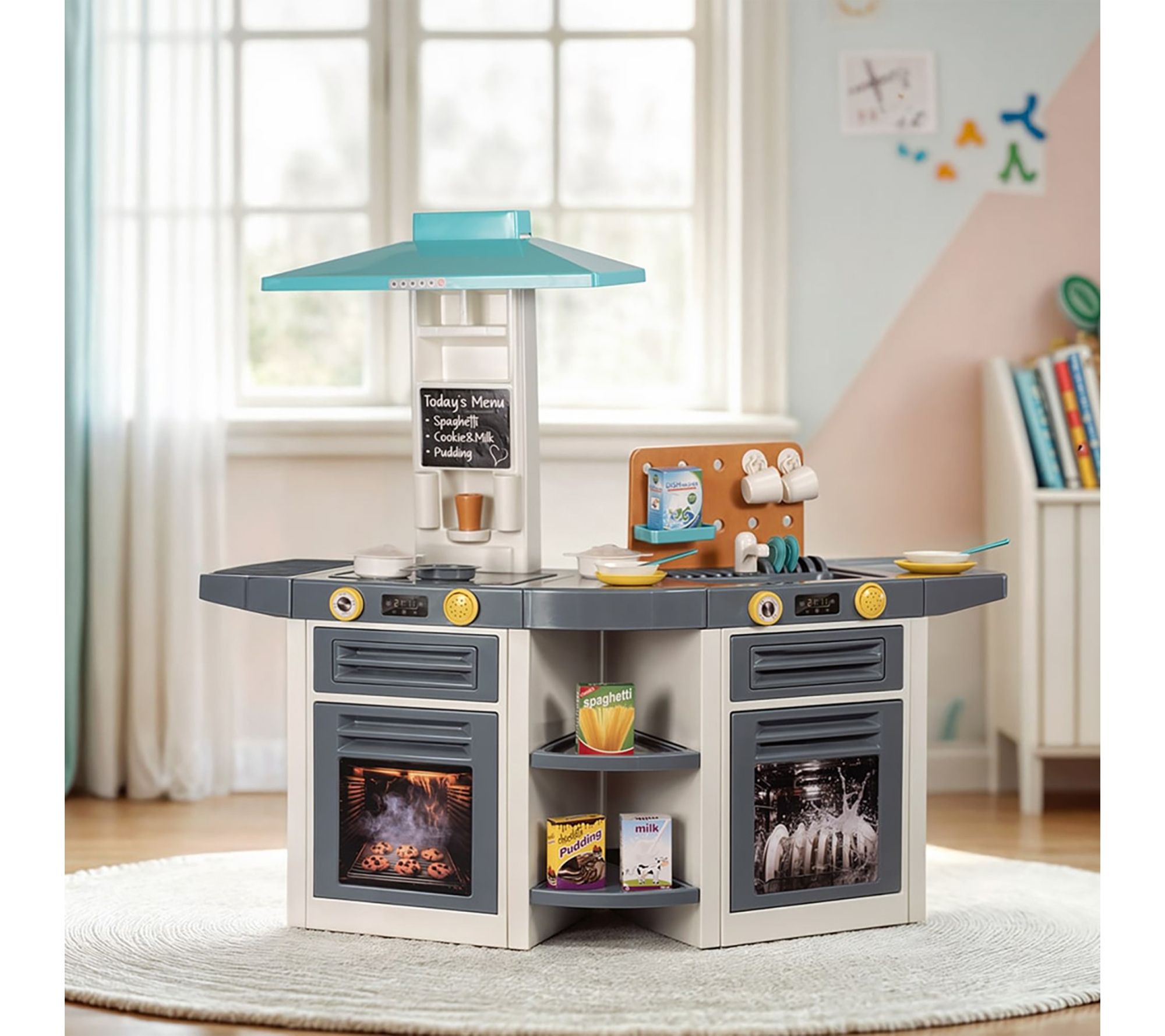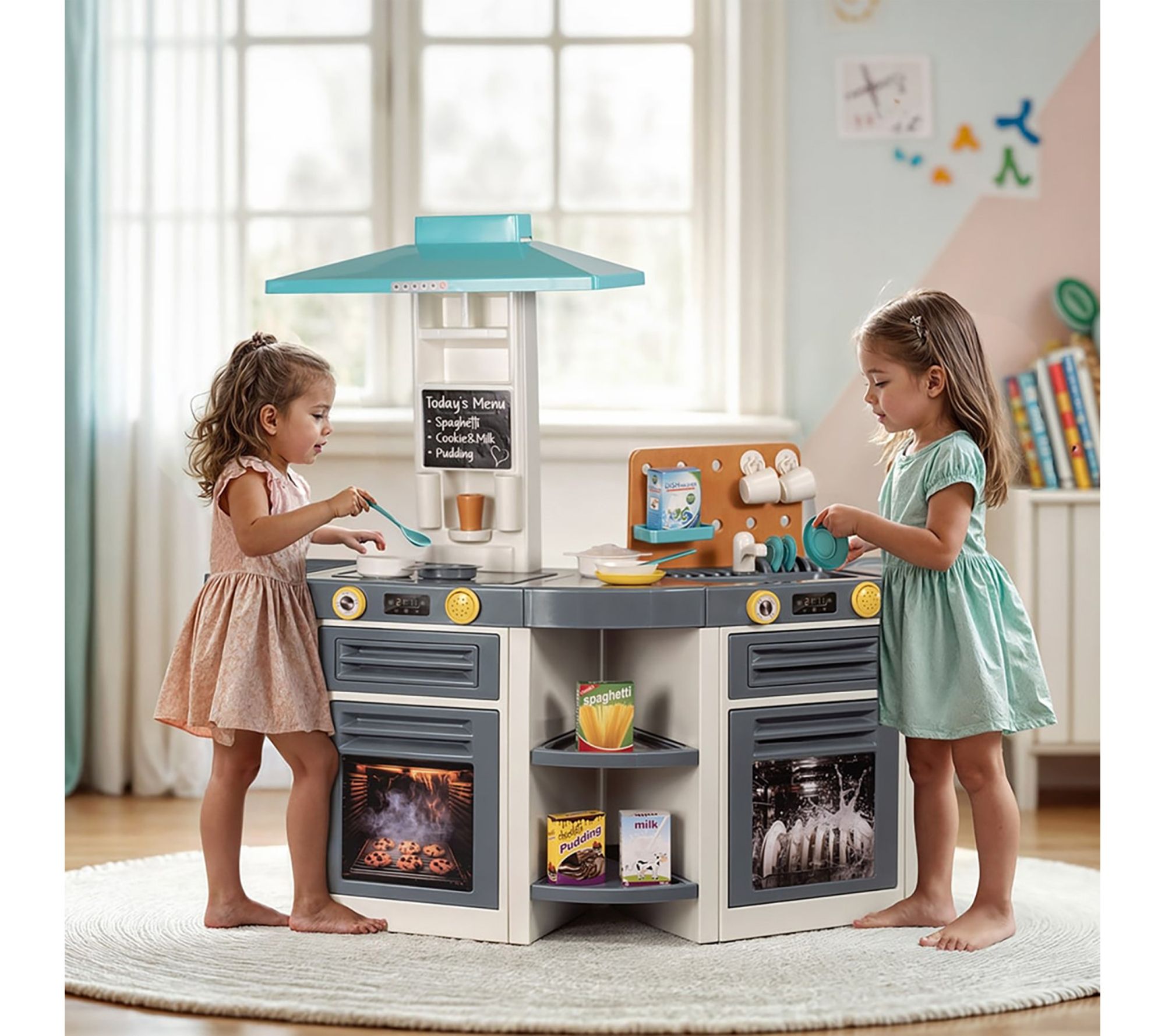 From spirited indoor cooking sessions to backyard gatherings, this XL Kitchen Playset brings endless possibilities for hands-on learning and social fun. Featuring a standing oven and dishwasher with sound effects, it invites little ones to whip up imaginative feasts, serve meals, and tidy up with a full set of 37 toy cooking accessories. Encourage creativity and cooperation while kids create memories with every make-believe meal. From Dolu.