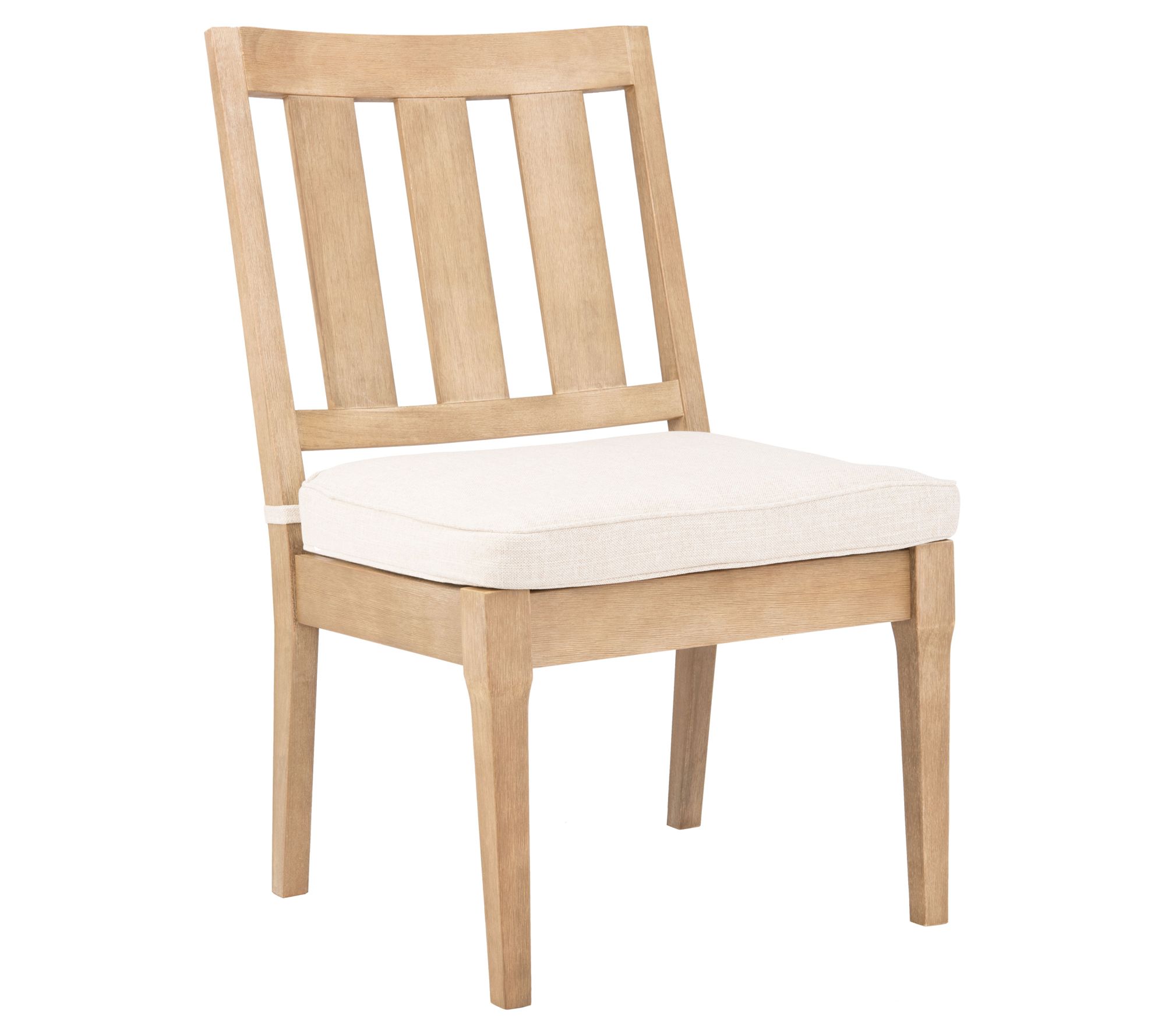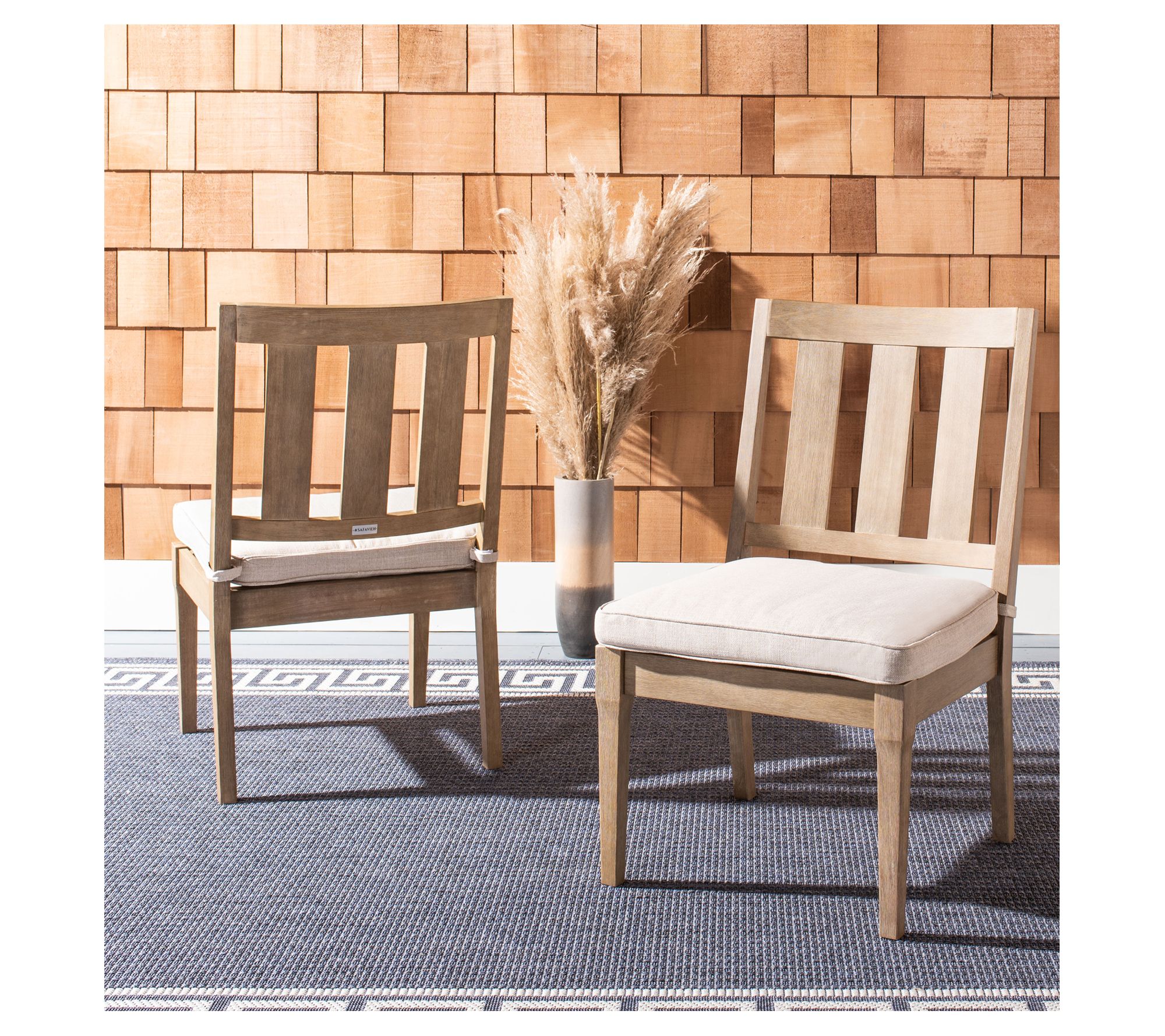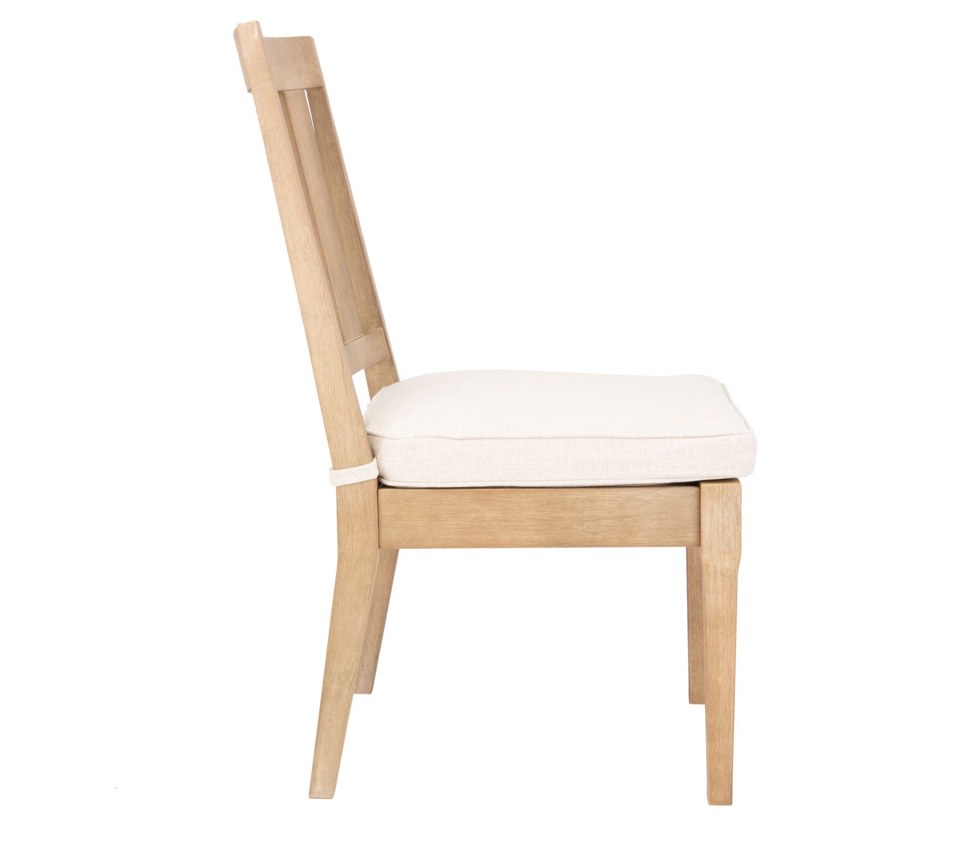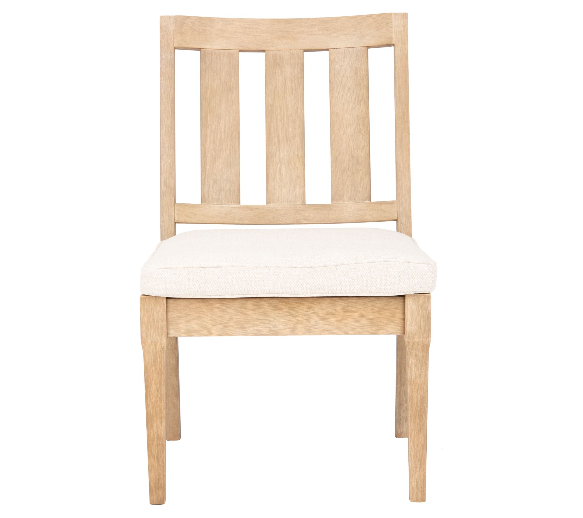 Transform your outdoor dining experience with the Dominica Outdoor Dining Chairs by Valerie. These beautifully crafted chairs feature a slatted back that offers a relaxed, coastal vibe while maintaining an elegant design. Made from durable eucalyptus wood and finished in a natural hue, each chair includes a plush, polyester cushion for added comfort, perfect for enjoying meals or conversations al fresco. Sold as a set of two, these chairs blend style and functionality effortlessly for your patio or garden. From Valerie.
