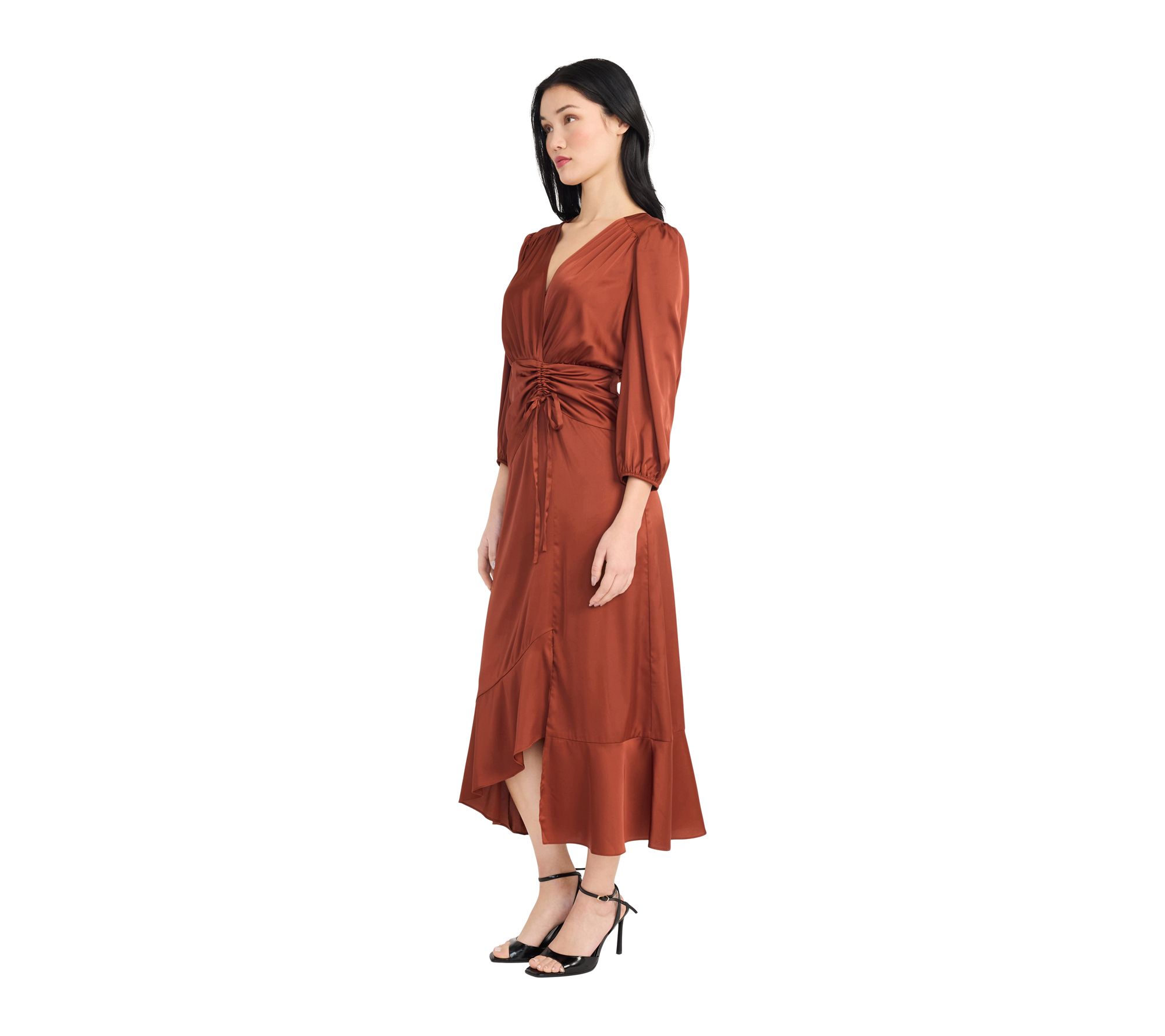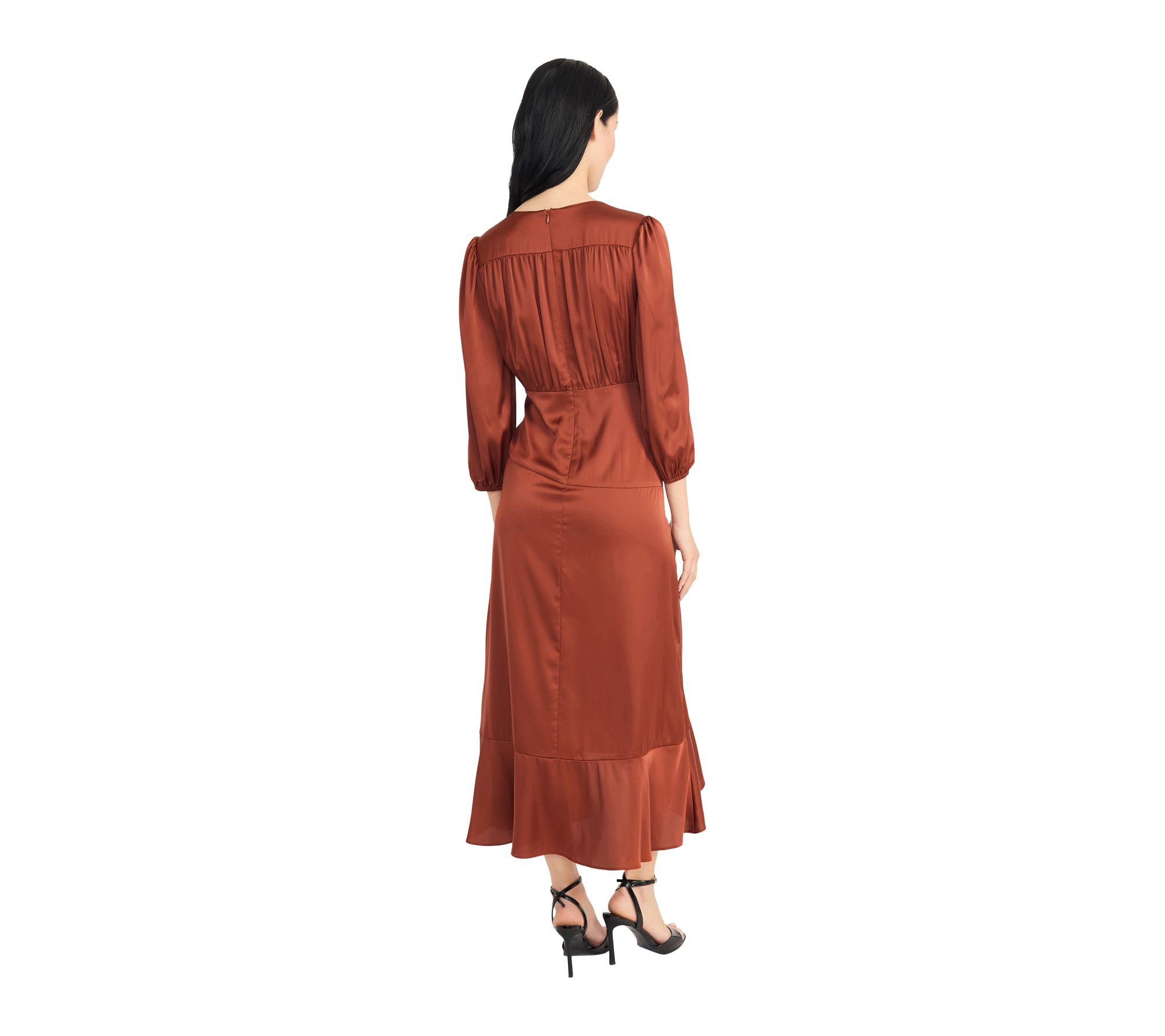 • Features: V-neckline, 3/4-length sleeves, ruffled hem, midi length