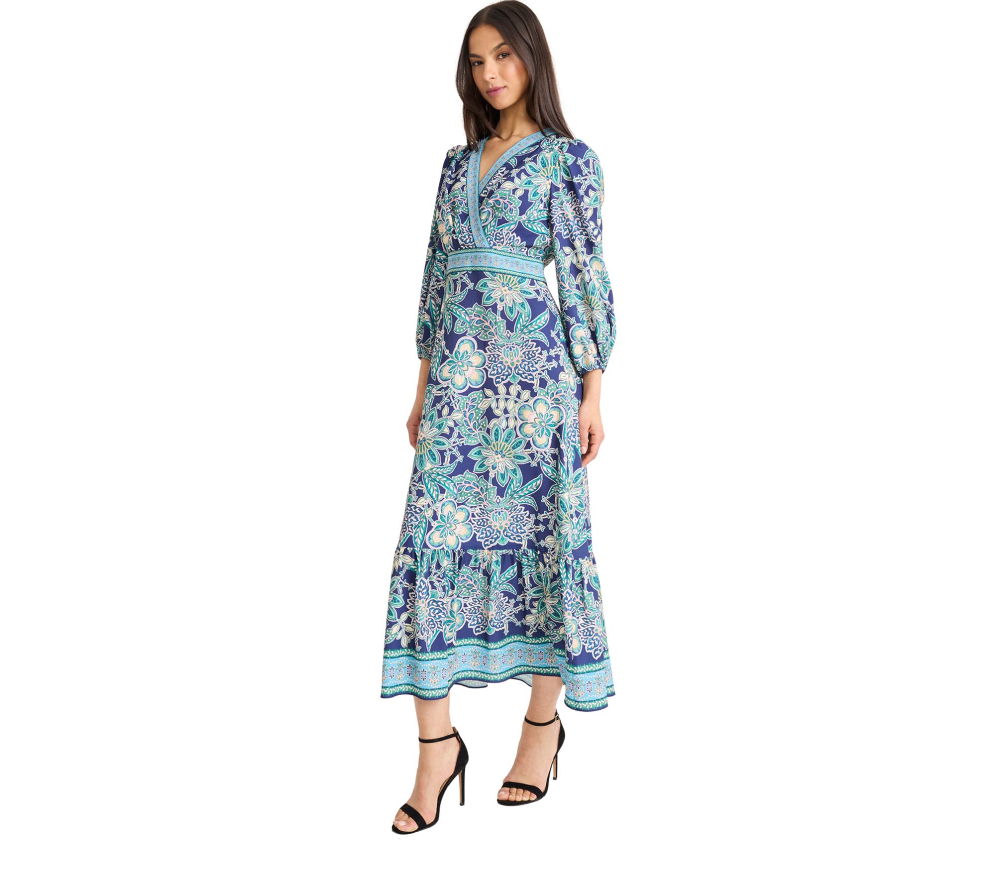 • Features: allover floral print, fit-and-flare style, V-neckline, 3/4-balloon sleeves, midi length