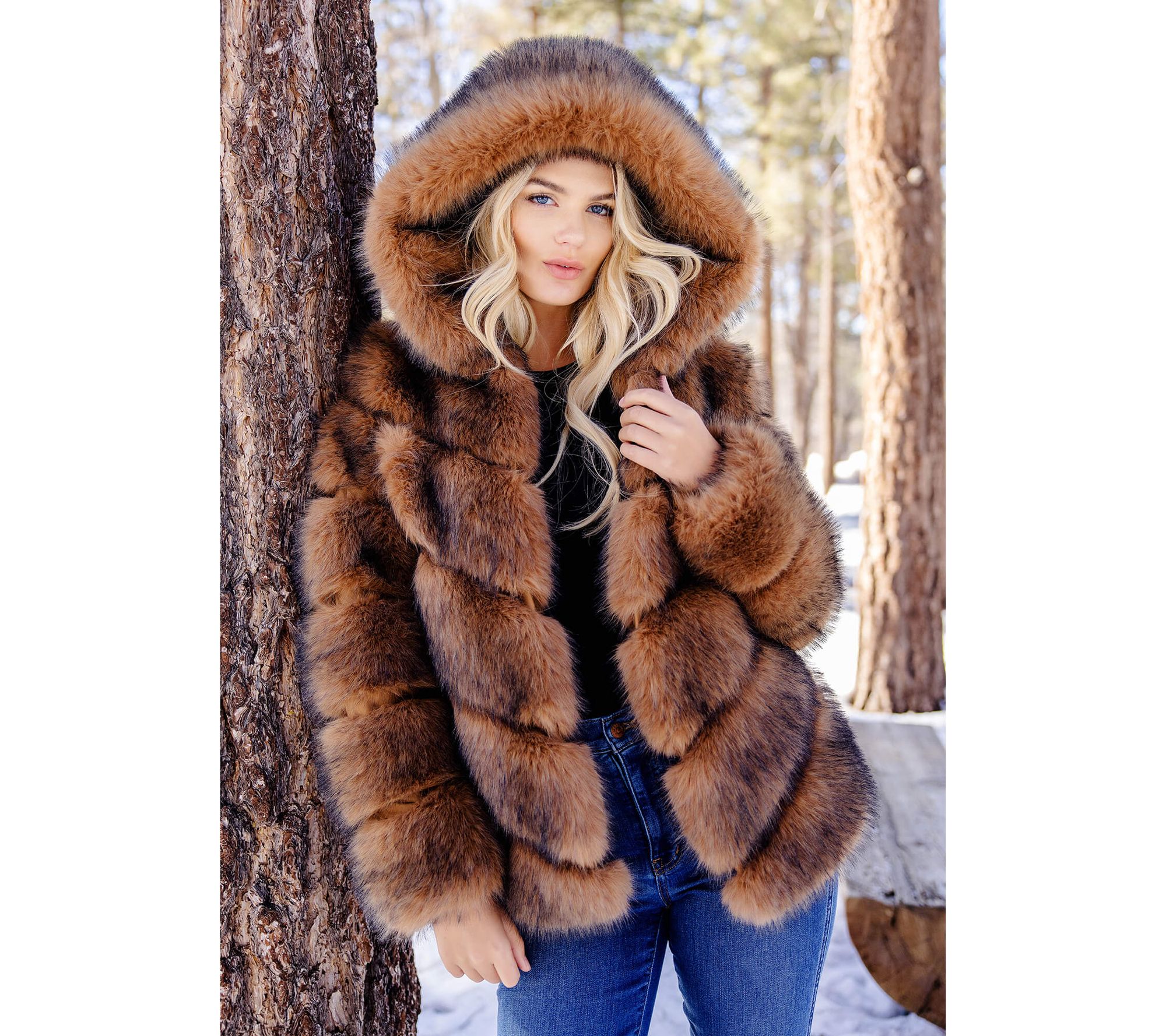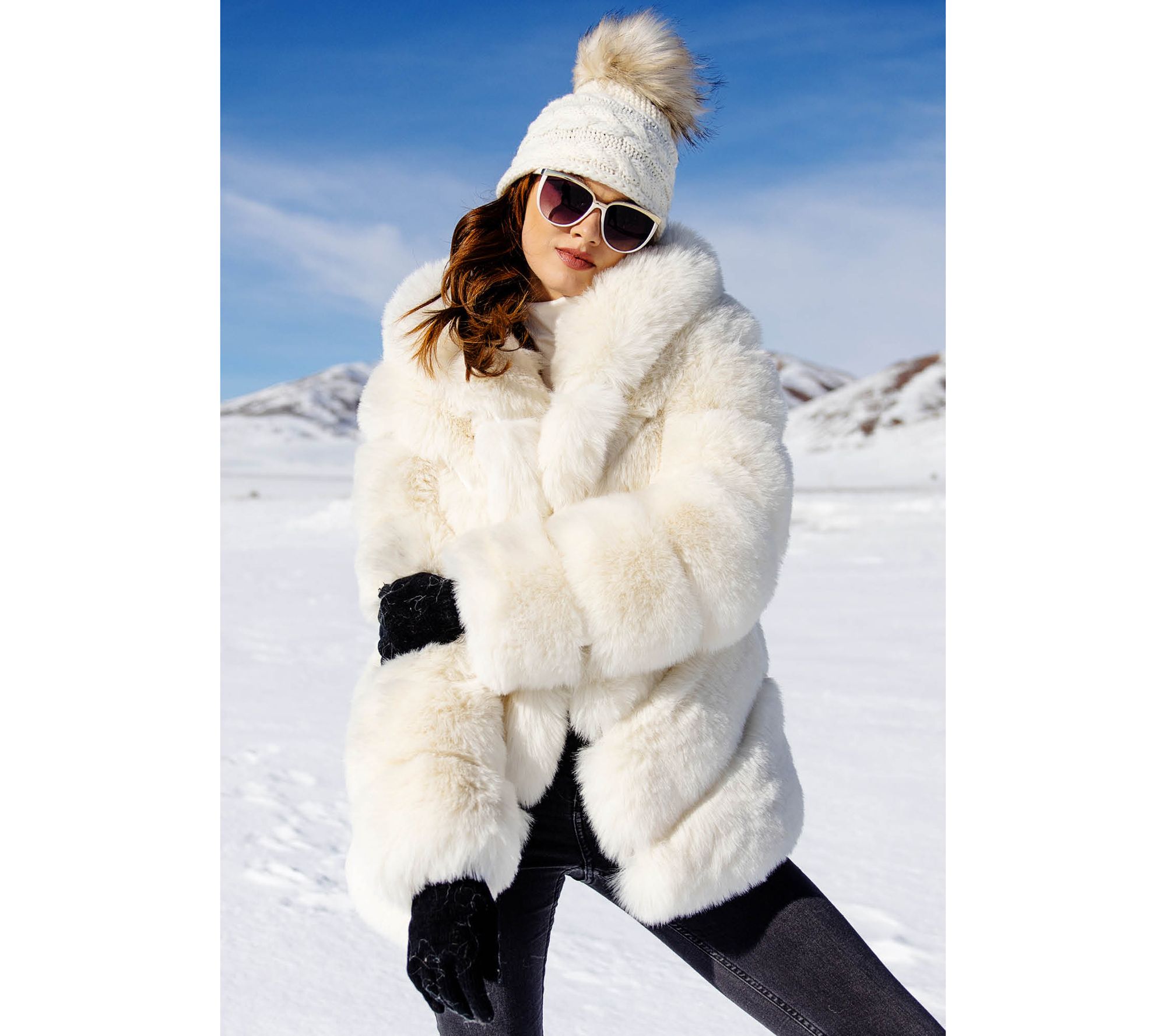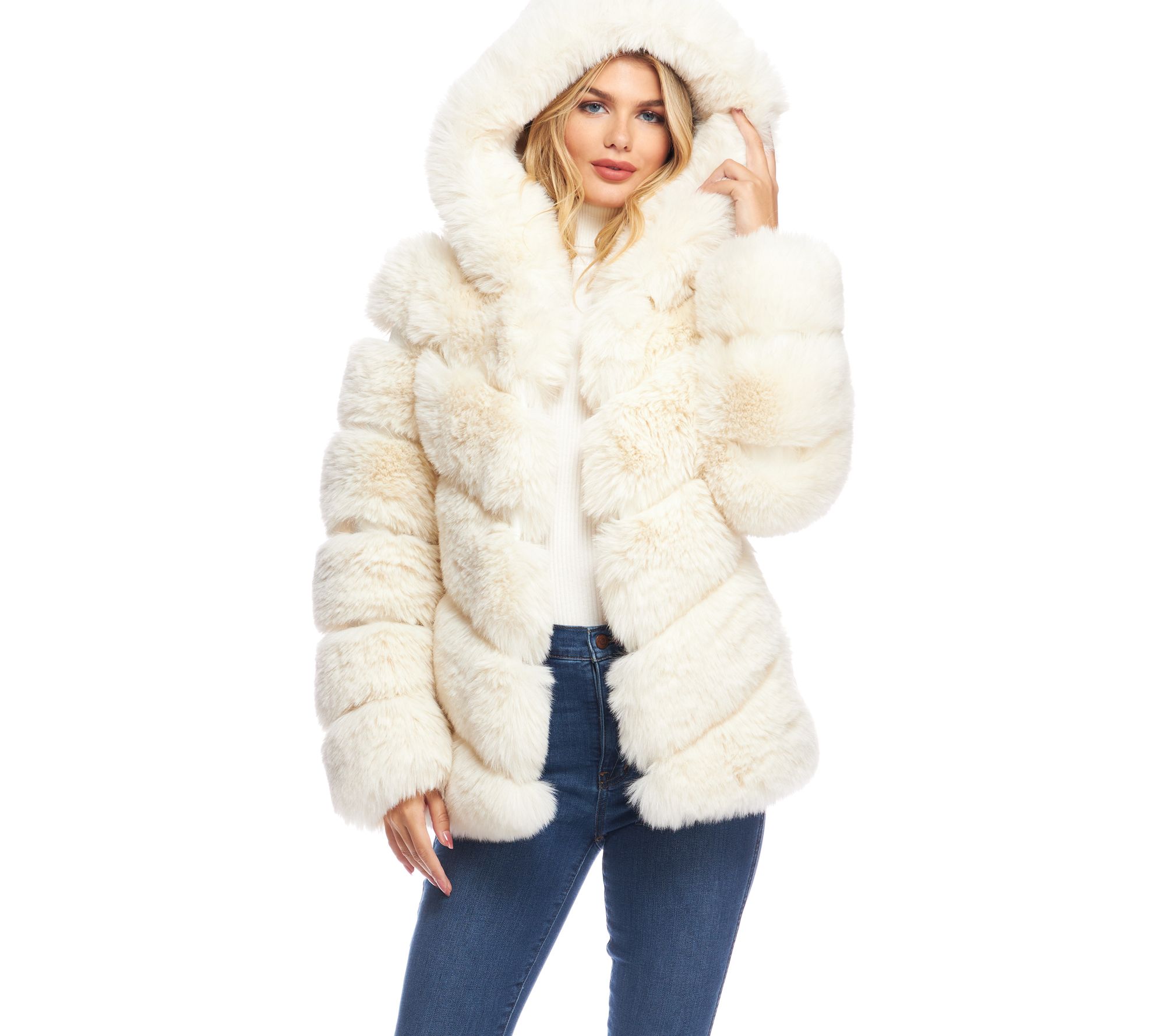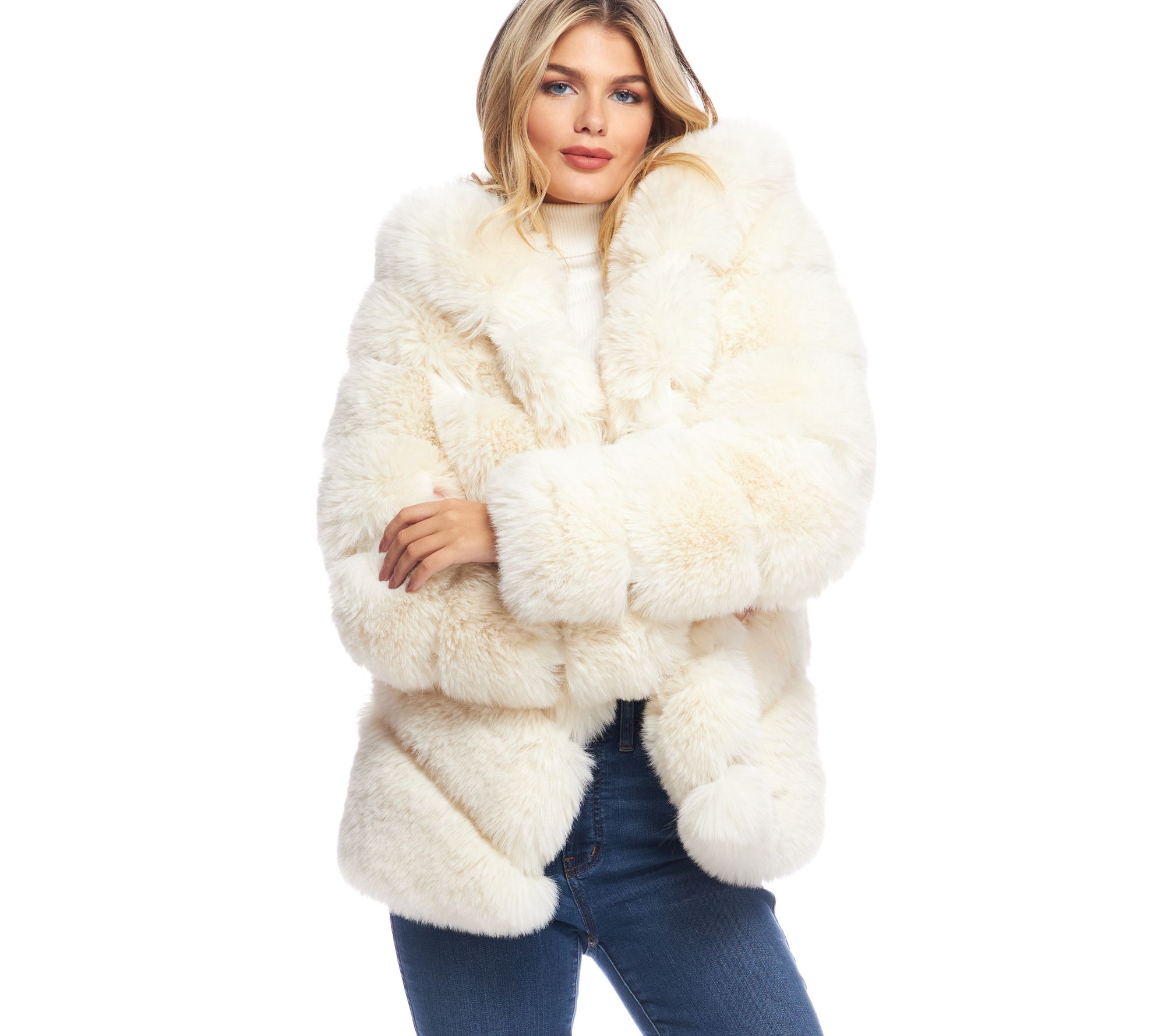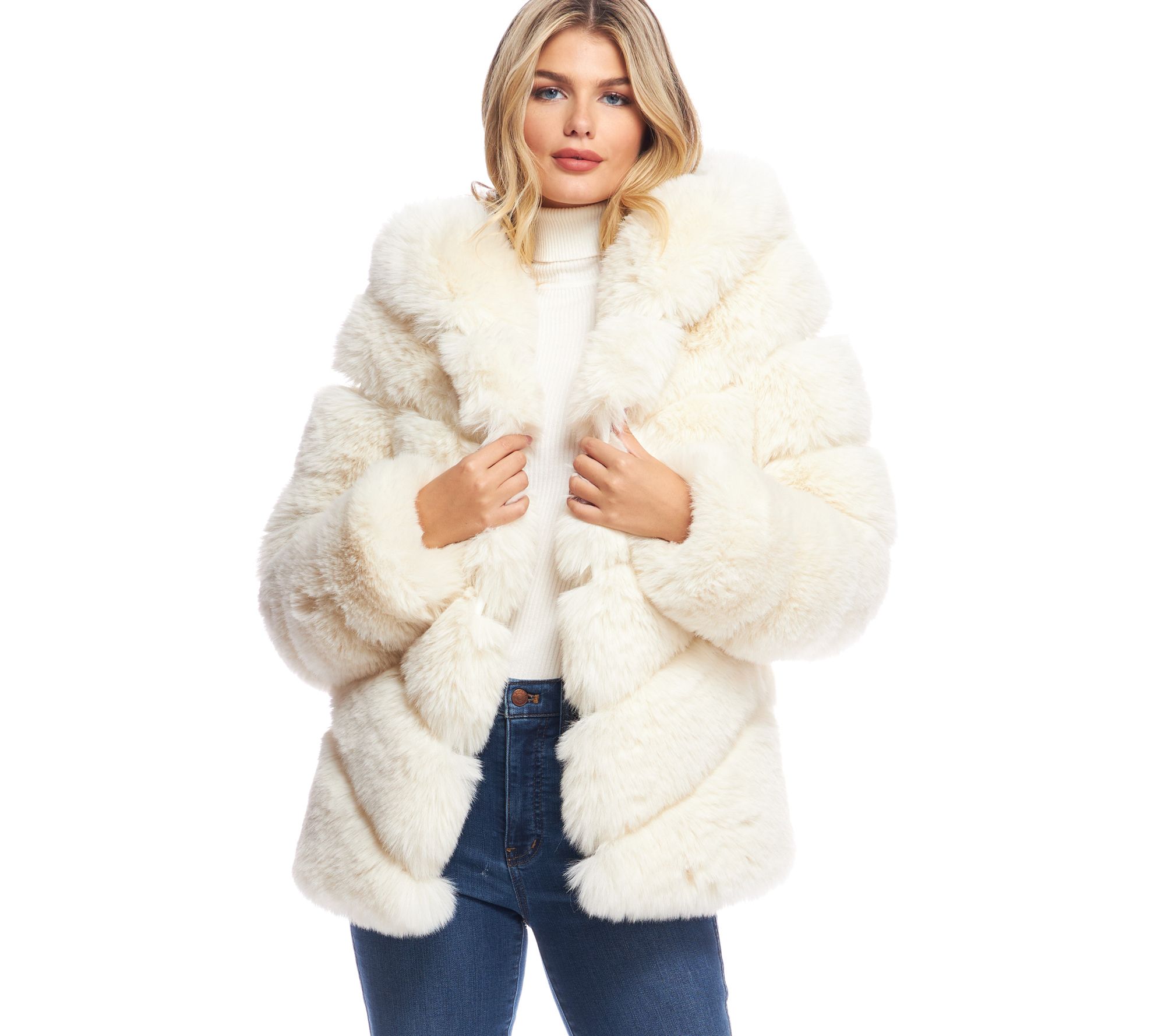 Stay warm and stylish with the Donna Salyers Fabulous Furs chateau chevron faux fox coat. This hip-length parka features a luxurious satin-lined hood and body, along with velvet-lined pockets for added comfort. From Donna Salyers Fabulous Furs.