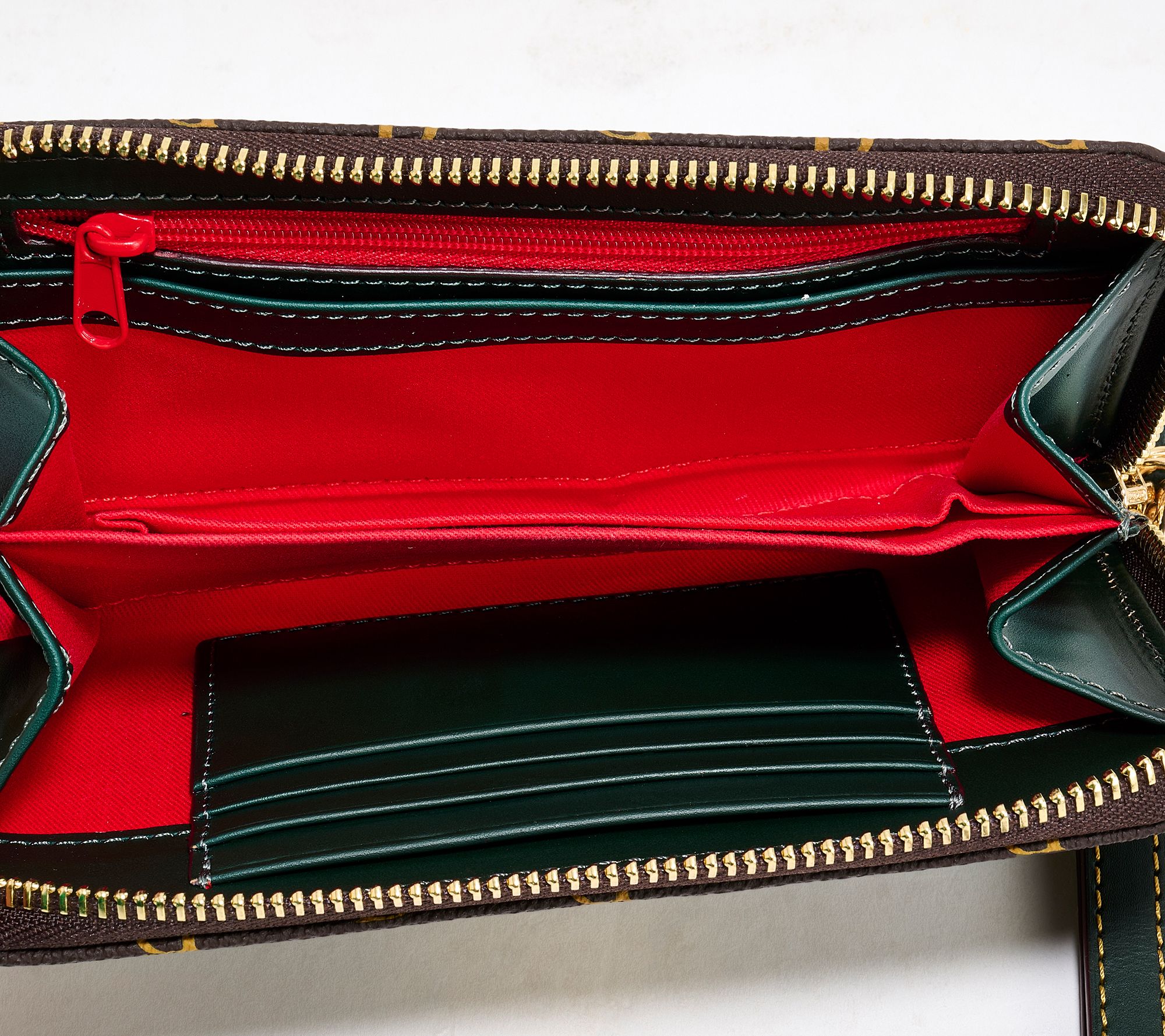 Lined interior, inside zip pocket, four inside slip pockets, seven card slot compartments