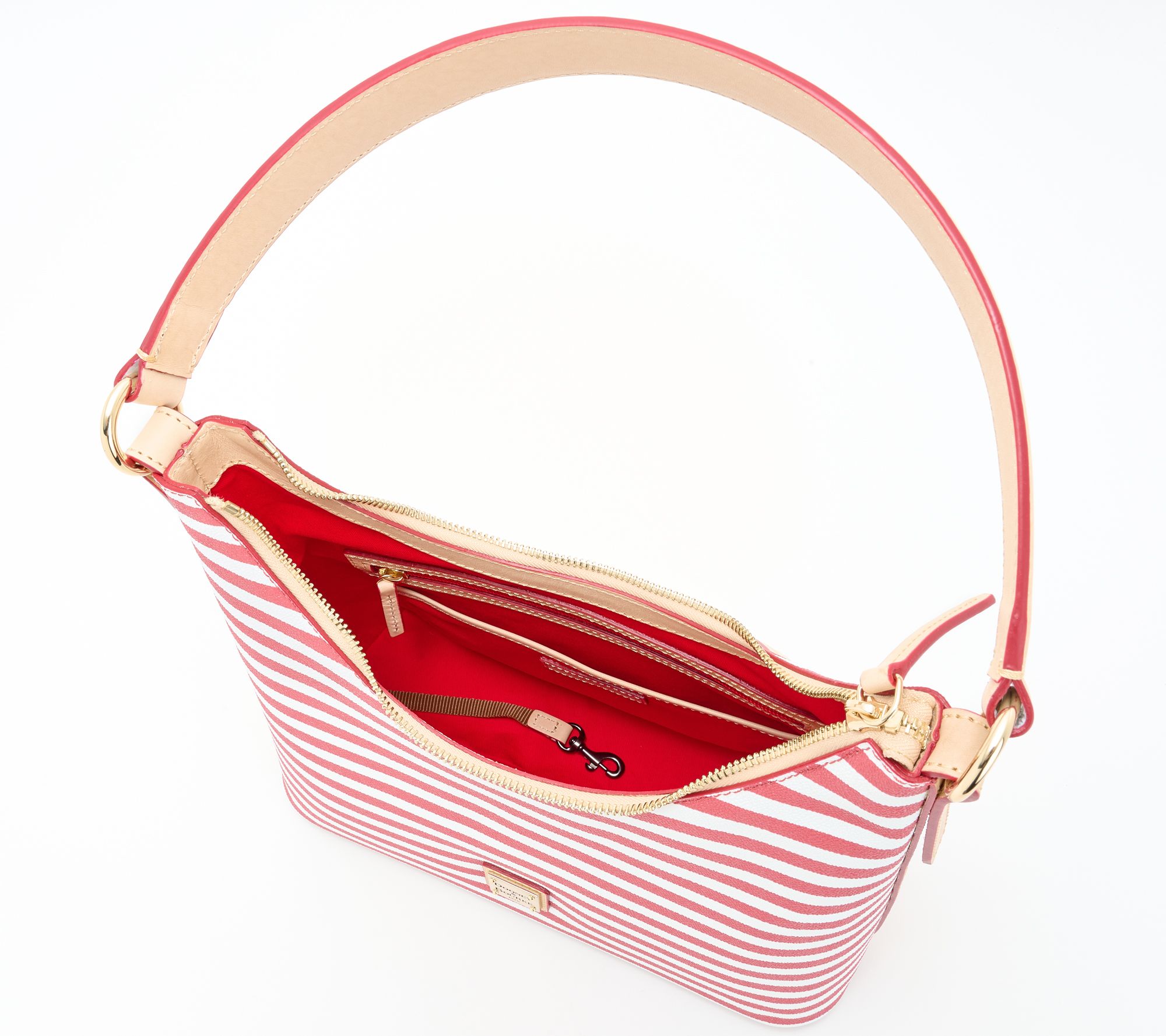 When your schedule keeps you on the move, this hobo is ready to tag along with easy style. Sophisticated leather trim and understated details lend a polished vibe for wherever the day leads. From Dooney & Bourke.