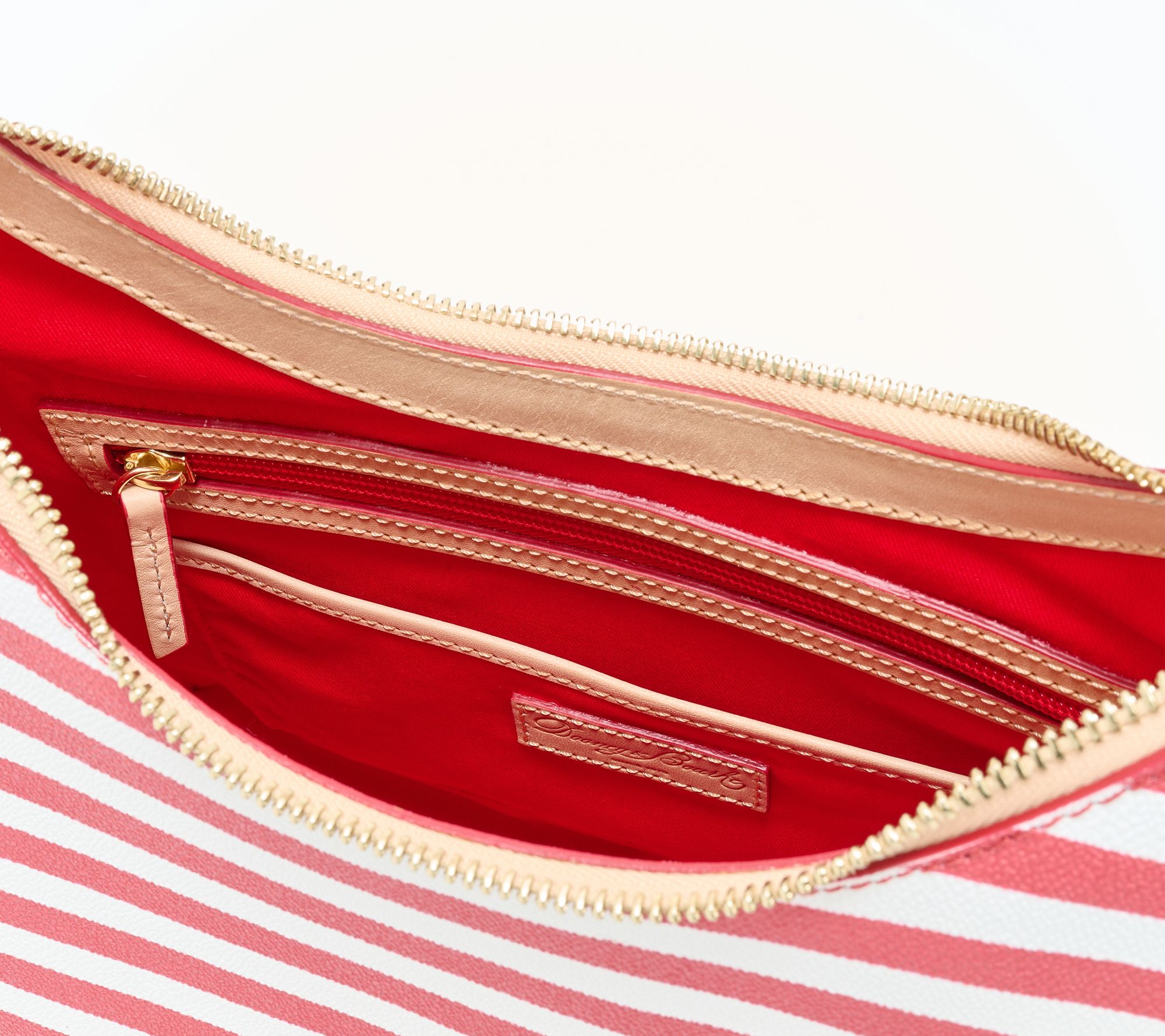 Lined interior, front-wall zip pocket and slip pocket, two back-wall slip pockets, key hook
