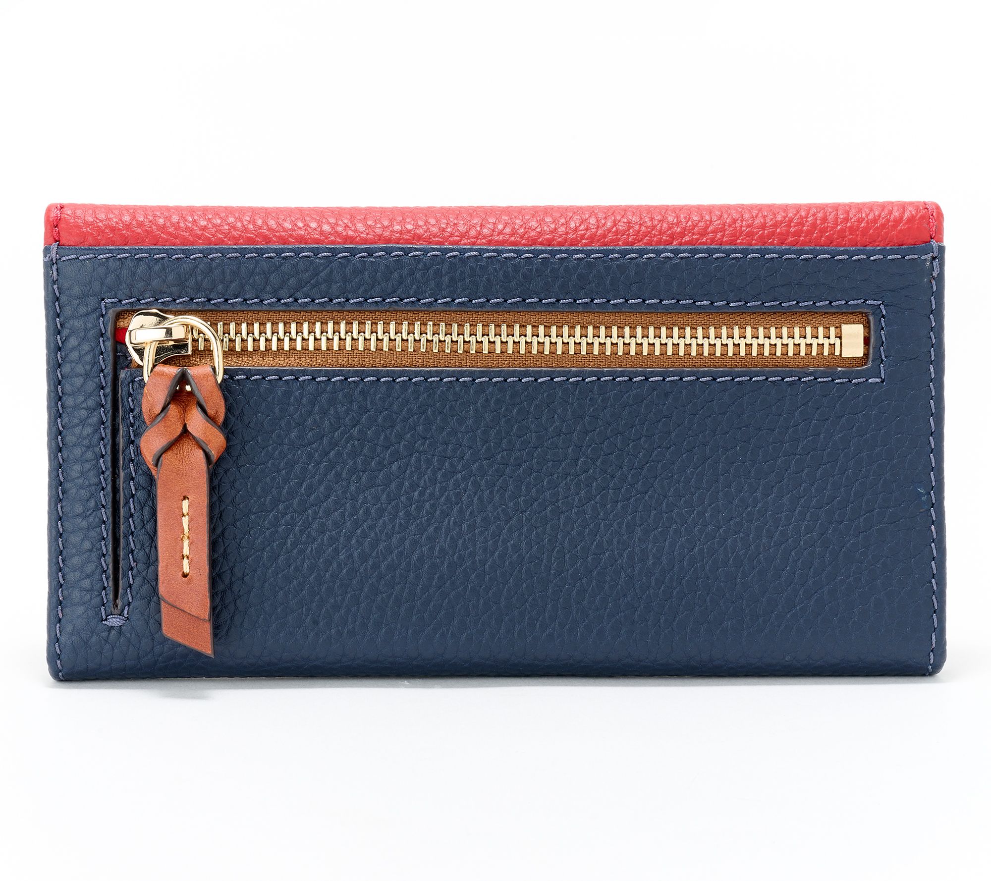 Carry this gorg little clutch on its own, or throw it into a larger bag when you're on the go. With just the right room to hold your cards and cash, the colorblocked pebble leather style is ready for transcontinental adventuring -- and ditching the bulk! So clutch. From Dooney & Bourke.
