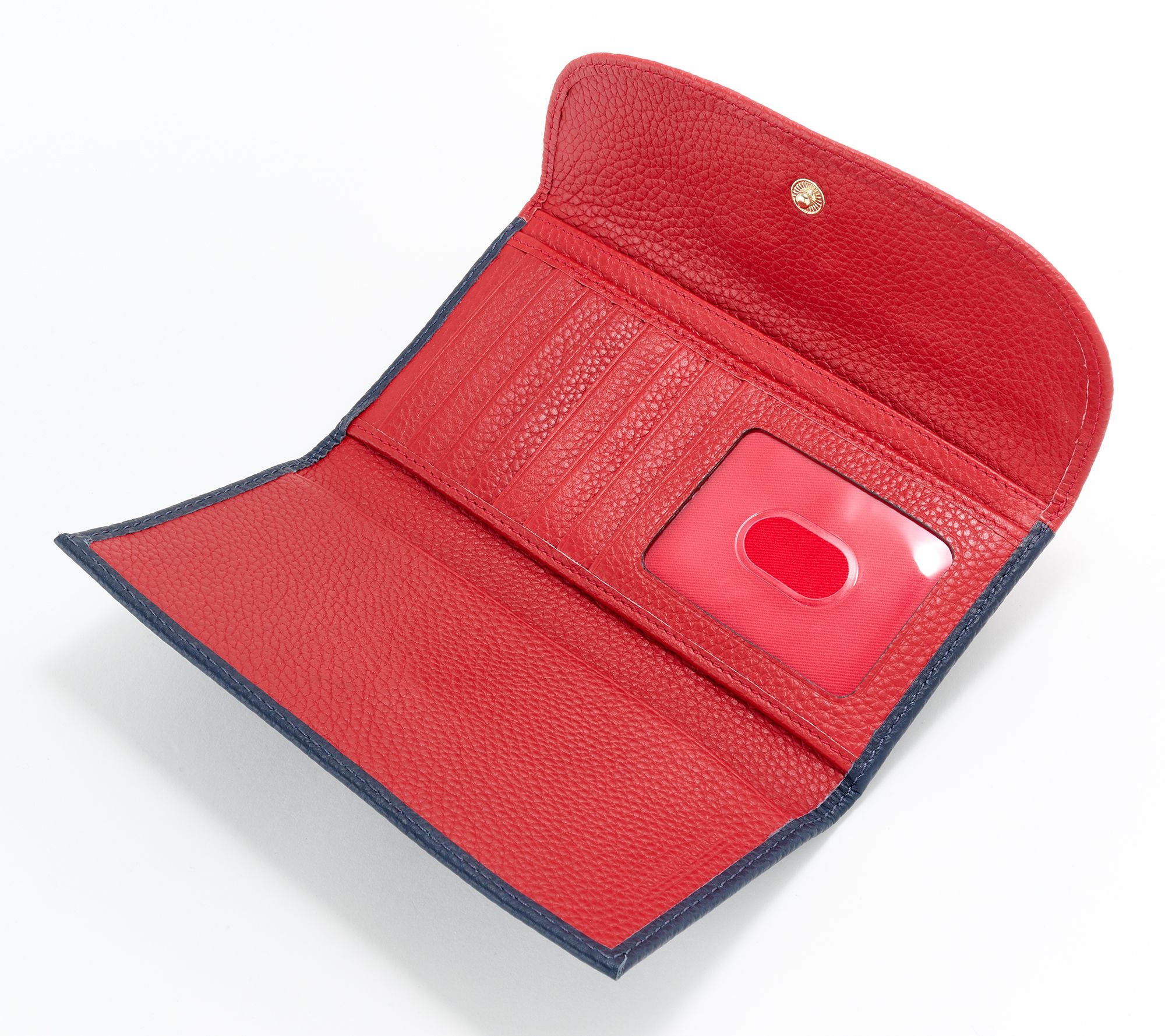 Pebble leather body, colorblock design, continental silhouette, flap with snap closure, back zip pocket, metal-plated logo